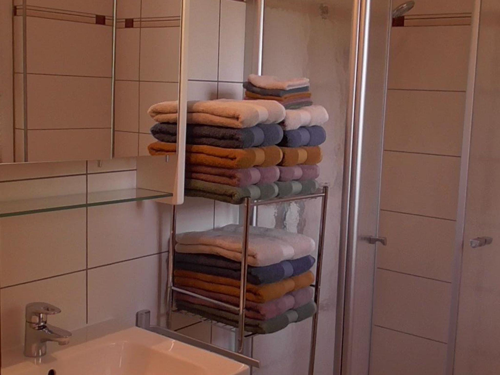 Das Bad hat eine Dusche, WC und einen Waschtisch. Außerdem sind genügend Handtücher und Badetücher vorhanden.