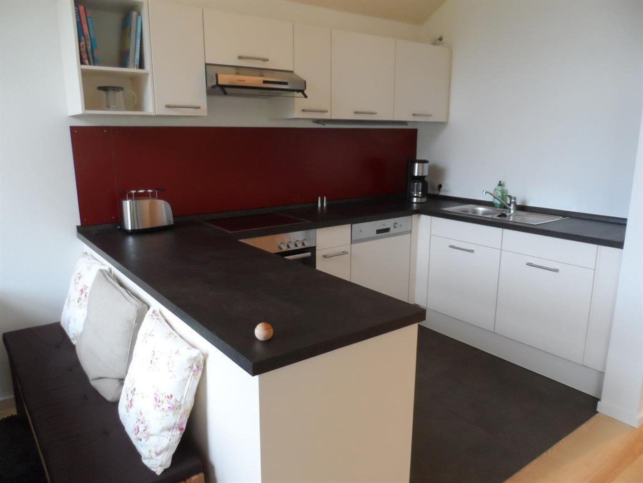 Die Küche ist zum Ess- und Wohnbereich hin offen. Sie ist ausgestattet mit E-Herd, Kühlschrank, Geschirrspülmaschine, Kaffeemaschine, Toaster und Wasserkocher. Eine Waschmaschine steht ebenfalls zur Verfügung.