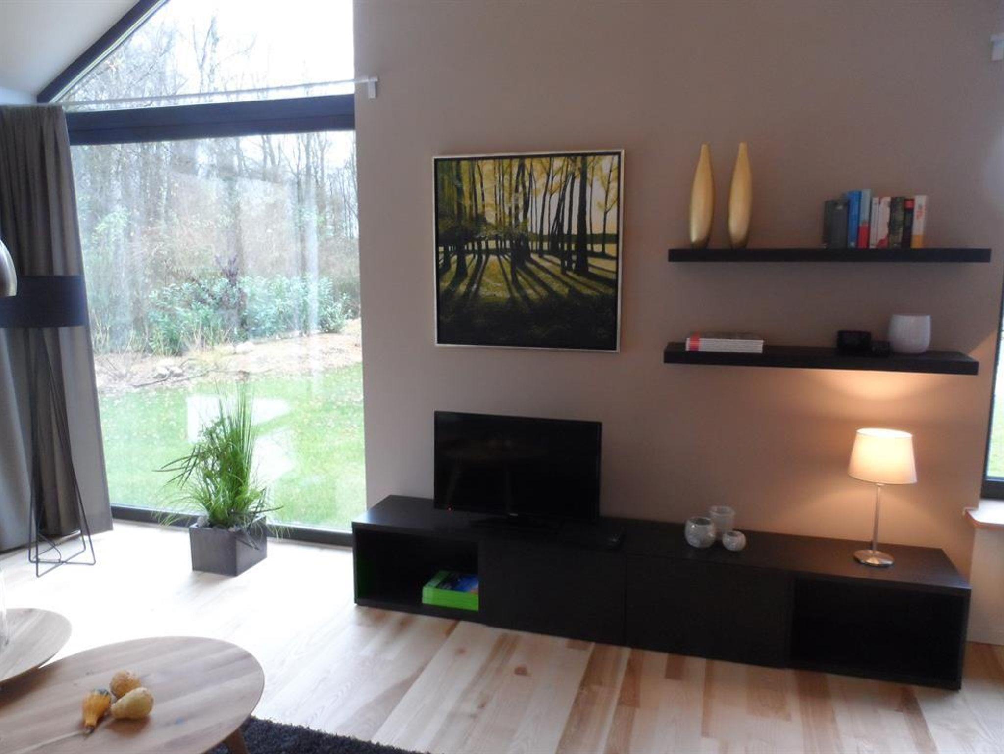 Das Wohnzimmer ist sehr stilvoll mit modernen Möbeln eingerichtet und verfügt über einen Fernseher und eine Musikanlage.