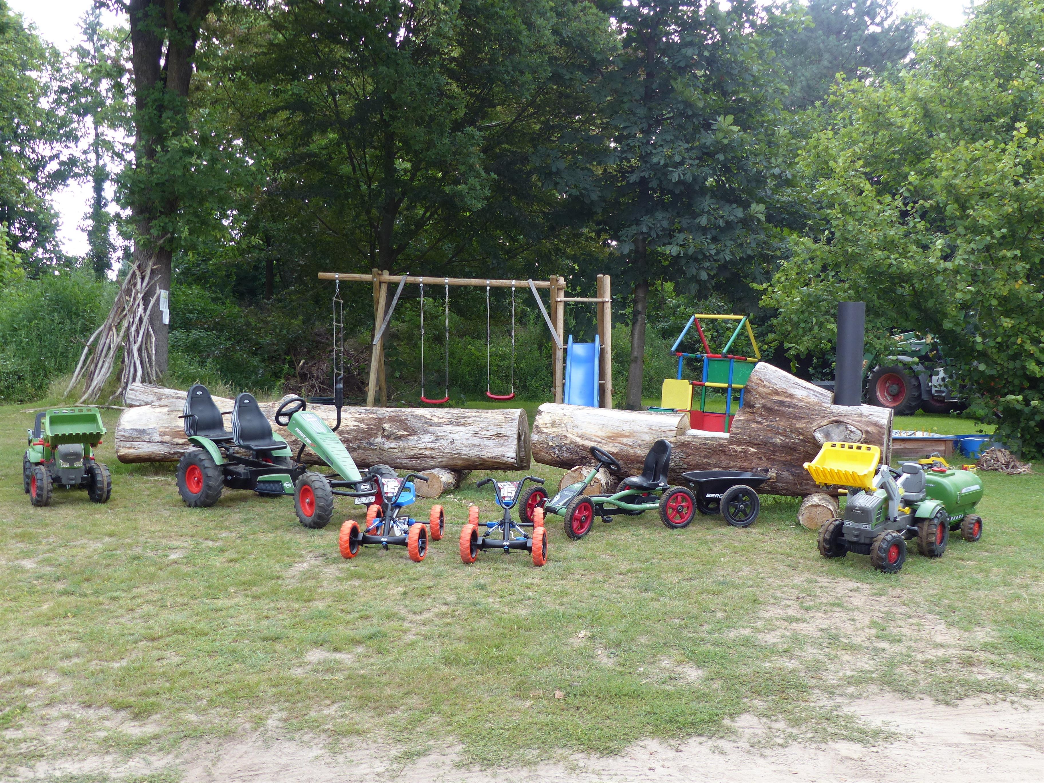 Für die Kinder gibt es Spielgeräte, Sandkiste und viele Fahrzeuge von Berg (Kettcars für jede Altersgruppe) sowie Trecker mit Anhänger und Güllefass.