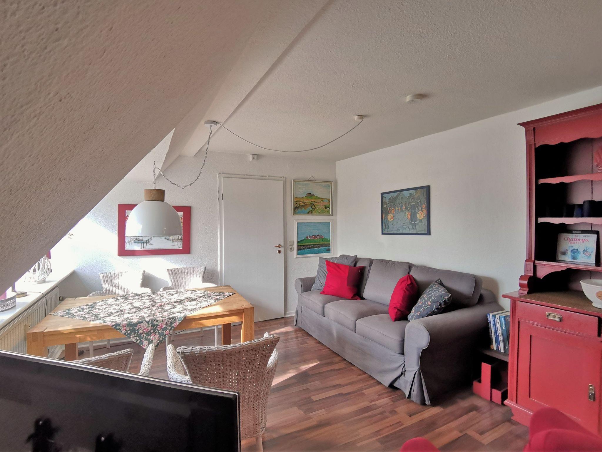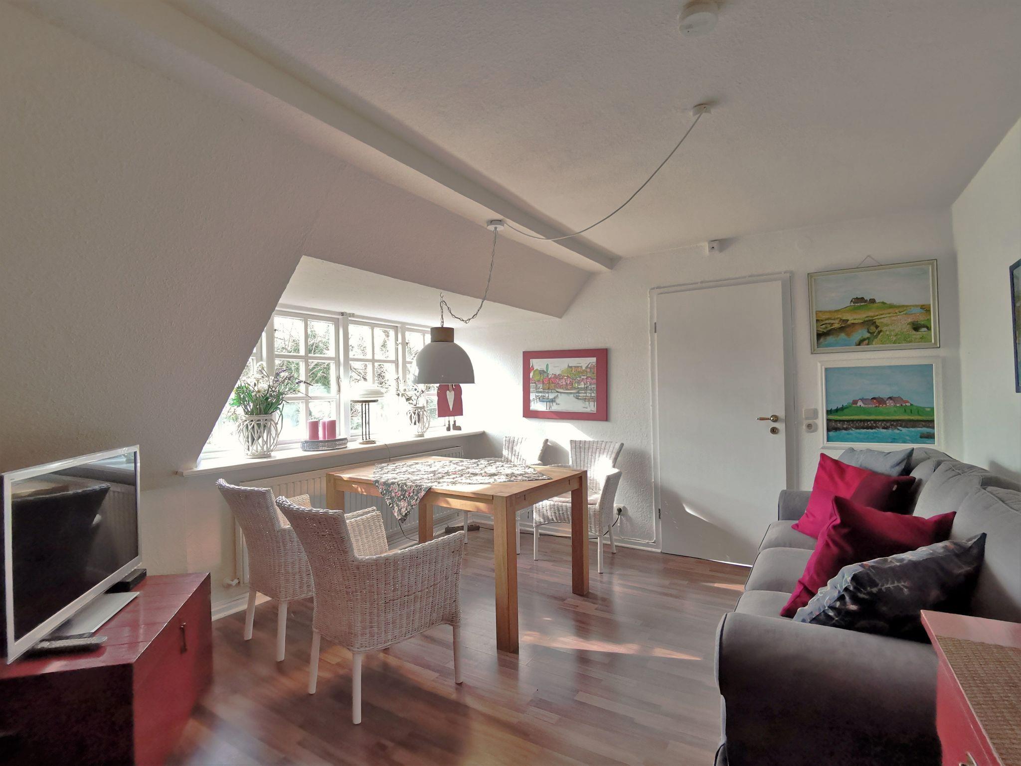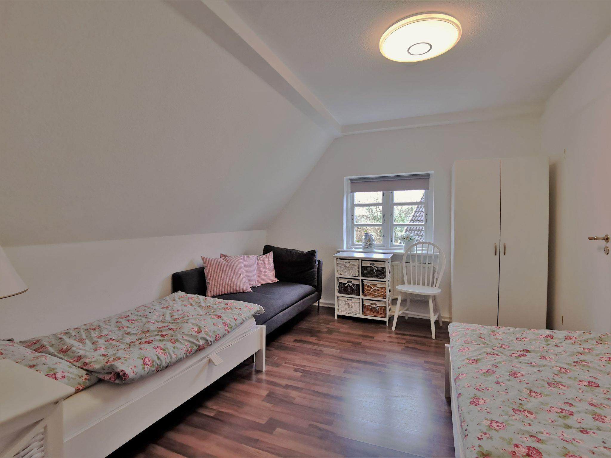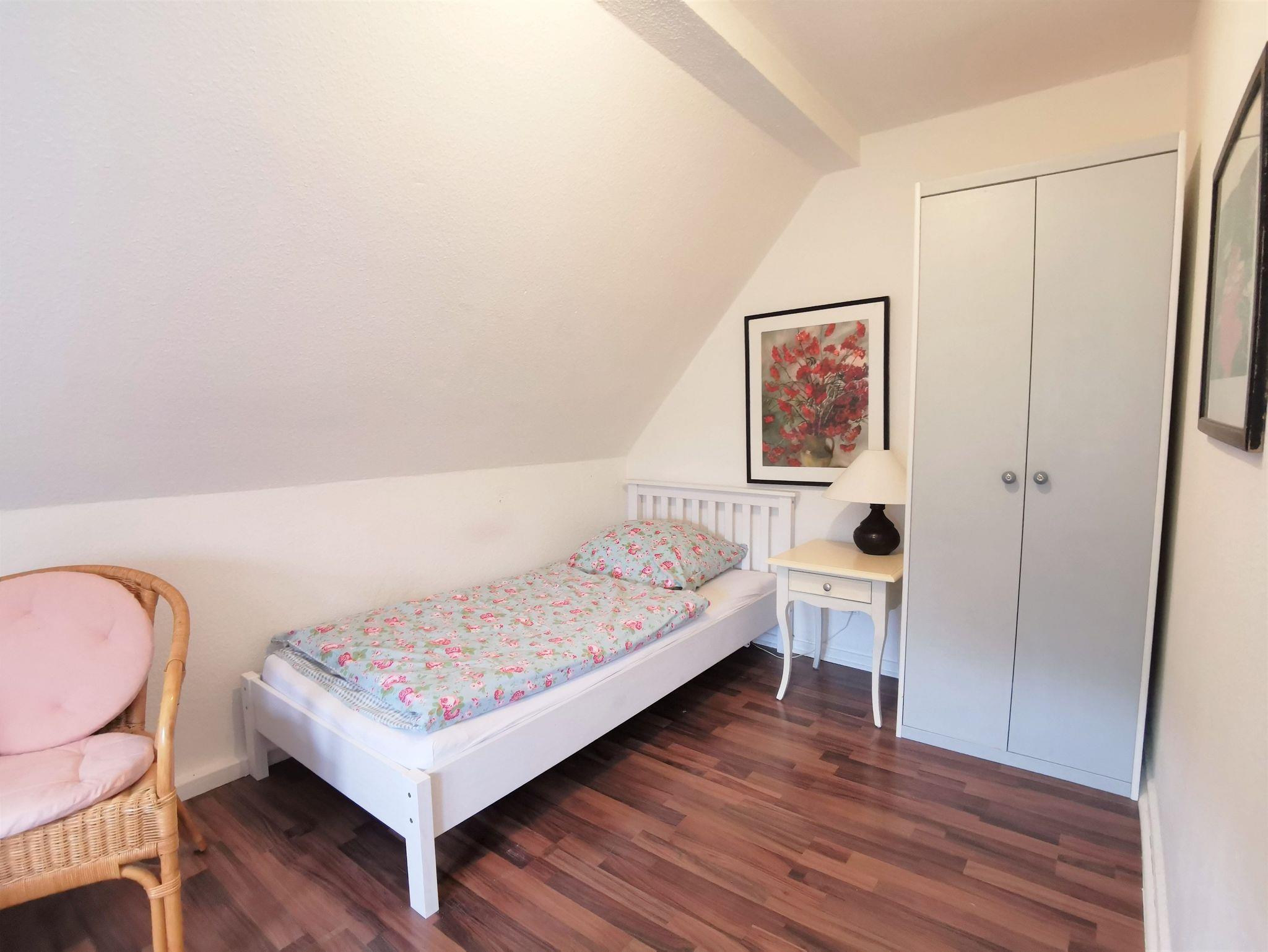 Sünje für max. 3 Personen: Urgemütliche Ferienwohnung im 1. OG, 65 qm, farbenfrohes Wohnzimmer mit offener Küche, ein Schlafzimmer mit zwei Einzelbetten, dahinter ein weiteres kleines Schlafzimmer mit einem Einzelbett, großzügiges Bad mit Wanne und Waschmaschine. Seperater Eingang und Flur, Garten mit Sitzgruppen.