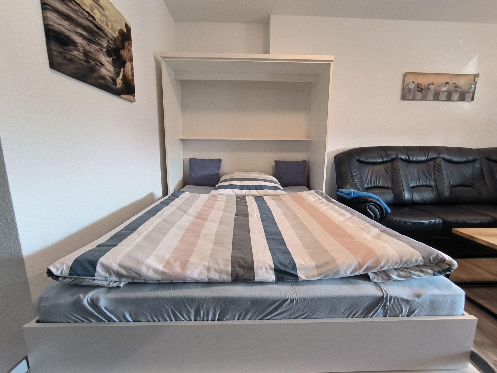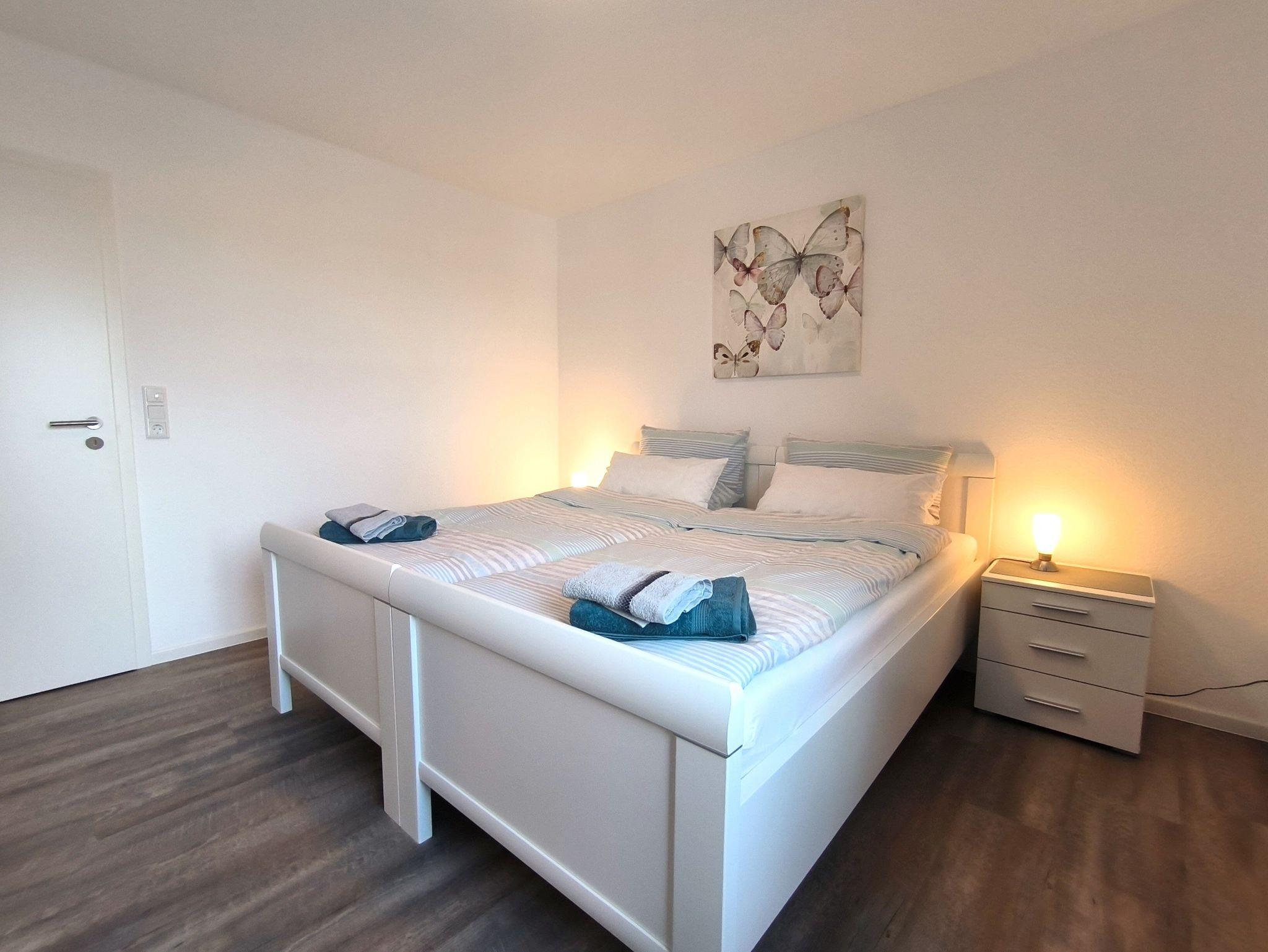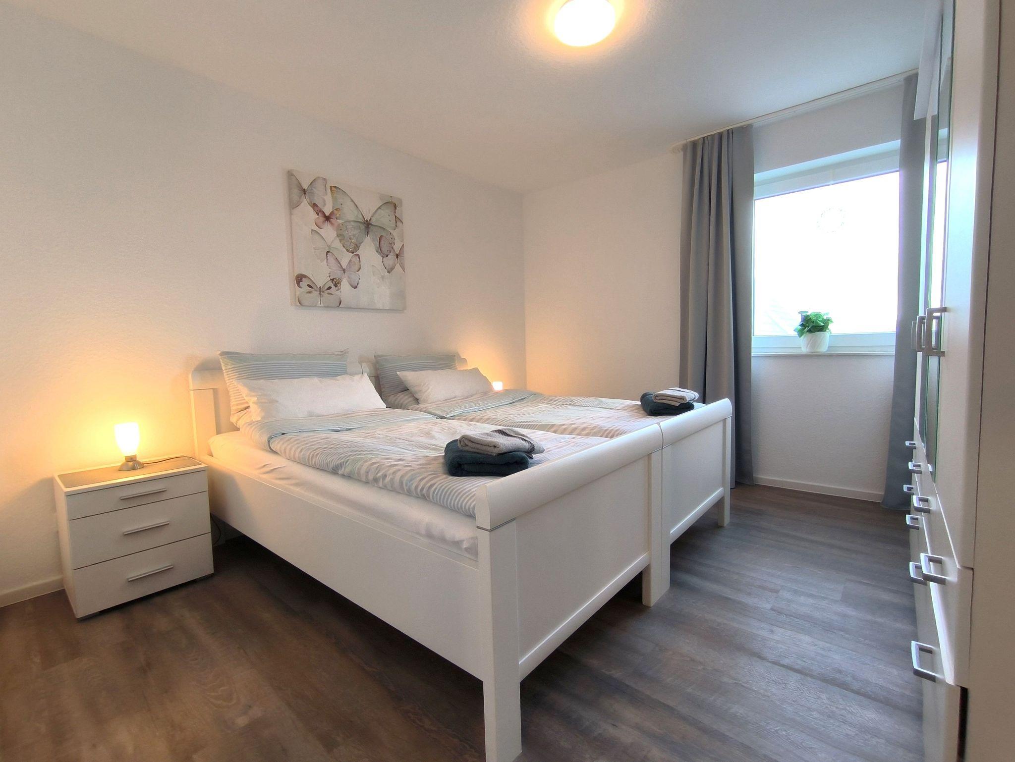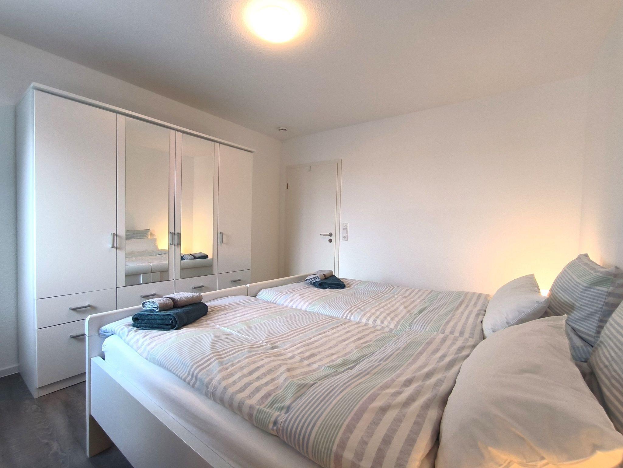 Das Schlafzimmer ist mit zwei zusammenstellbaren Einzelbetten (je 100 x 200 cm) und einem großen Kleiderschrank ausgestattet. Im Wohnzimmer gibt es ein sehr hochwertiges Schrankbett als Aufbettungsmöglichkeit für die 3. Person. Die Küche ist mit einer vollständig ausgesatteten Einbauküche und einem Esstisch für vier Personen eingerichtet - hier können leckere Urlaubsmahlzeiten vorbereitet, gekocht und verspeist werden. Es gibt ein helles und modernes Bad mit Dusche, Waschbeken und WC sowie eine Gästebad mit Toilette. Über den Glasfaseranschluss sind Sie mit schnellem W-Lan versorgt. Die gesamte Wohnung wird mit einer Fußbodenheizung beheizt.