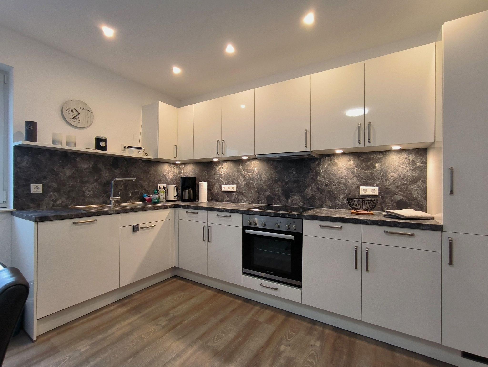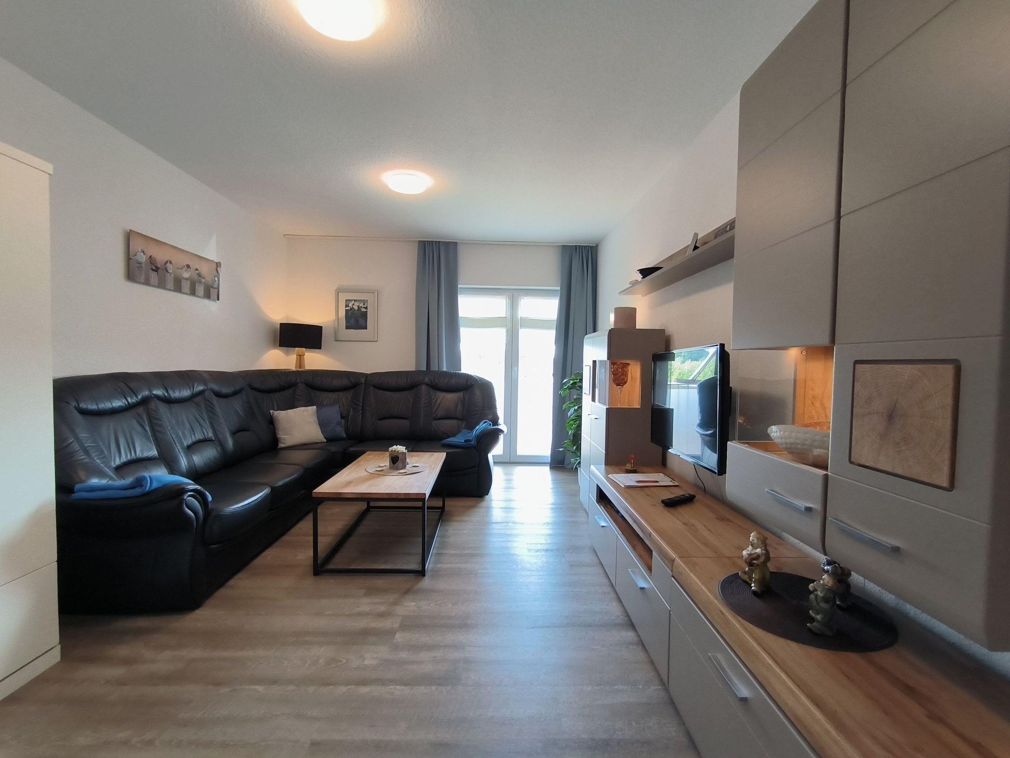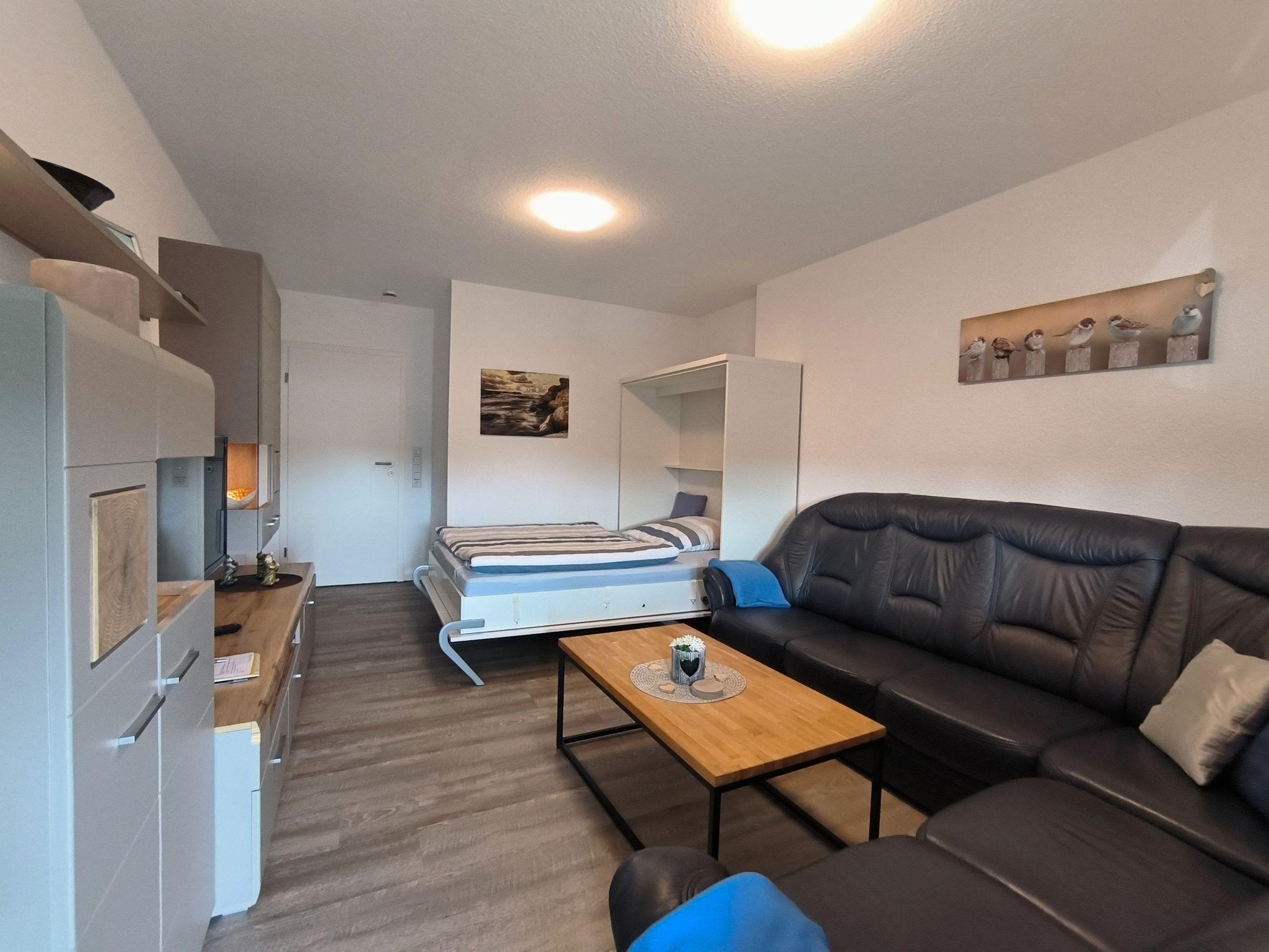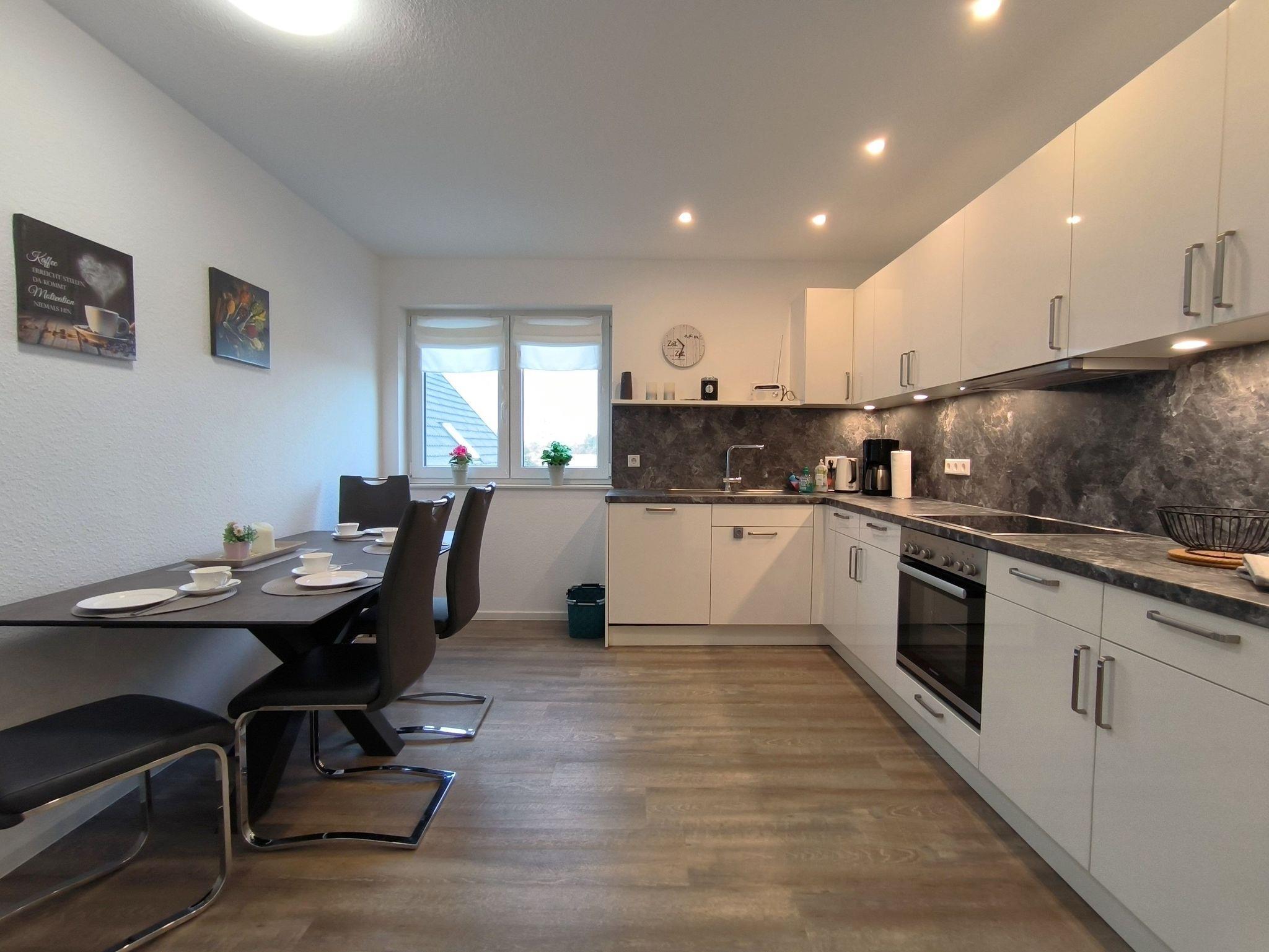 Das Schlafzimmer ist mit zwei zusammenstellbaren Einzelbetten (je 100 x 200 cm) und einem großen Kleiderschrank ausgestattet. Im Wohnzimmer gibt es ein sehr hochwertiges Schrankbett als Aufbettungsmöglichkeit für die 3. Person. Die Küche ist mit einer vollständig ausgesatteten Einbauküche und einem Esstisch für vier Personen eingerichtet - hier können leckere Urlaubsmahlzeiten vorbereitet, gekocht und verspeist werden. Es gibt ein helles und modernes Bad mit Dusche, Waschbeken und WC sowie eine Gästebad mit Toilette. Über den Glasfaseranschluss sind Sie mit schnellem W-Lan versorgt. Die gesamte Wohnung wird mit einer Fußbodenheizung beheizt.