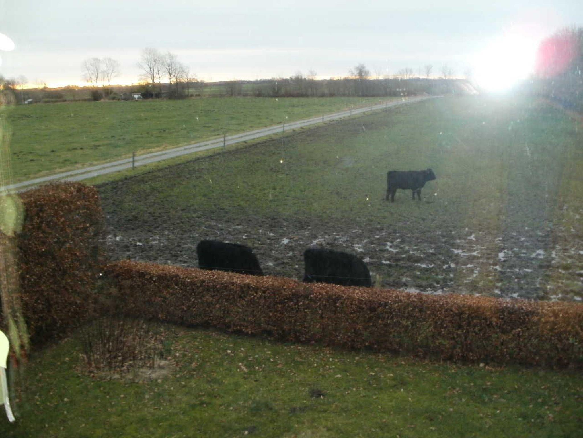 Im Garten gibt es ein Klettergerüst für Kinder und auf dem großen Grundstück gibt es Rinder, Hühner und Enten zu entdecken.