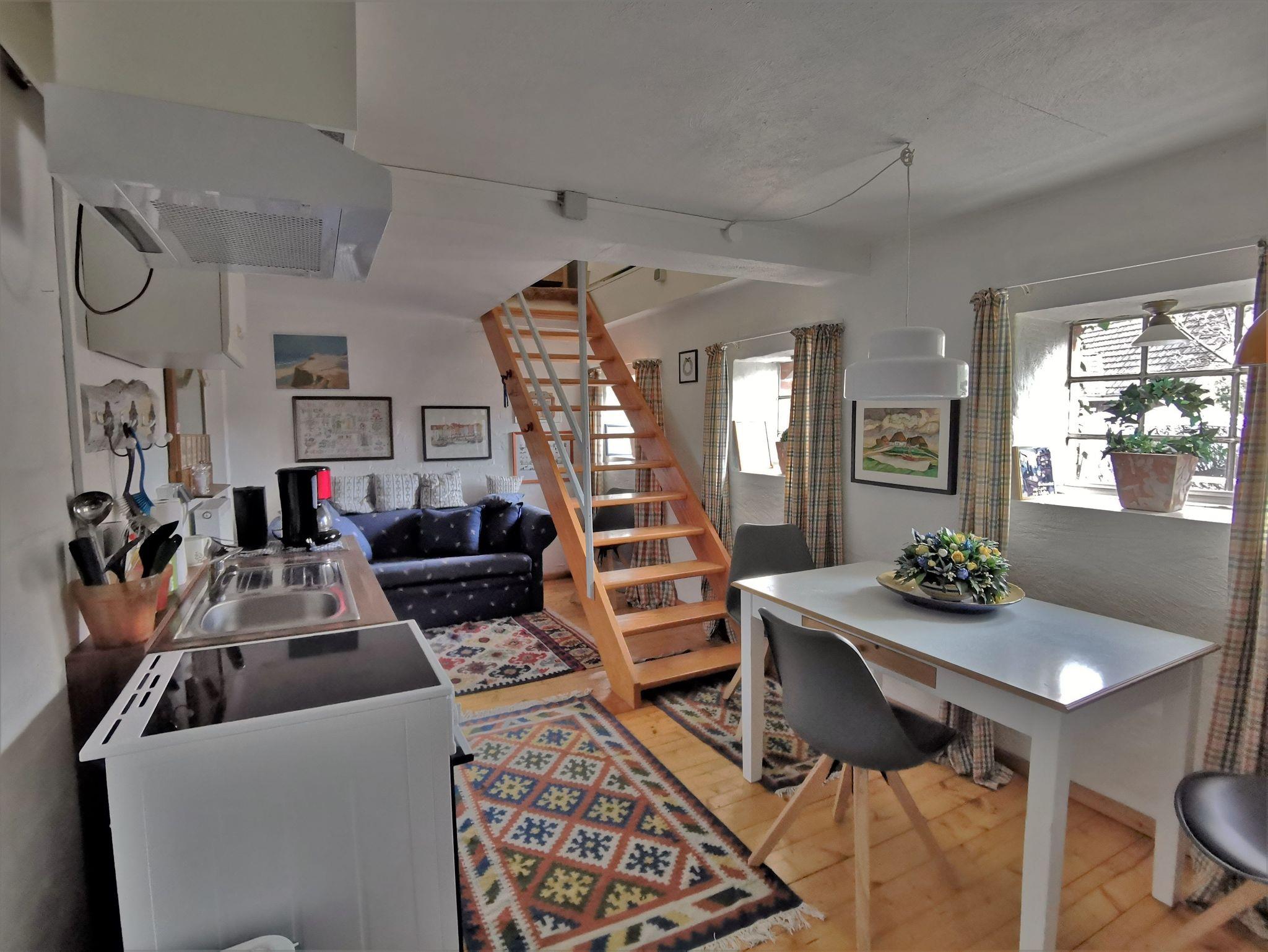 Im Erdgeschoss: Wohnraum mit Apartment-Charakter und offener, kleiner Kochgelegenheit, Esstisch und Sofa sowie ein Duschbad mit WC.