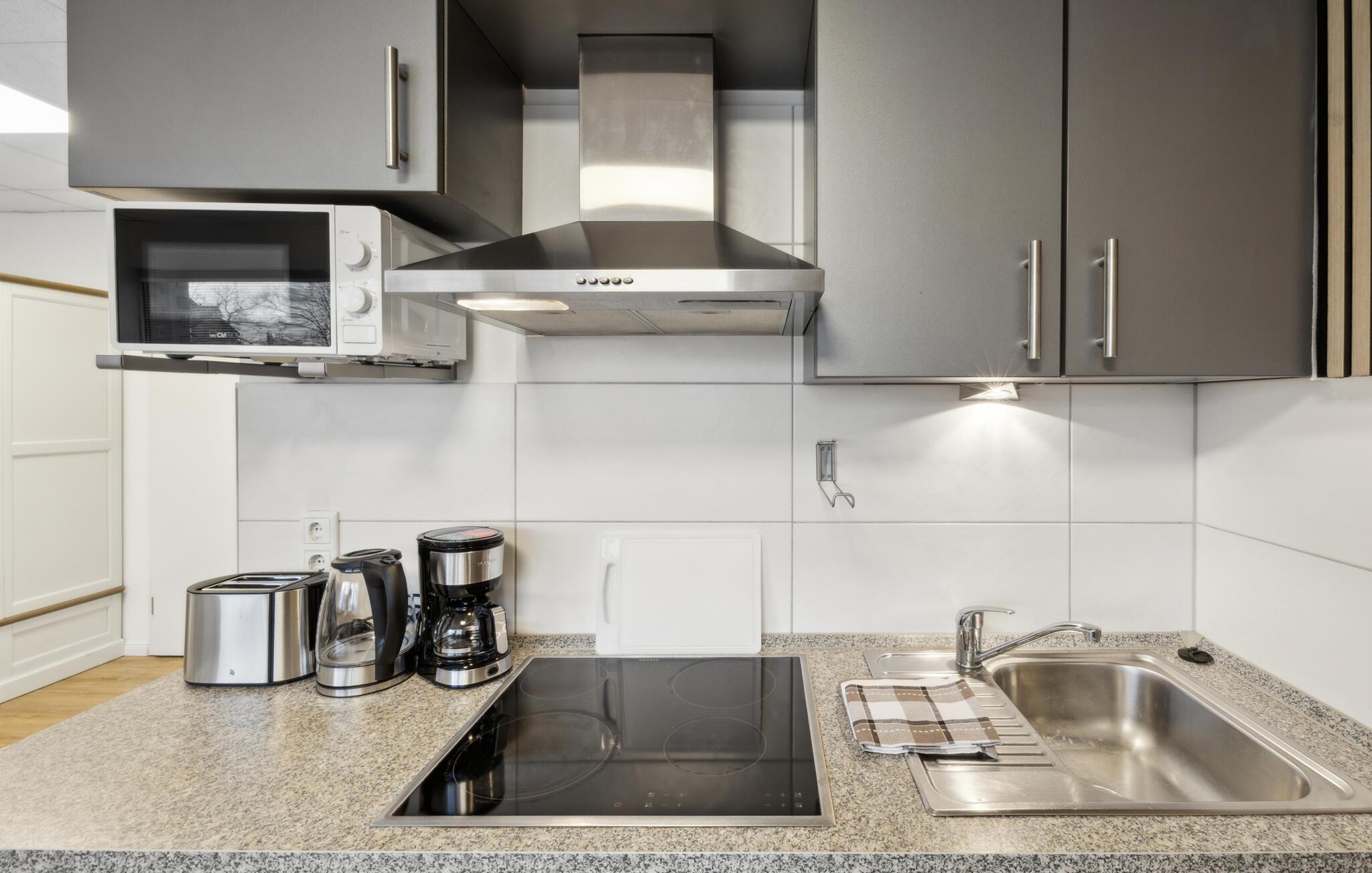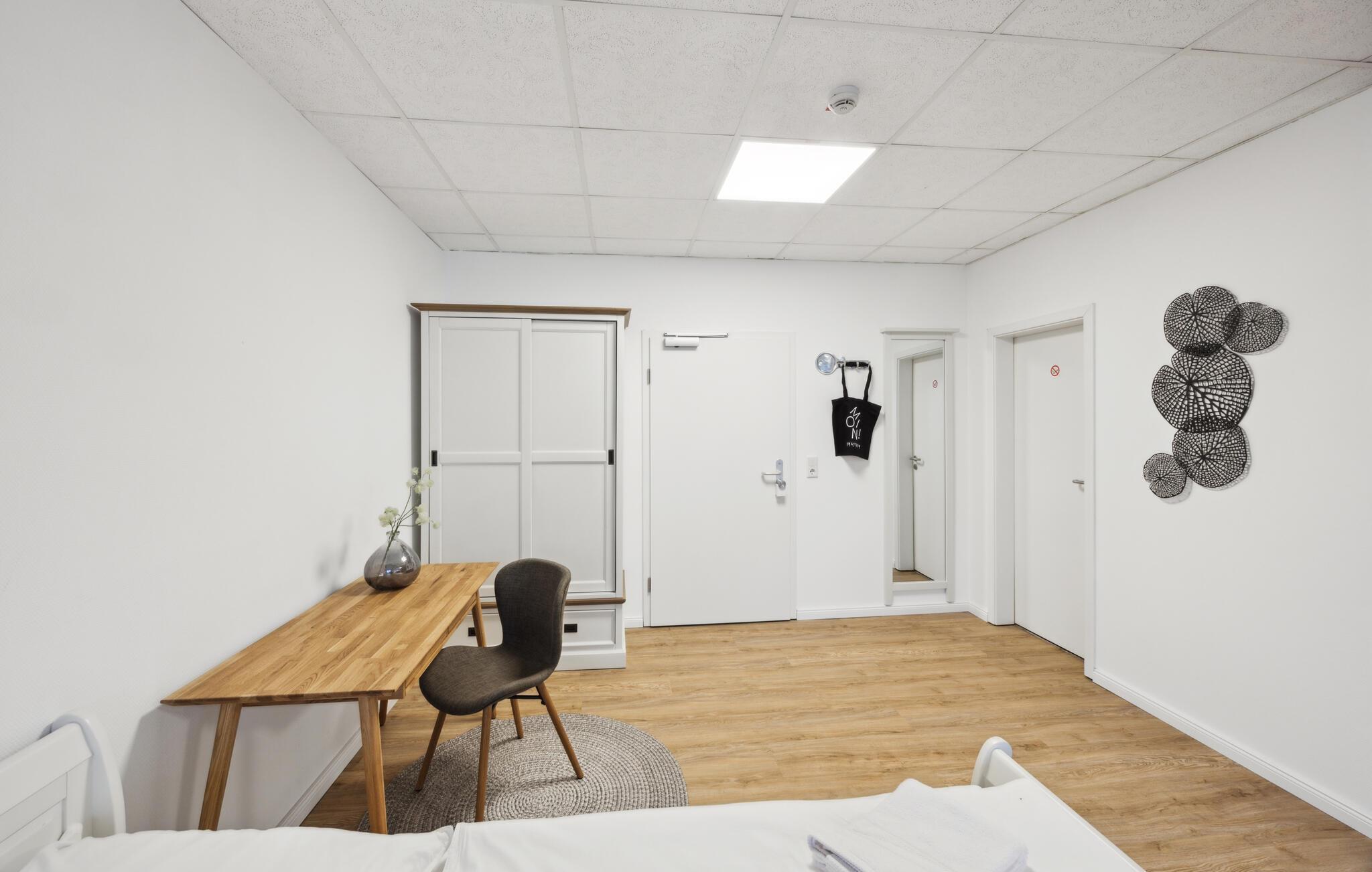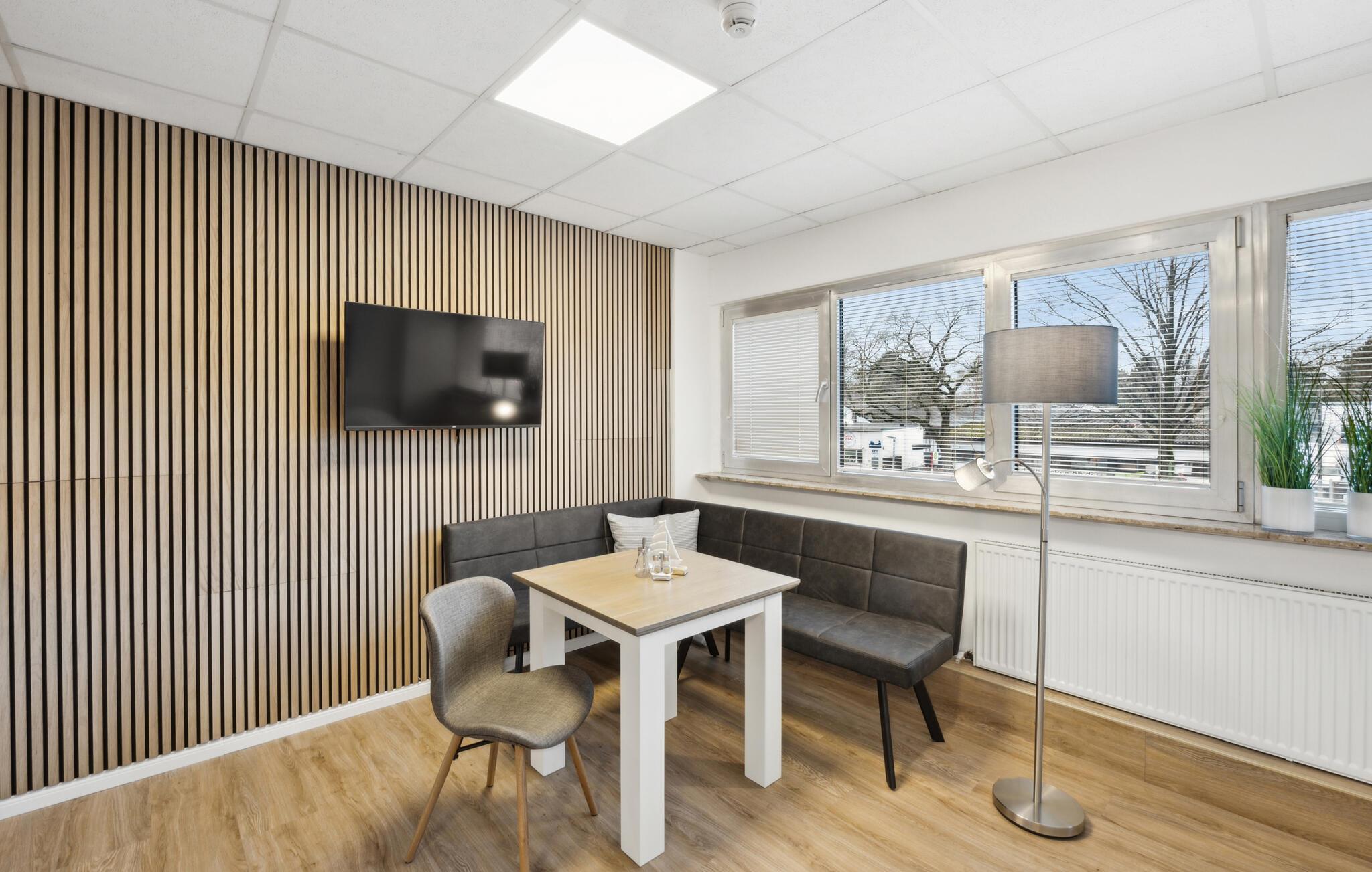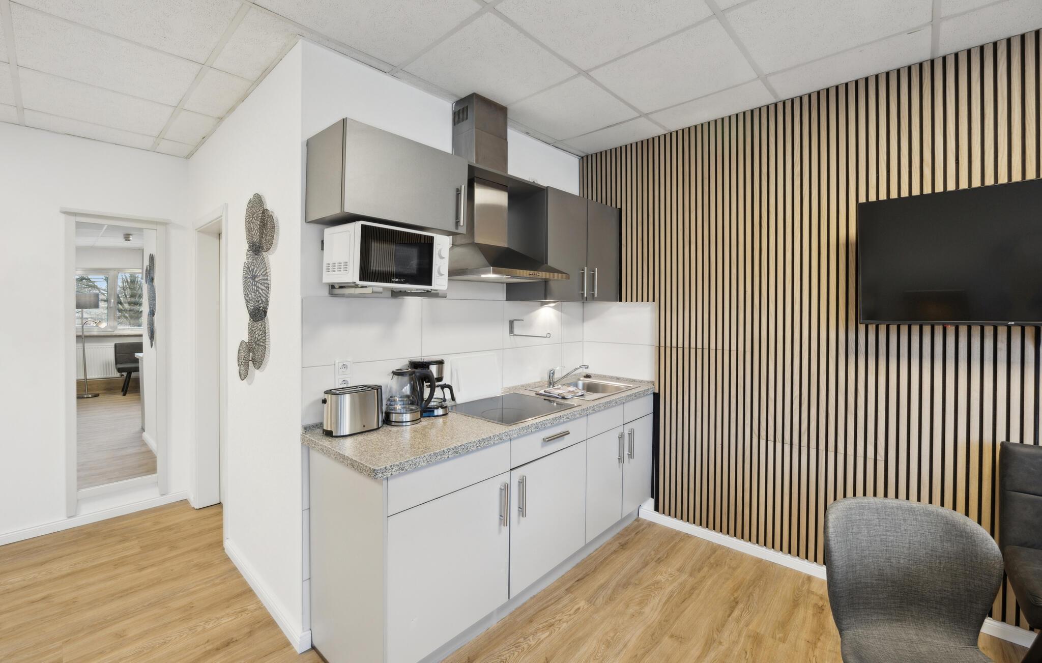Det hyggelige opholdsområde lægger op til en lille pause ind imellem. Tekøkkenet byder på nok opbevaringsplads og har alle de nødvendige redskaber til at forstærke jer med morgenmad og frisk kaffe inden en begivenhedsrig dag i storbyen. De integrerede akustikpaneler giver rummet en indbydende atmosfære.