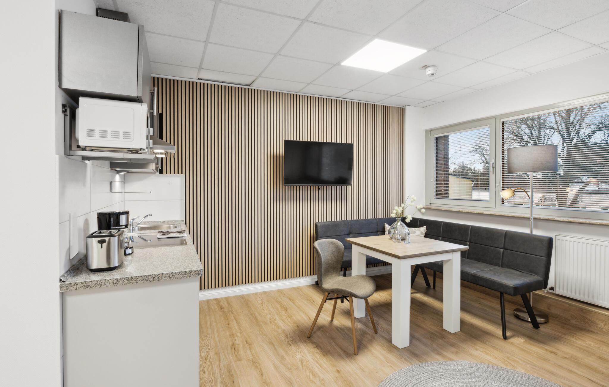 Det hyggelige opholdsområde lægger op til en lille pause ind imellem. Tekøkkenet byder på nok opbevaringsplads og har alle de nødvendige redskaber til at forstærke jer med morgenmad og frisk kaffe inden en begivenhedsrig dag i storbyen. De integrerede akustikpaneler giver rummet en indbydende atmosfære.