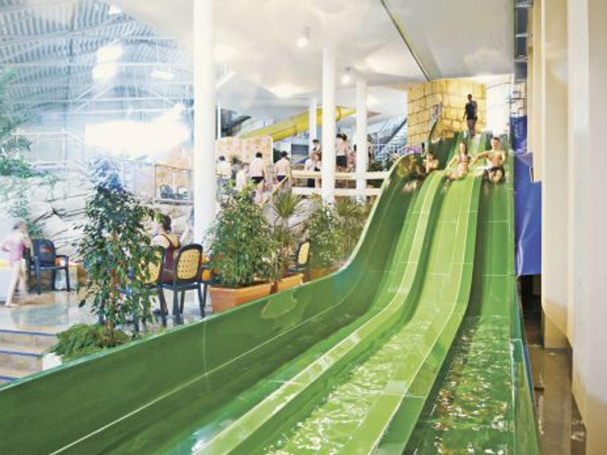 • Subtropisches Badeparadies (30.10.-14.12., 8.1.-9.2. und 19.2.-24.3. kostenfrei, sonst gegen Gebühr): Badelandschaft auf 10.000 qm mit einer 214 m langen Reifenrutsche, 156 m Superrutsche mit Lichteffekten, 75 m Turborutsche, Wellenbad, Badegrotte mit Piranha-Aquarium, Wasserfall, Kinderkino, Spaß-und Tobebecken, Textilsauna