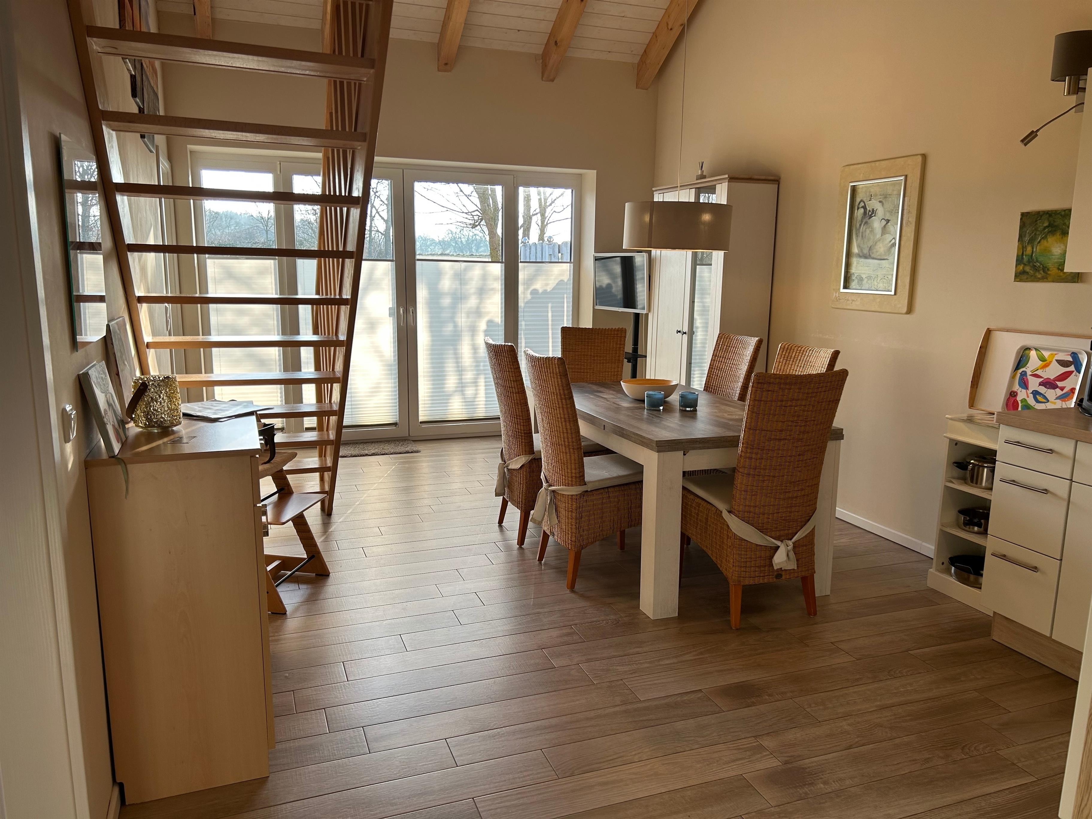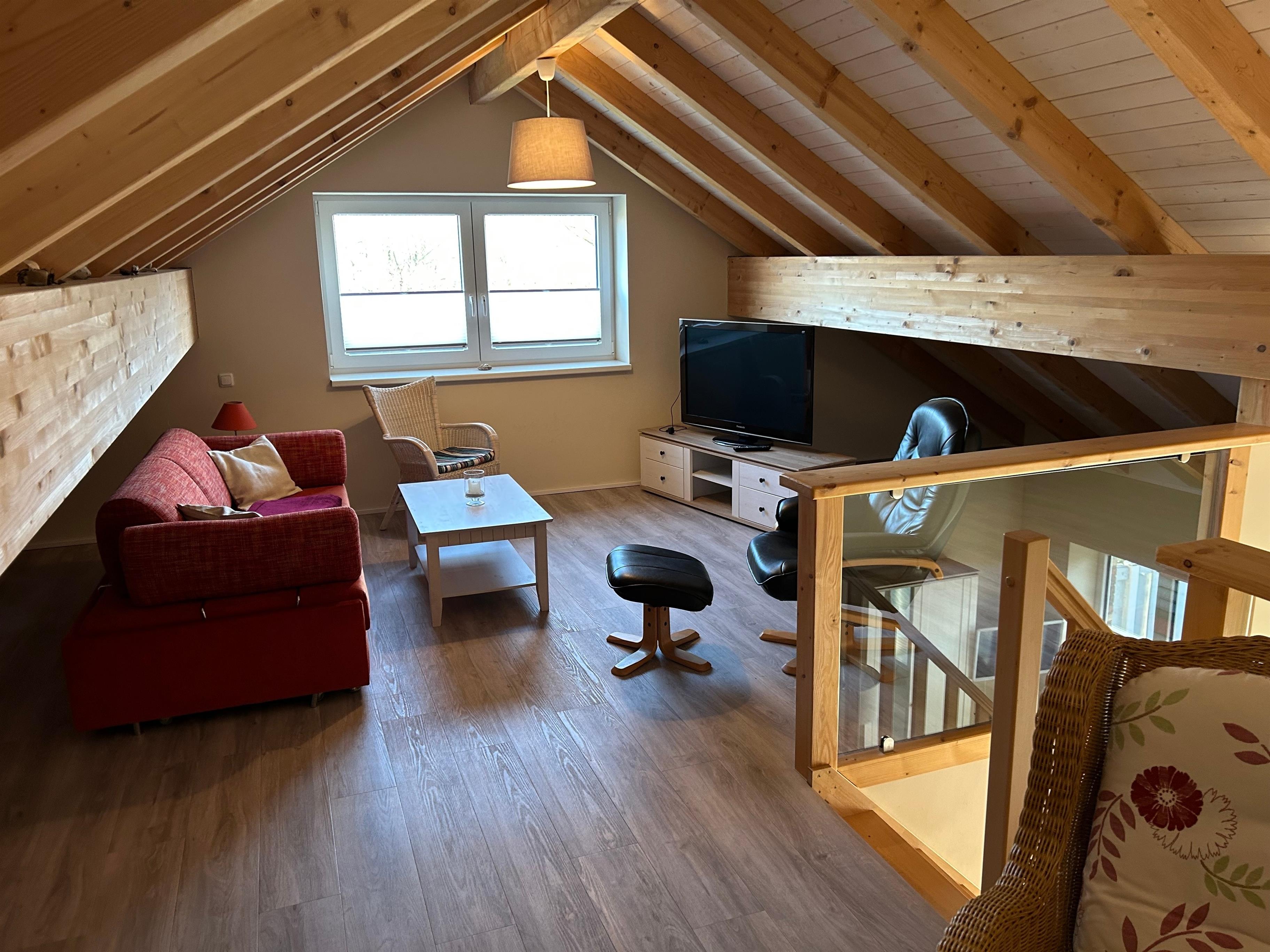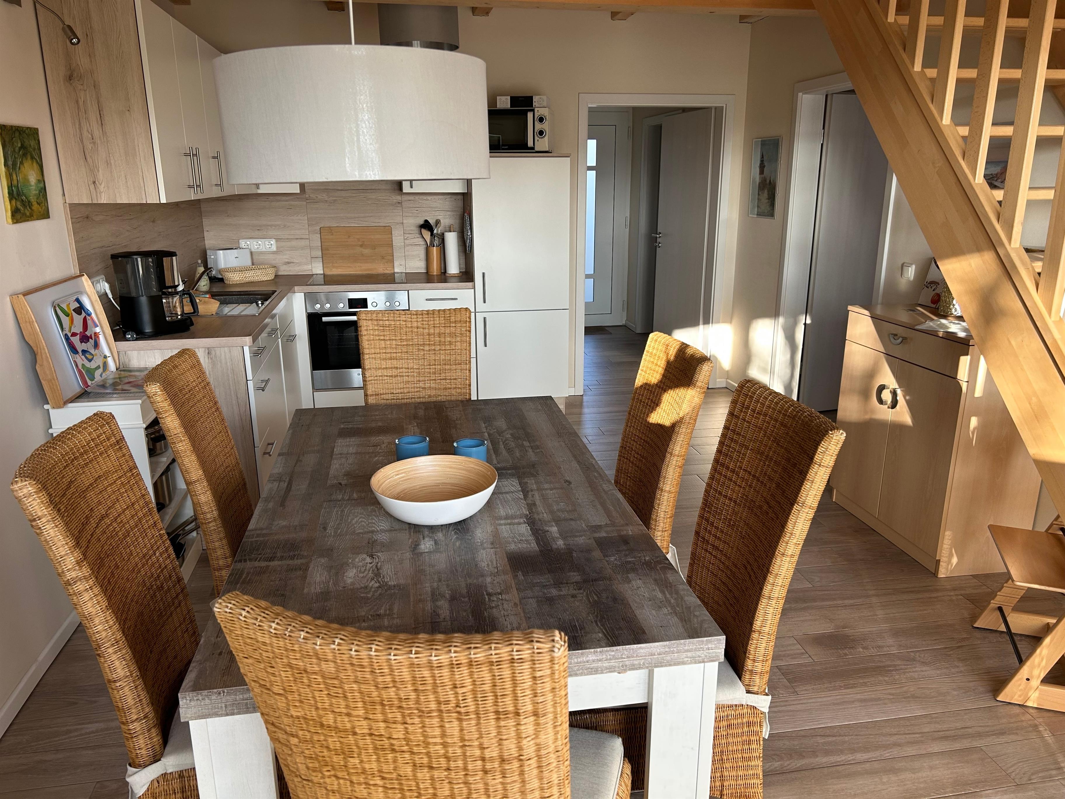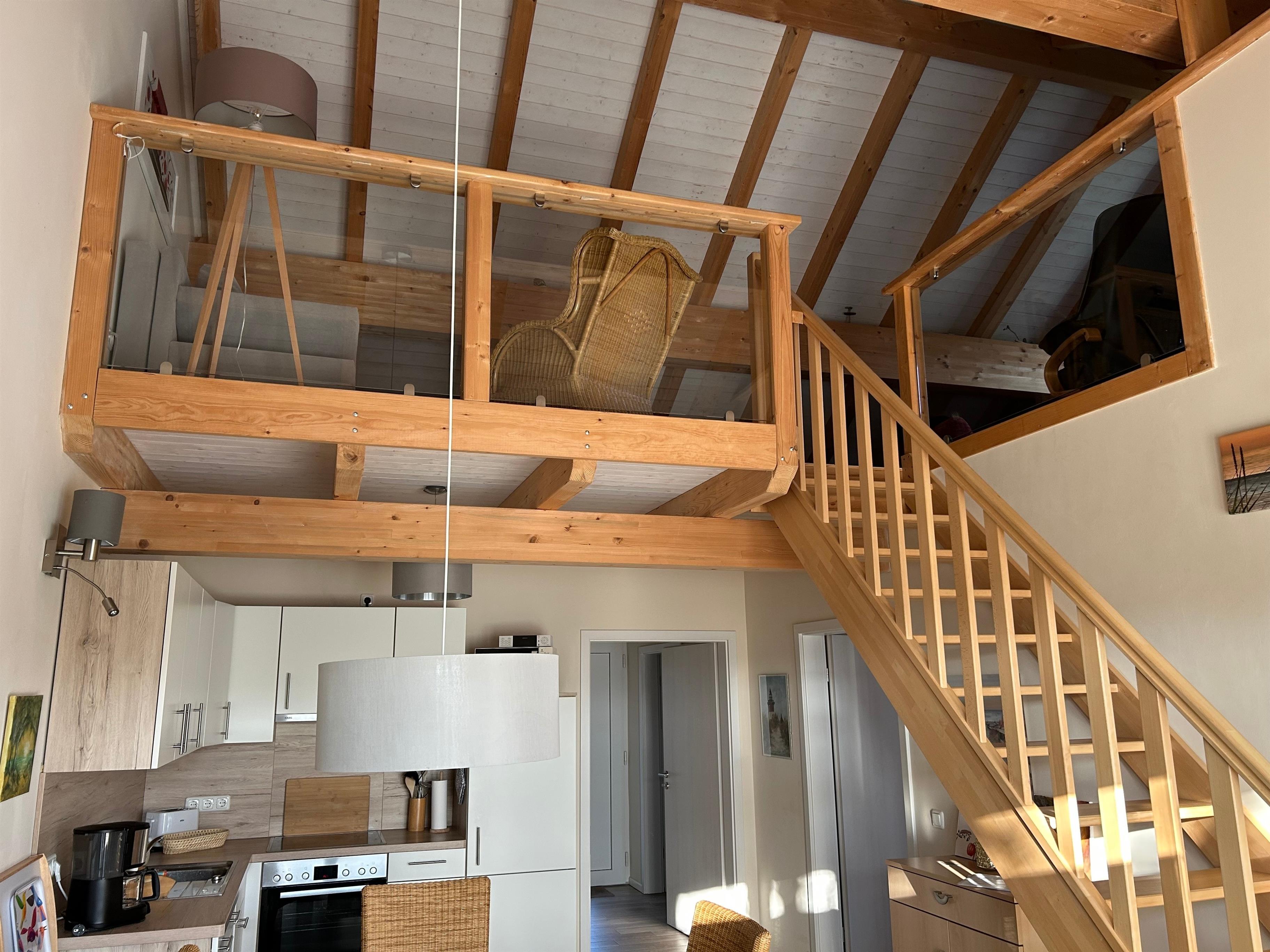 Die Ferienhaushälfte erreichen Sie über einen eigenen Eingang. Von einem kleinen Vorflur gelangen Sie in das Badezimmer mit Badewanne und Dusche und in ein Esszimmer mit integrierter Küche, die hochwertig ausgestattet ist. Von hier gelangen Sie über eine Treppe nach oben in den ersten Stock. Der gesamte obere Bereich ist als Wohnzimmer eingerichtet u.a. mit 2 Schlafsofa und einem Ersatzbett unter der Schräge. Das Obergeschoß ist offen wie eine Empore. Von hier oben haben Sie einen freien Blick gen Südwesten und Osten.