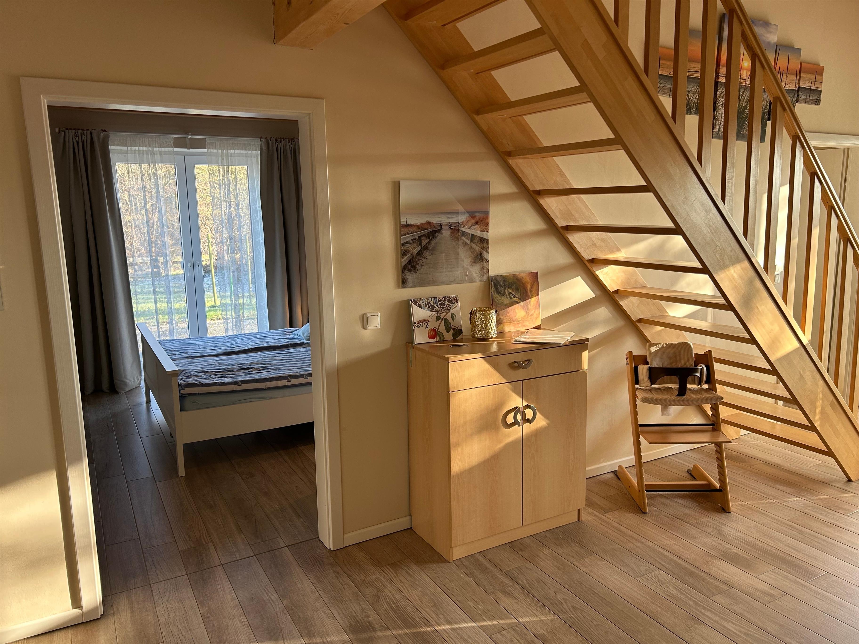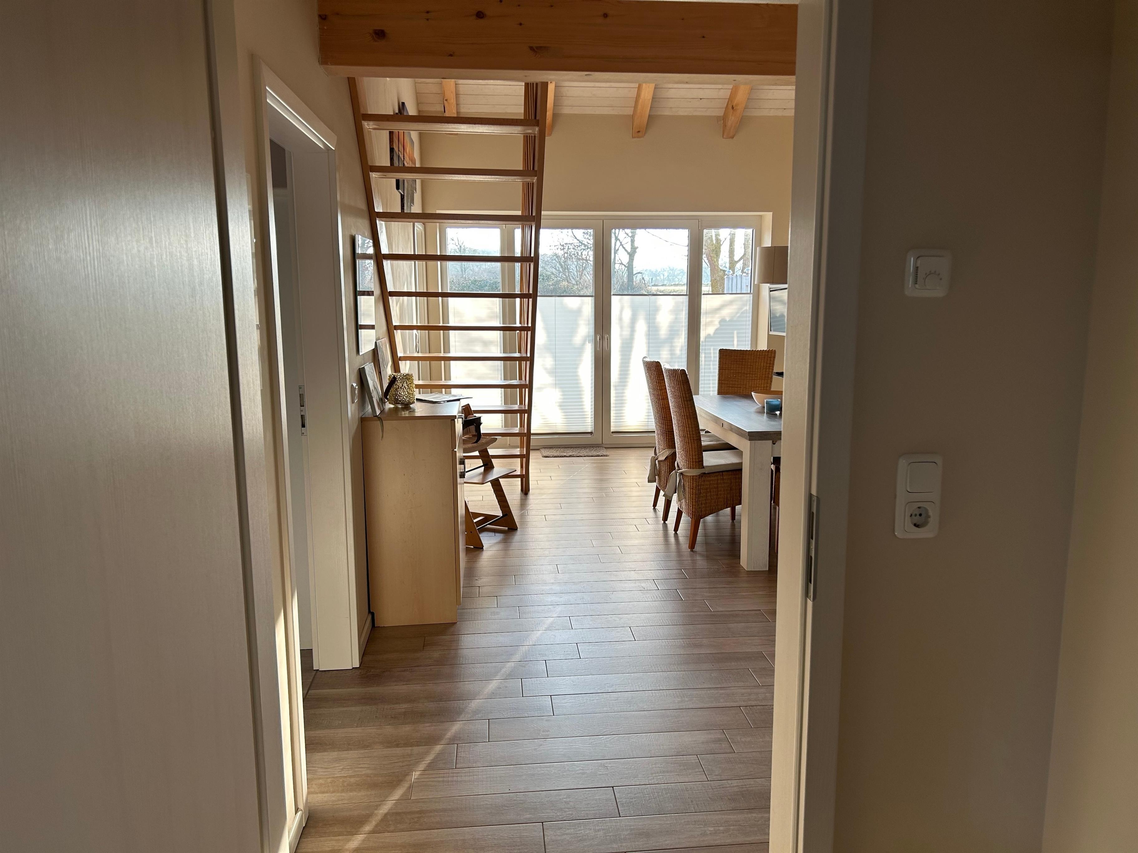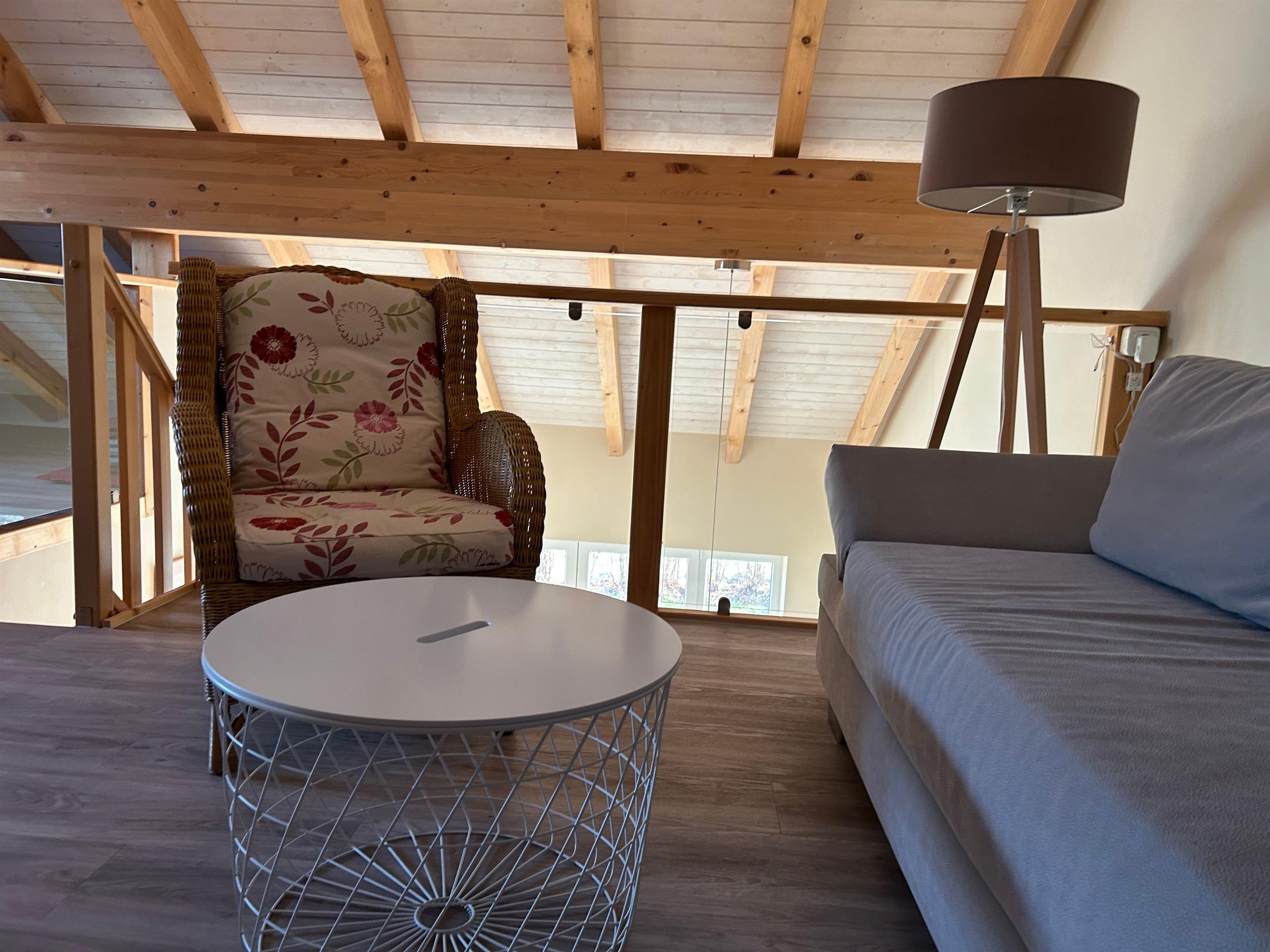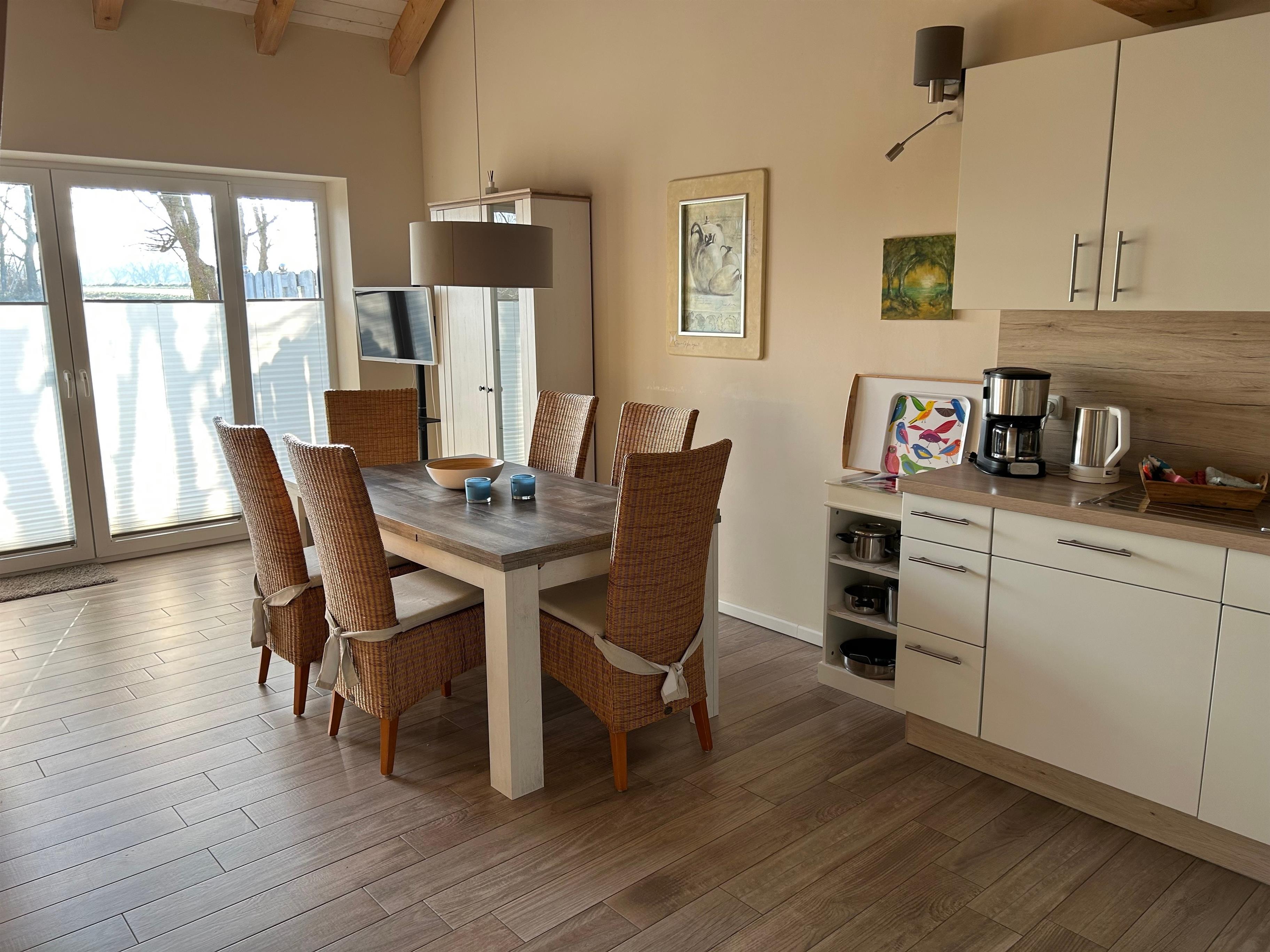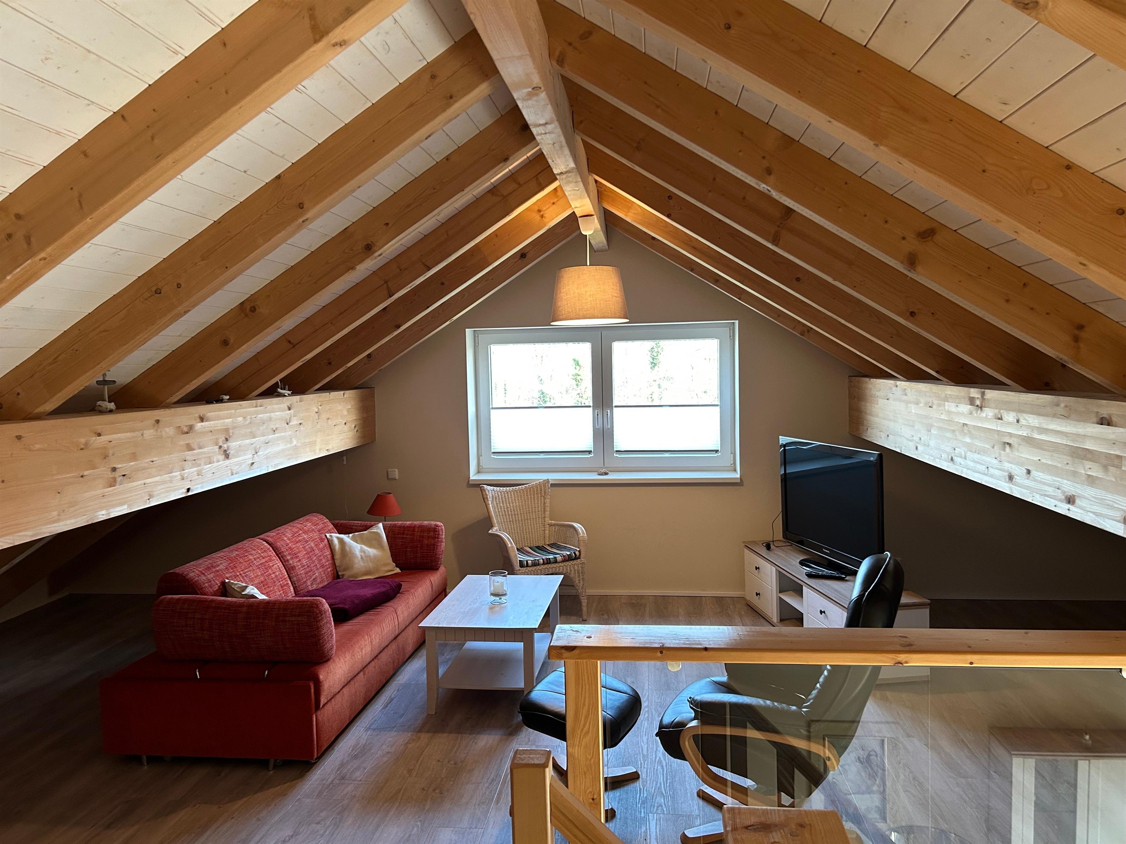 Die Ferienhaushälfte erreichen Sie über einen eigenen Eingang. Von einem kleinen Vorflur gelangen Sie in das Badezimmer mit Badewanne und Dusche und in ein Esszimmer mit integrierter Küche, die hochwertig ausgestattet ist. Von hier gelangen Sie über eine Treppe nach oben in den ersten Stock. Der gesamte obere Bereich ist als Wohnzimmer eingerichtet u.a. mit 2 Schlafsofa und einem Ersatzbett unter der Schräge. Das Obergeschoß ist offen wie eine Empore. Von hier oben haben Sie einen freien Blick gen Südwesten und Osten.