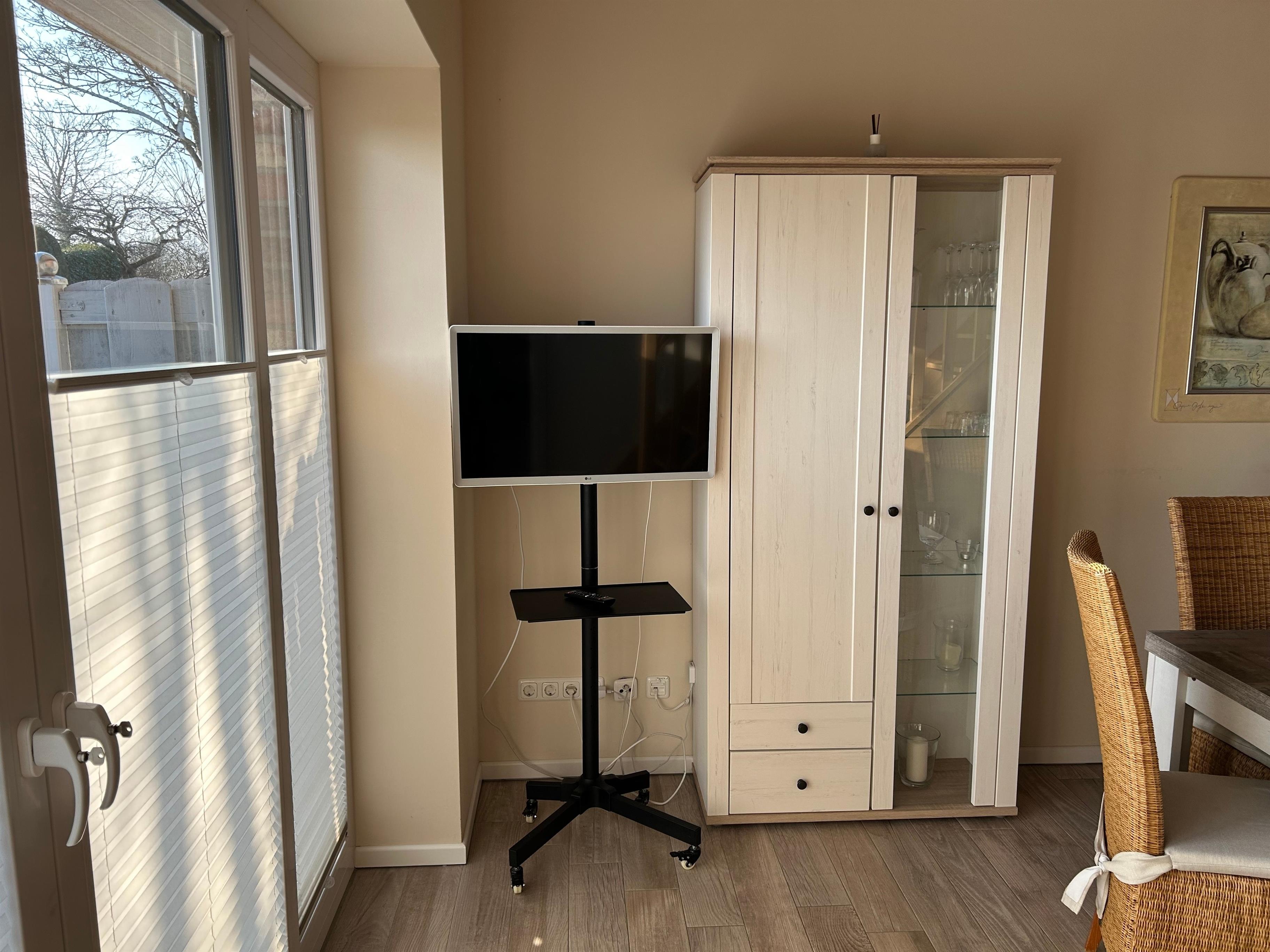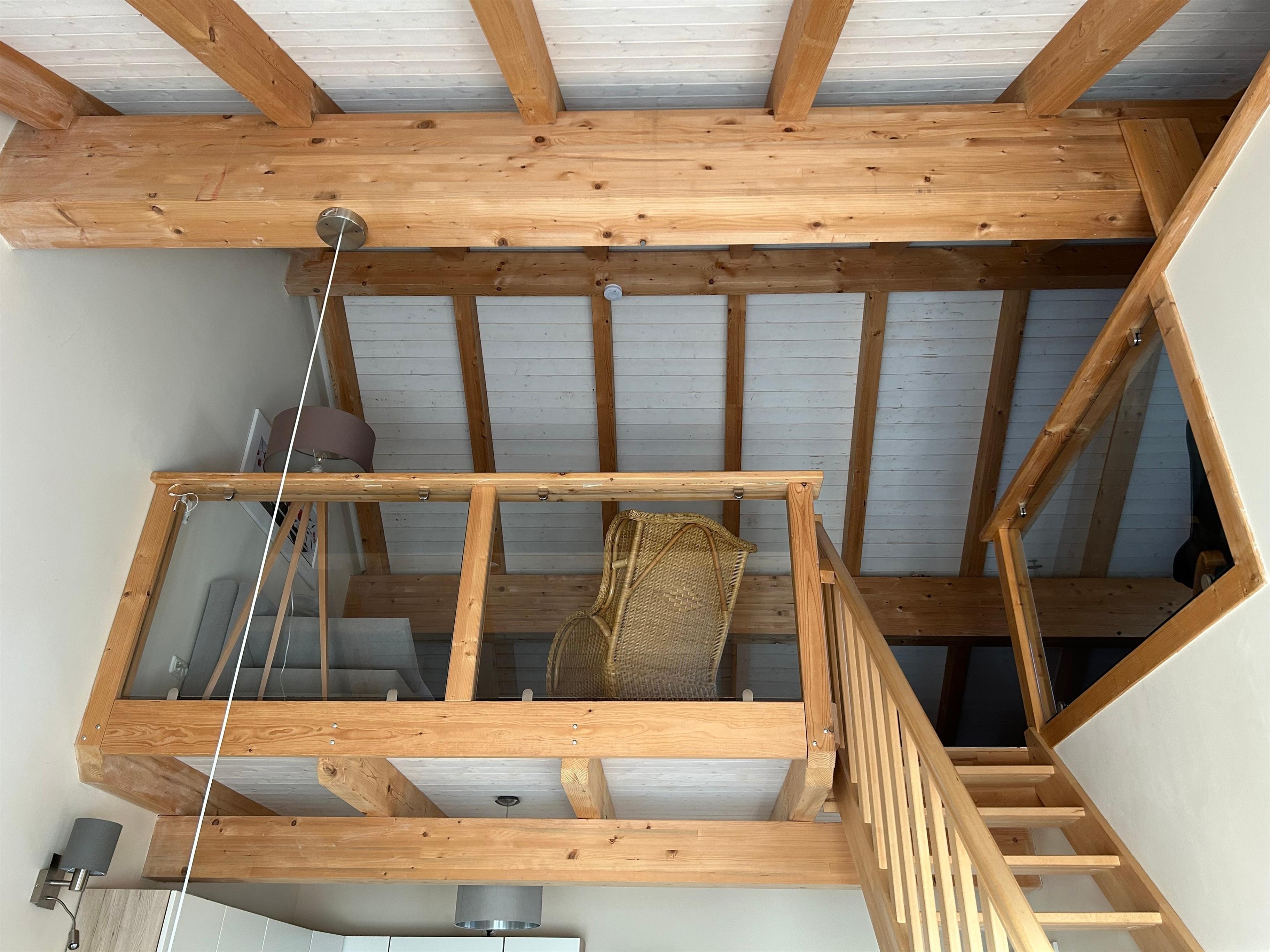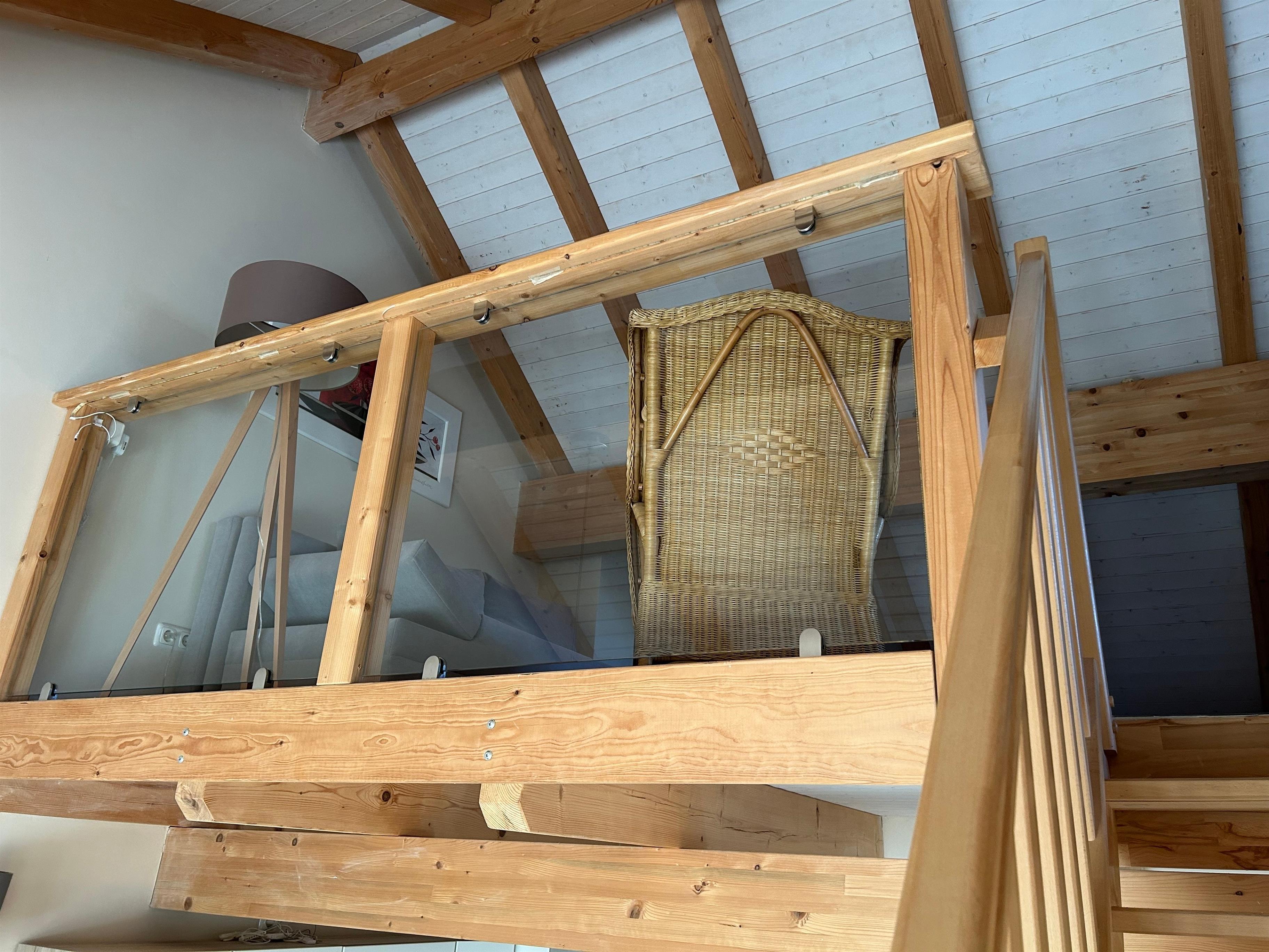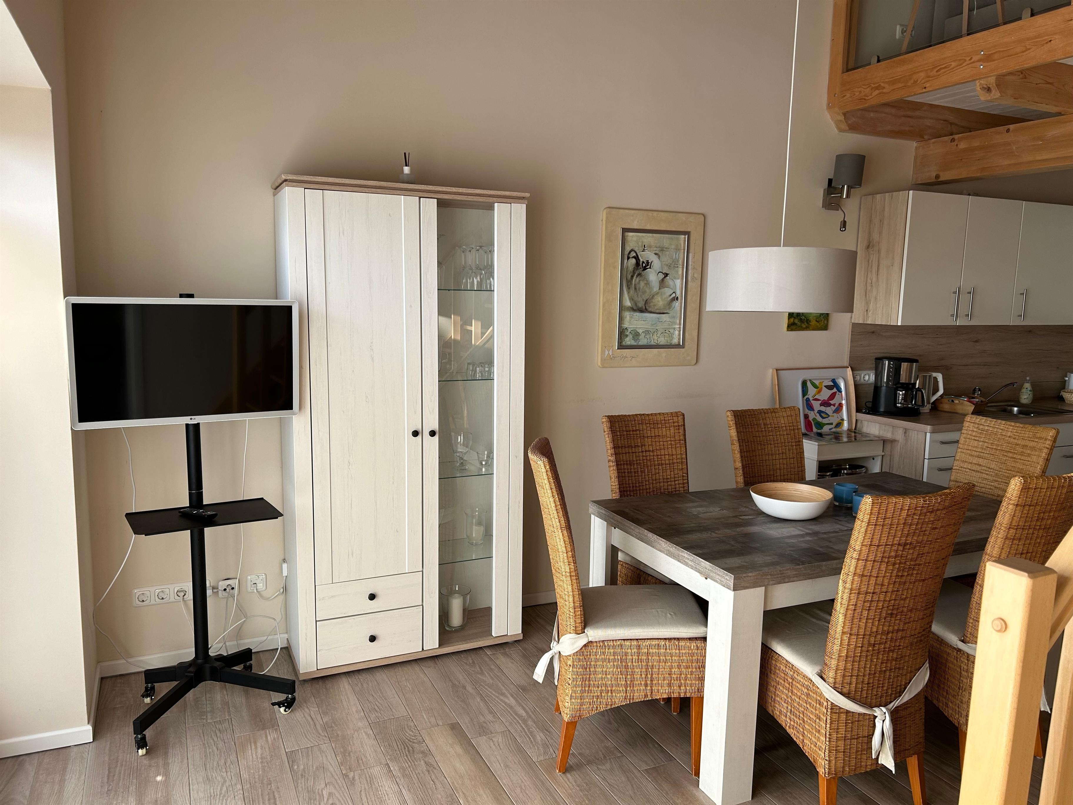 Die Ferienhaushälfte erreichen Sie über einen eigenen Eingang. Von einem kleinen Vorflur gelangen Sie in das Badezimmer mit Badewanne und Dusche und in ein Esszimmer mit integrierter Küche, die hochwertig ausgestattet ist. Von hier gelangen Sie über eine Treppe nach oben in den ersten Stock. Der gesamte obere Bereich ist als Wohnzimmer eingerichtet u.a. mit 2 Schlafsofa und einem Ersatzbett unter der Schräge. Das Obergeschoß ist offen wie eine Empore. Von hier oben haben Sie einen freien Blick gen Südwesten und Osten.