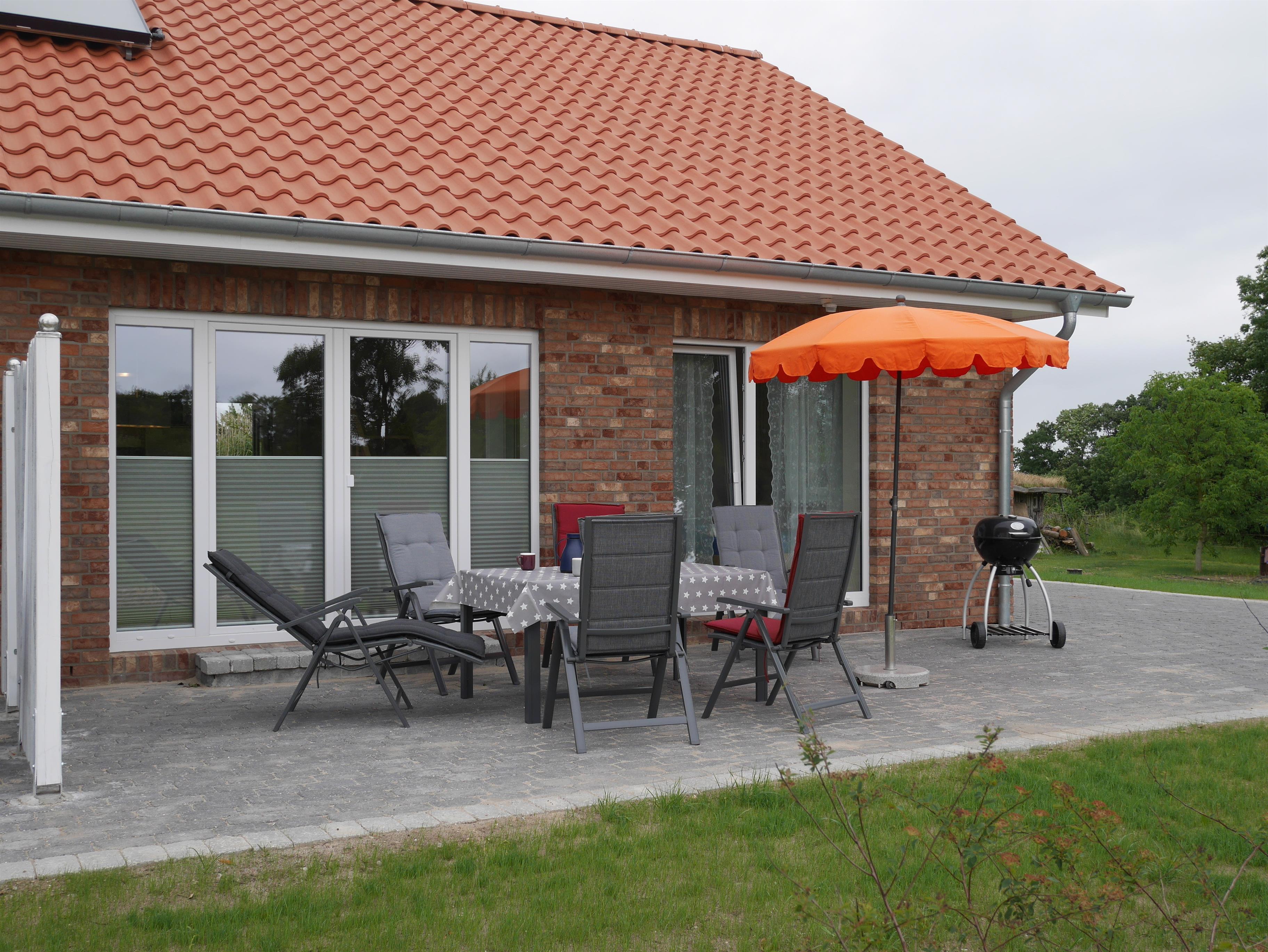 Das Morgenlicht scheint wunderbar herein; da sie fast rundherum von großen Fenstern umgeben ist, kommt zu jeder Zeit viel Licht ins Haus. Große Terrassen bieten angenehme Möglichkeiten draußen zu verweilen, z.B. im Strandkorb oder die Gartenmöbel zu nutzen. Ein Grill erweitert Spektrum. Auf der angrenzenden Wiese Ball spielen, Tischtennis spielen mit vorhandenen Schlägern, Kinder können im Sandkasten, auf der Schaukel oder dem Kinderhochhaus spielen.