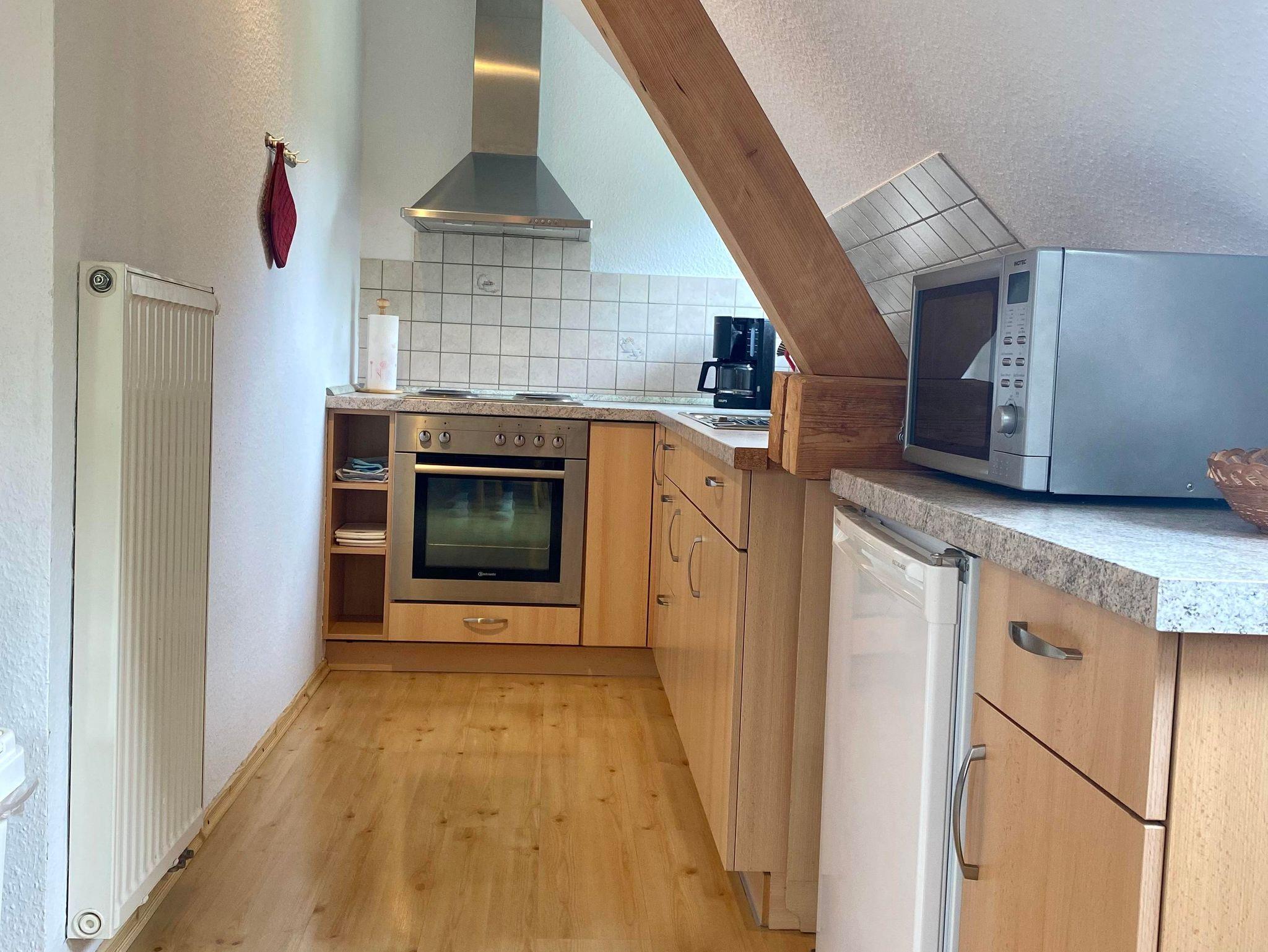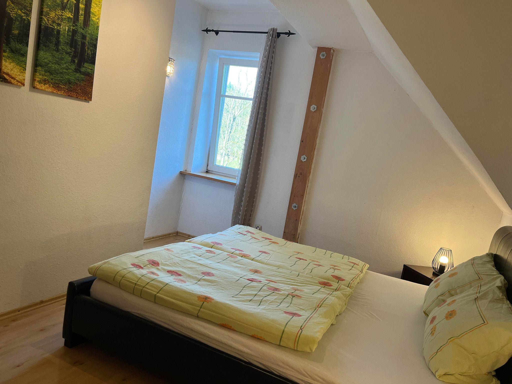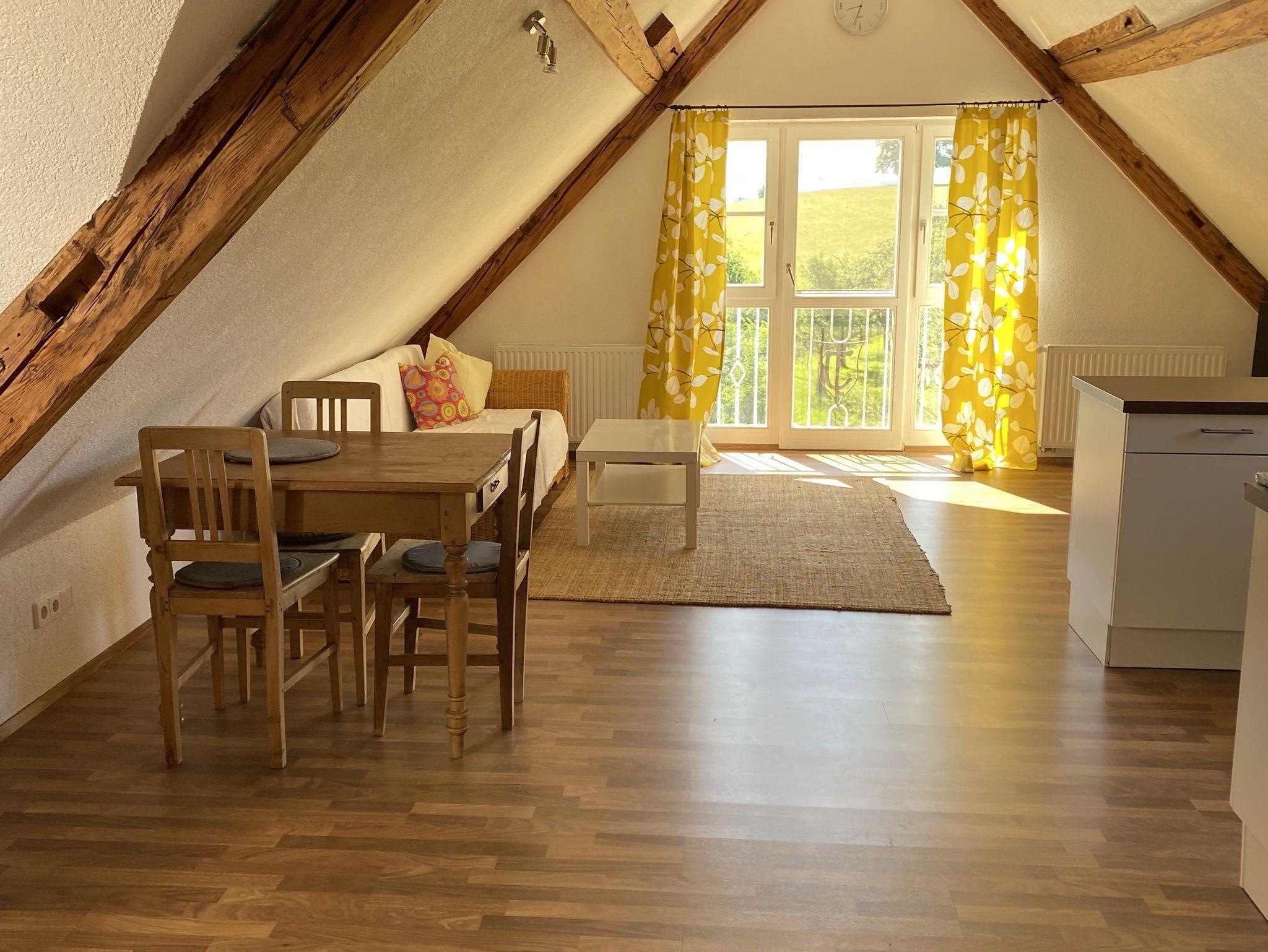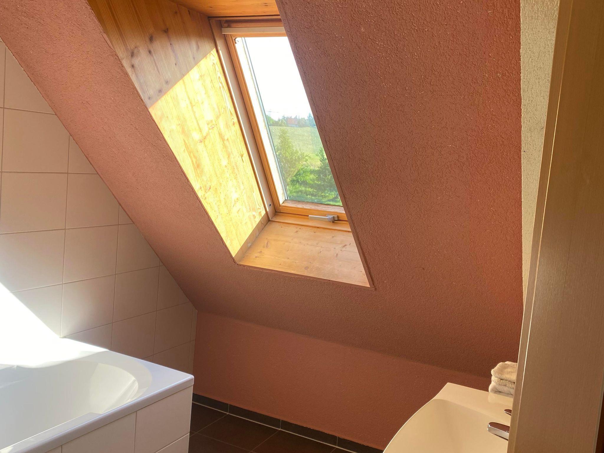 Im 2. OG befindet sich unsere Ferienwohnung Waldblick mit 77 m². Wer die Ruhe sucht, ist hier richtig. Sie hören den Bach plätschern und blicken auf unseren Wald und die angrenzenden Wiesen.