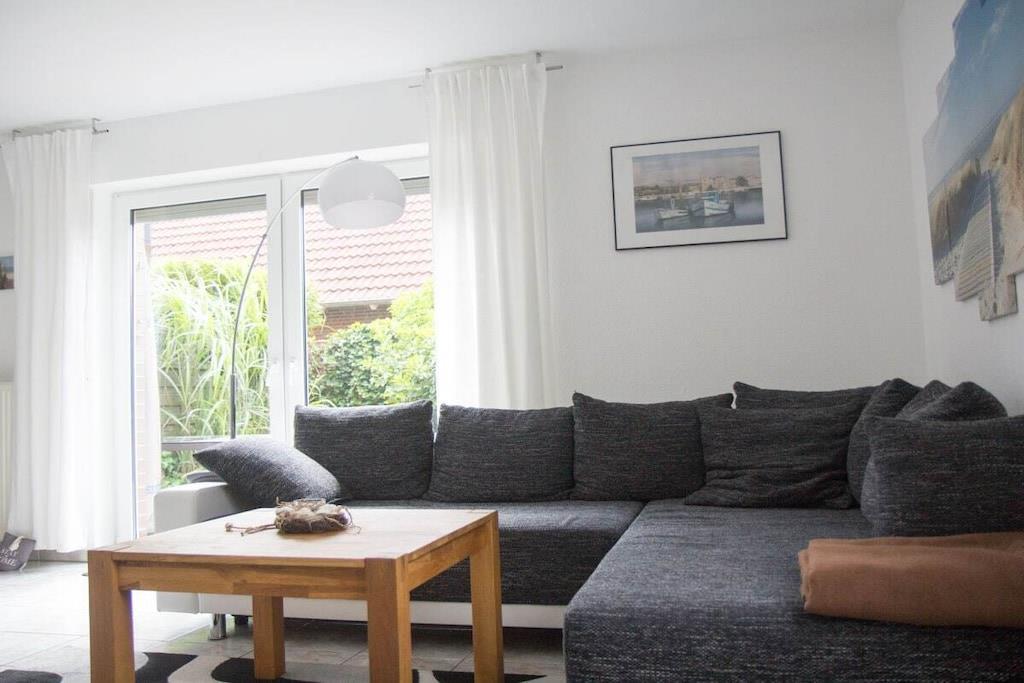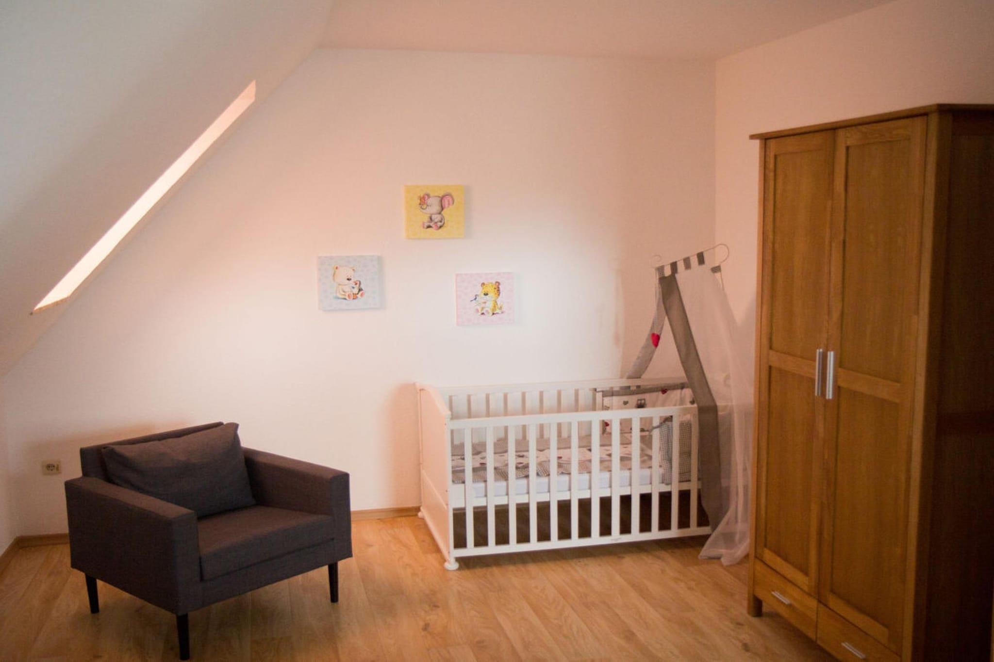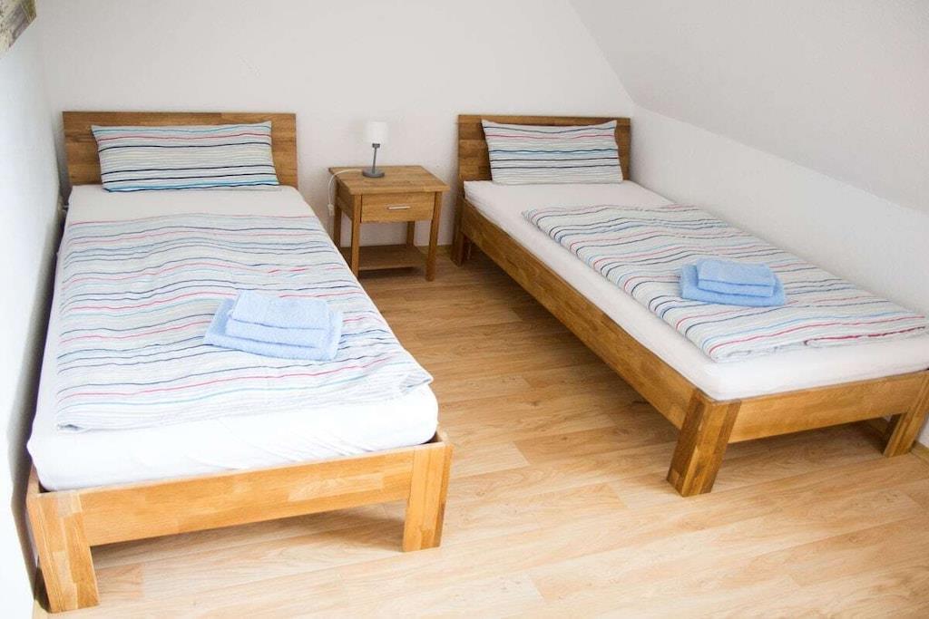 Das Ferienhaus verfügt im Erdgeschoss über einen schönen großen Eingangsbereich, ein Gäste- WC, einen Abstellraum, eine abgeschlossene Küche und ein großes, helles Wohnzimmer mit Kaminofen und direktem Zugang zum großen Garten. Über eine offene Treppe gelangt man in die erste Etage. Hier befinden sich ein sehr großes Schlafzimmer mit Doppelbett. Ein festes Kinderbett hat hier seinen Platz, eine gemütlich Ecke mit Sessel macht dieses Zimmer komplett. Das zweite Schlafzimmer ist mit zwei Einzelbetten und einem Fernseher ausgestattet. Im großen Duschbad auf dieser Etage befindet sich auch die Waschmaschine. Außenjalousien und Parkplatz. In diesem Haus mit Südausrichtung können Sie Ihre Urlaubstage entspannt genießen.