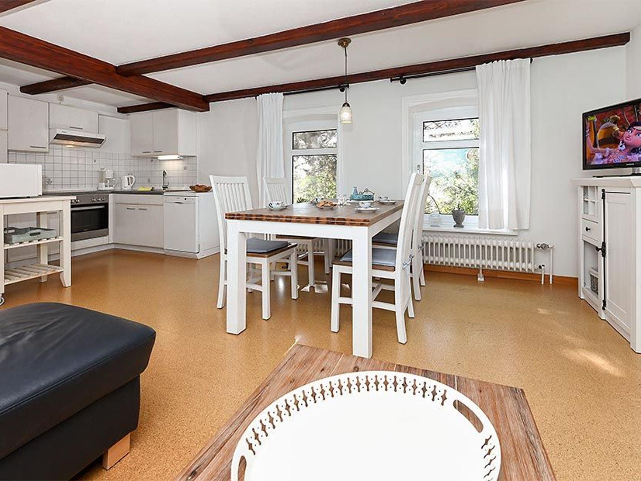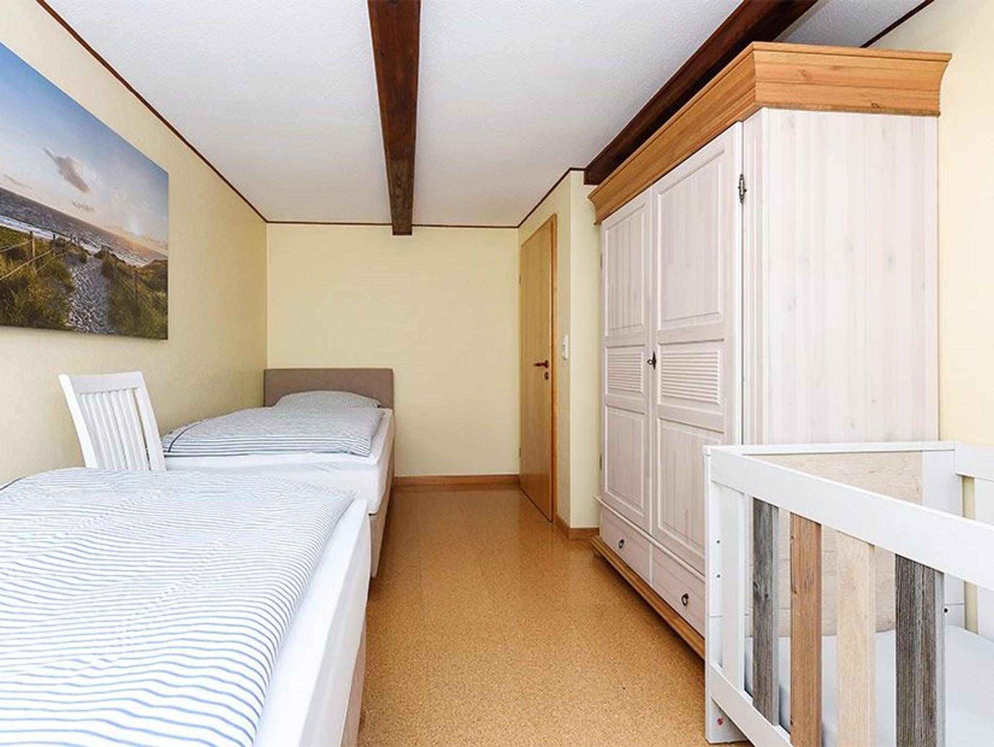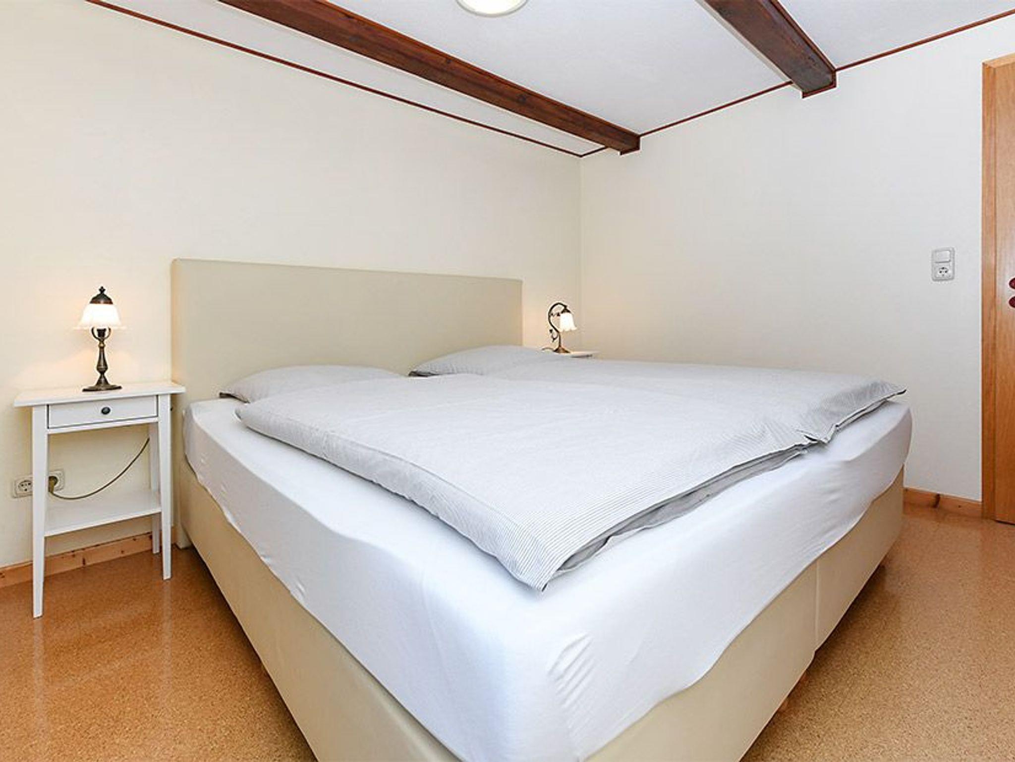 Größe ca. 60 Quadratmeter, Wohnraum mit integrierter Küche, Schlafzimmer, zweites separates Schlafzimmer/Kinderzimmer, Badezimmer mit Dusche, Waschtisch und WC, Obergeschoss, optimal für 2 bis 4 Personen.