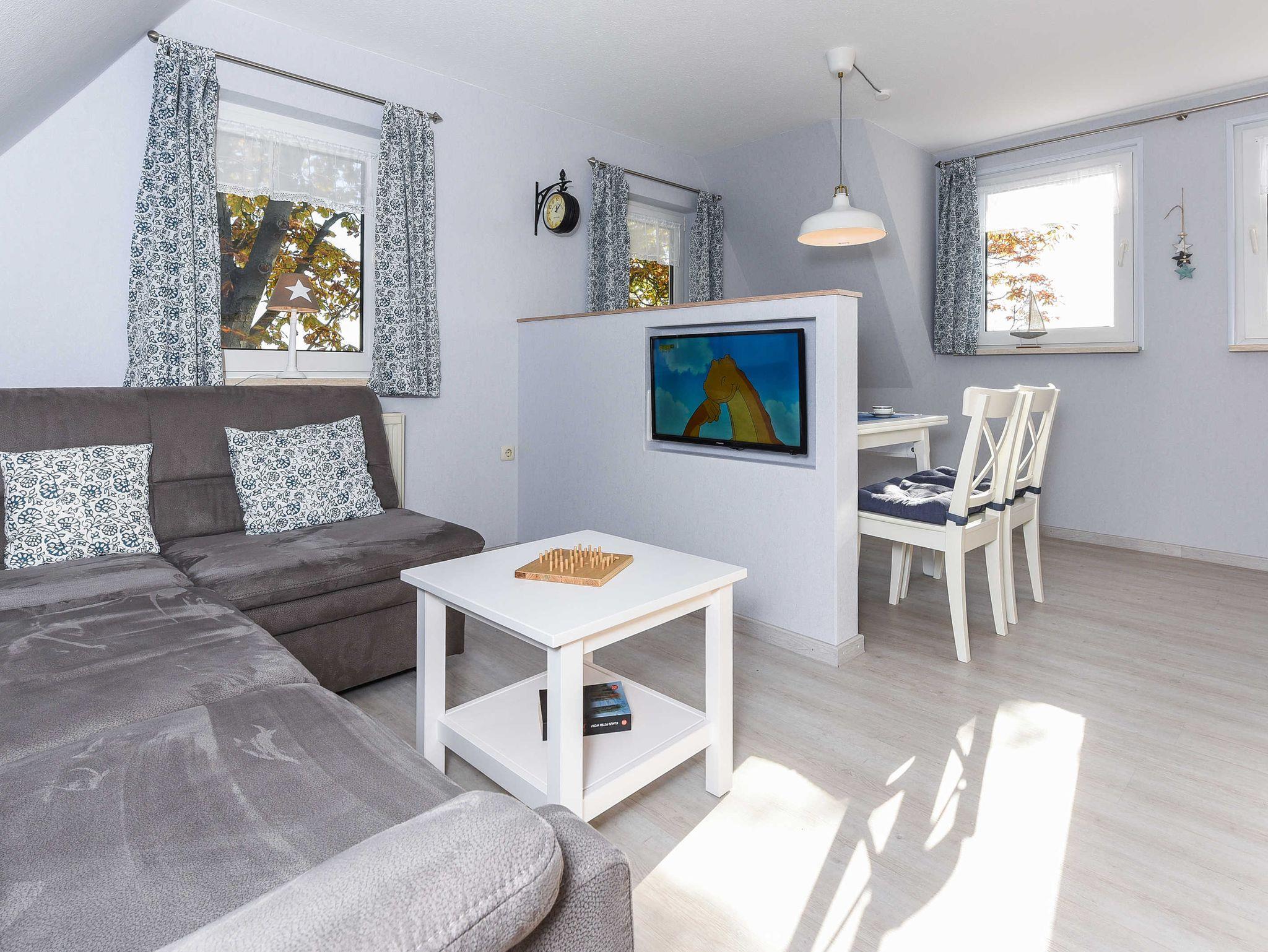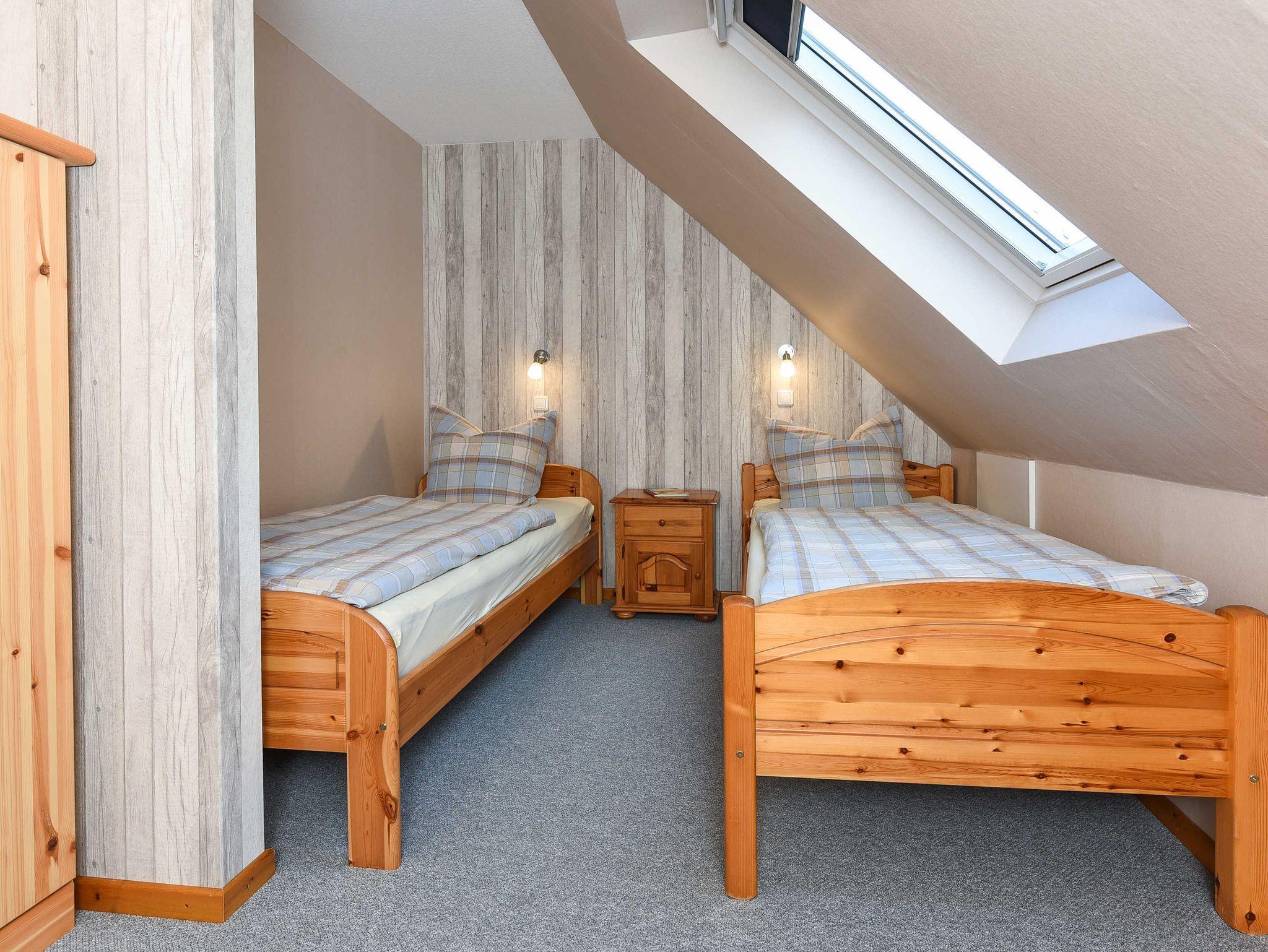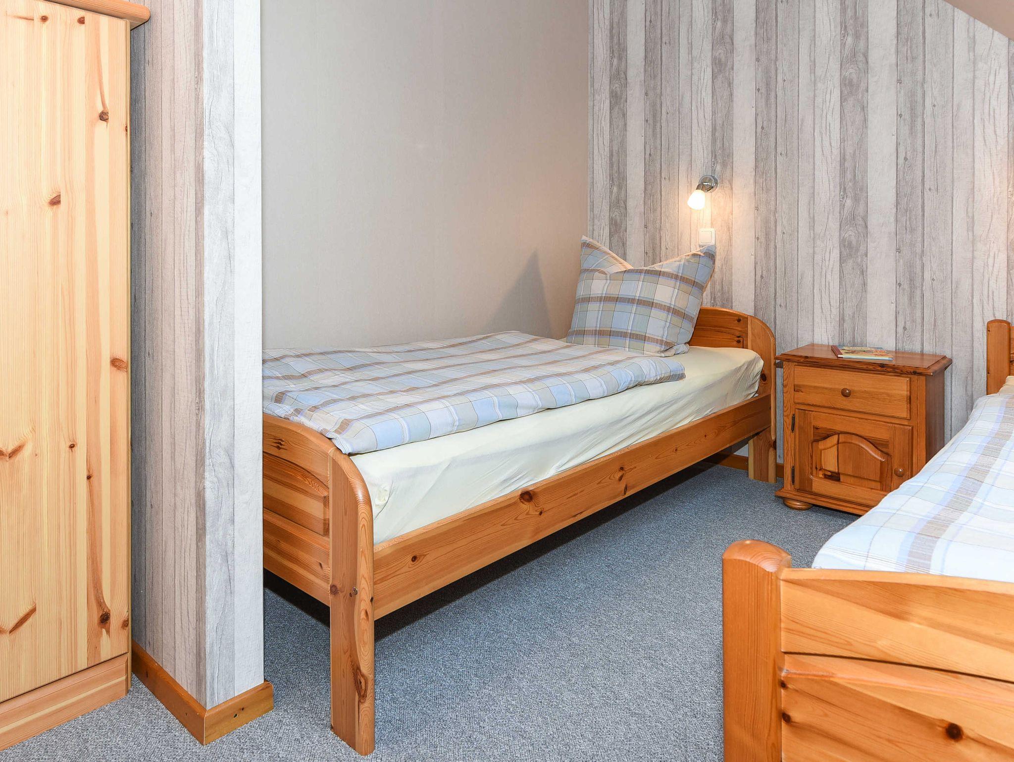 Größe ca. 65 Quadratmeter, Wohnraum mit integrierter Küche, Schlafzimmer, zweites separates Schlafzimmer, Badezimmer mit Dusche, Waschtisch und WC, Obergeschoss, Parkplatz (reserviert), optimal für 2 bis 4 Personen.