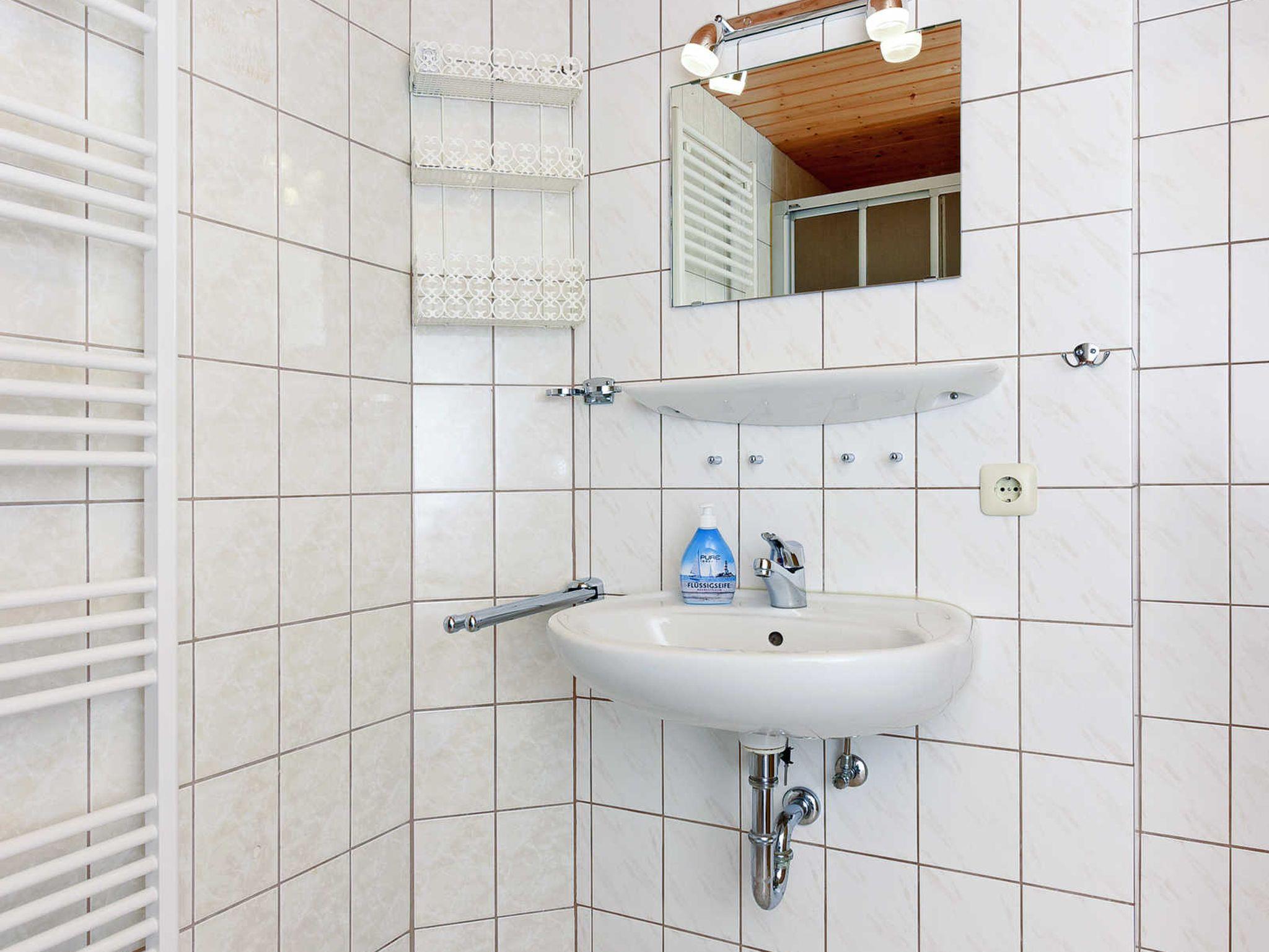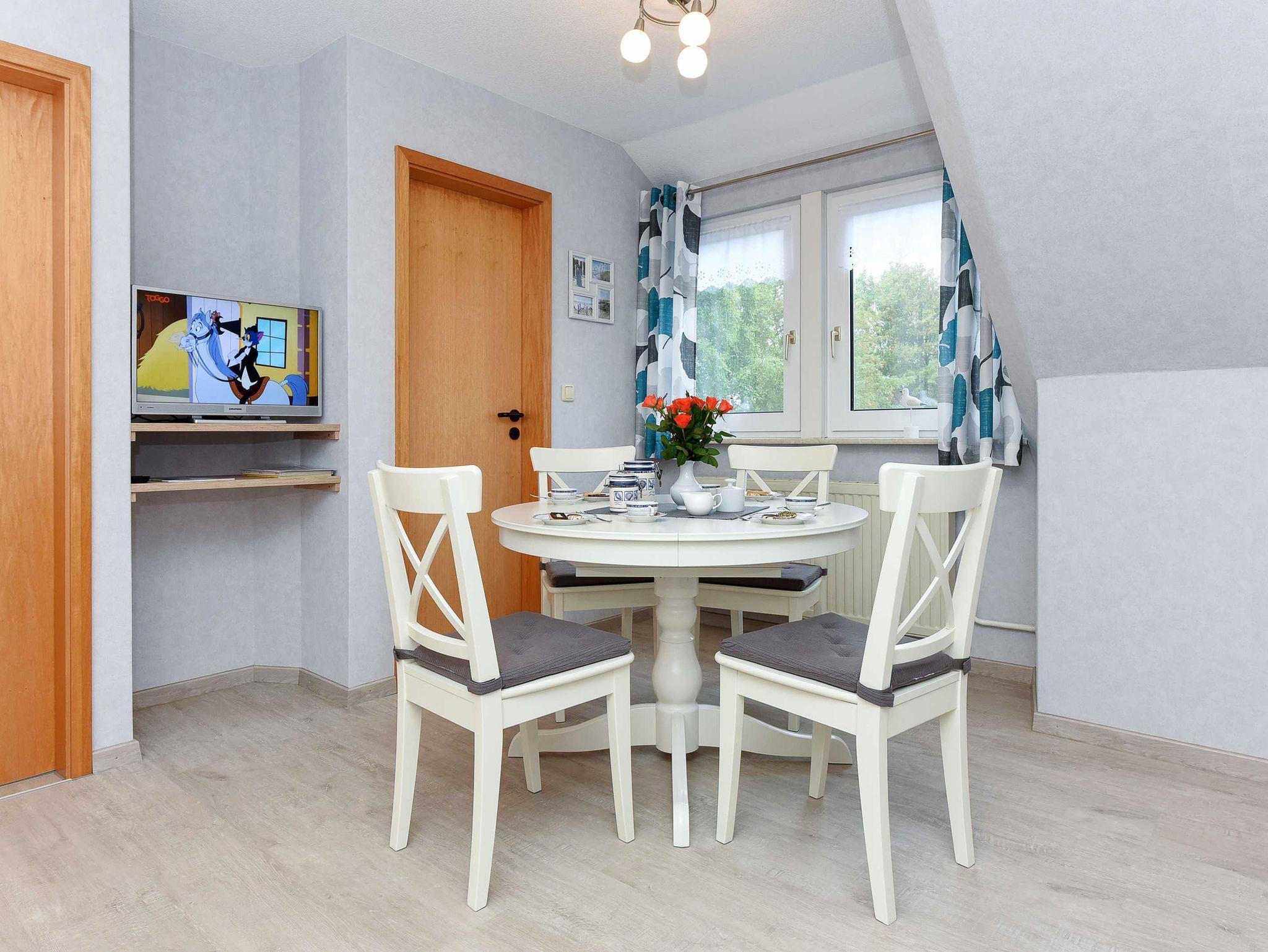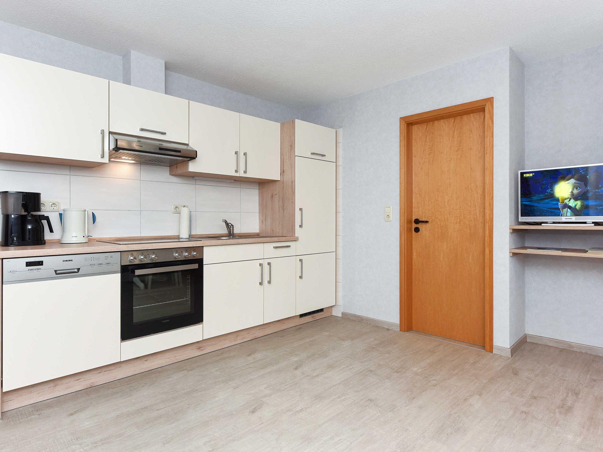 Größe ca. 60 Quadratmeter, Wohnraum mit integrierter Küche, Schlafzimmer, zweites separates Schlafzimmer, Badezimmer mit Dusche, Waschtisch und WC, Obergeschoss, Parkplatz (reserviert), optimal für 2 bis 4 Personen.