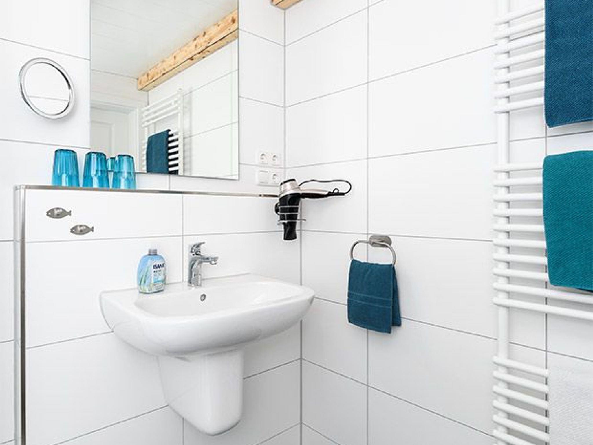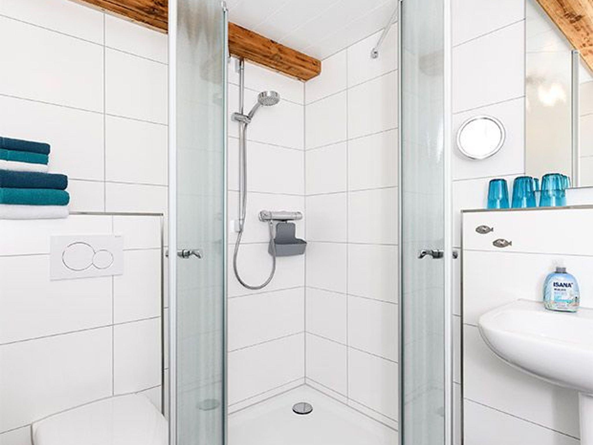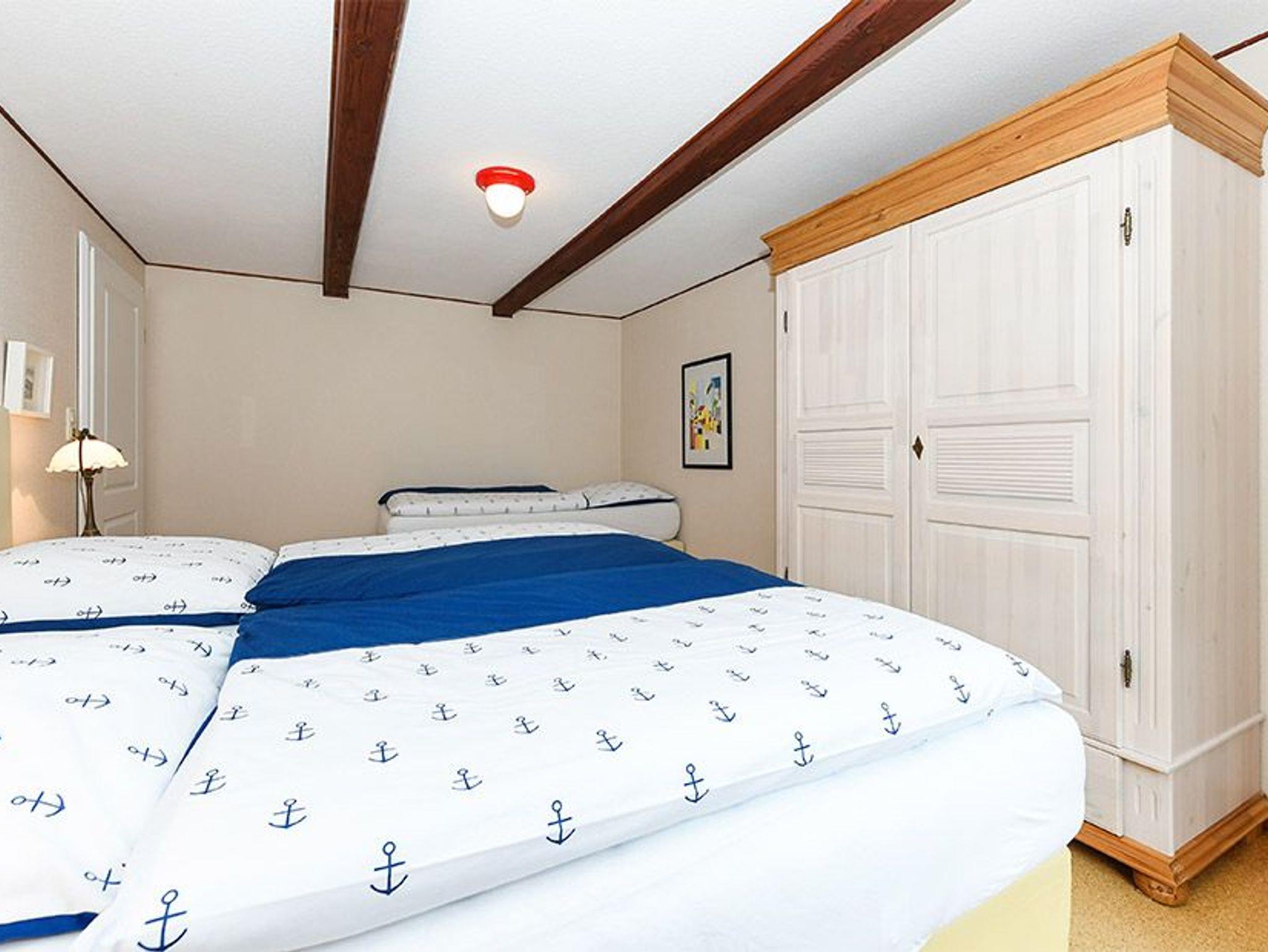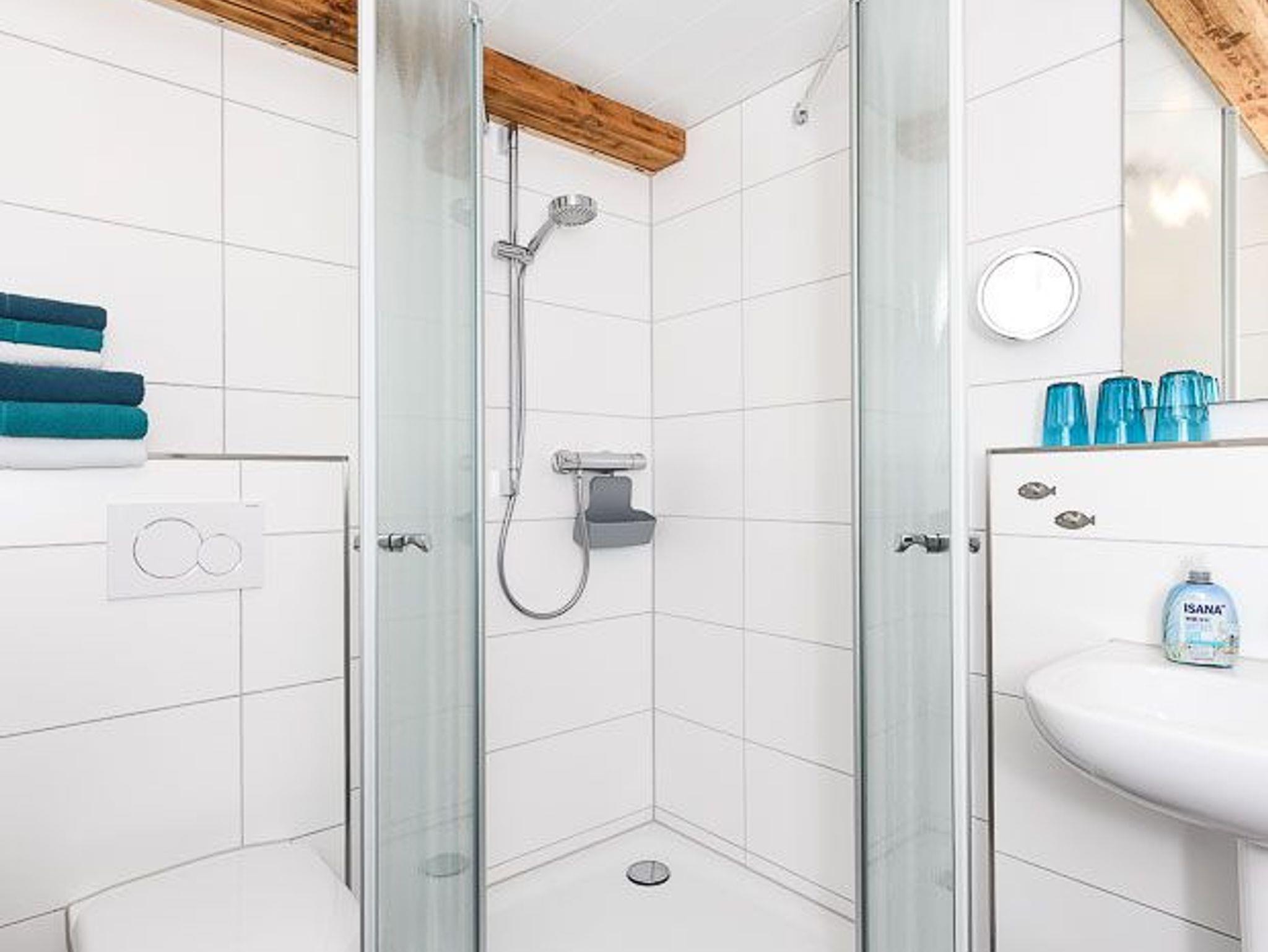 Größe ca. 60 Quadratmeter, Wohnraum mit integrierter Küche, Schlafzimmer, zweites separates Schlafzimmer/Kinderzimmer, Badezimmer mit Dusche, Waschtisch und WC, Obergeschoss, optimal für 2 bis 5 Personen.