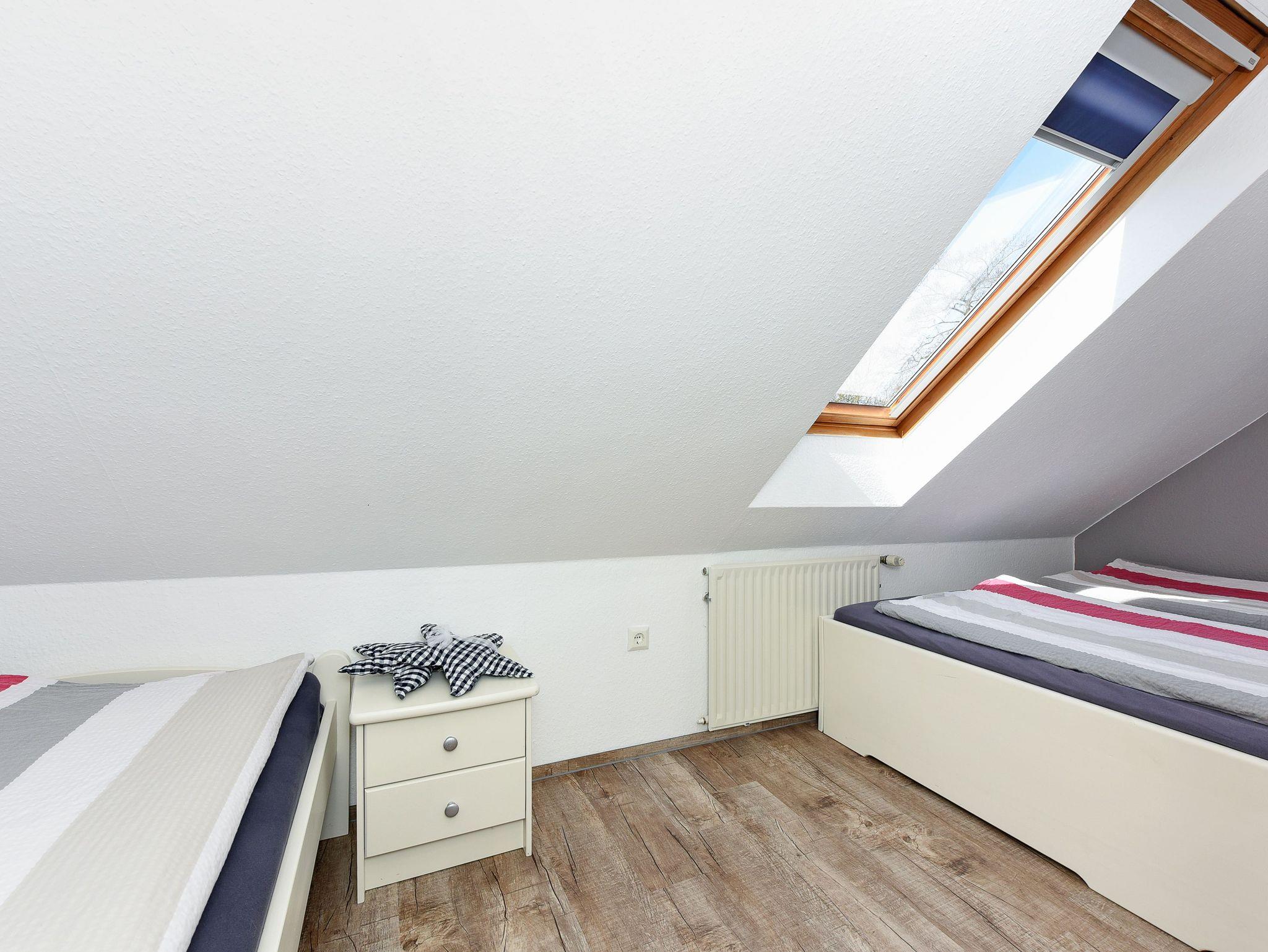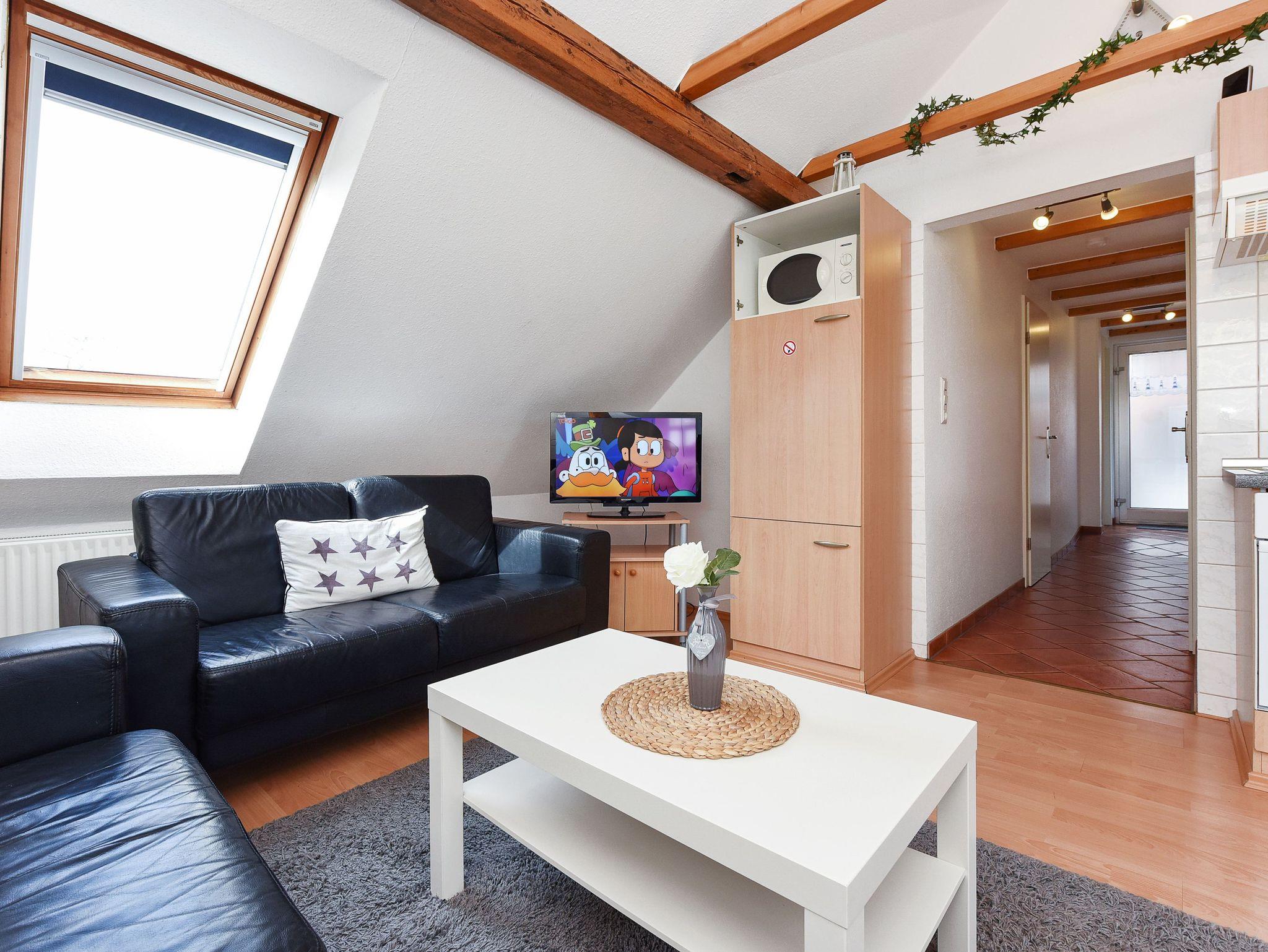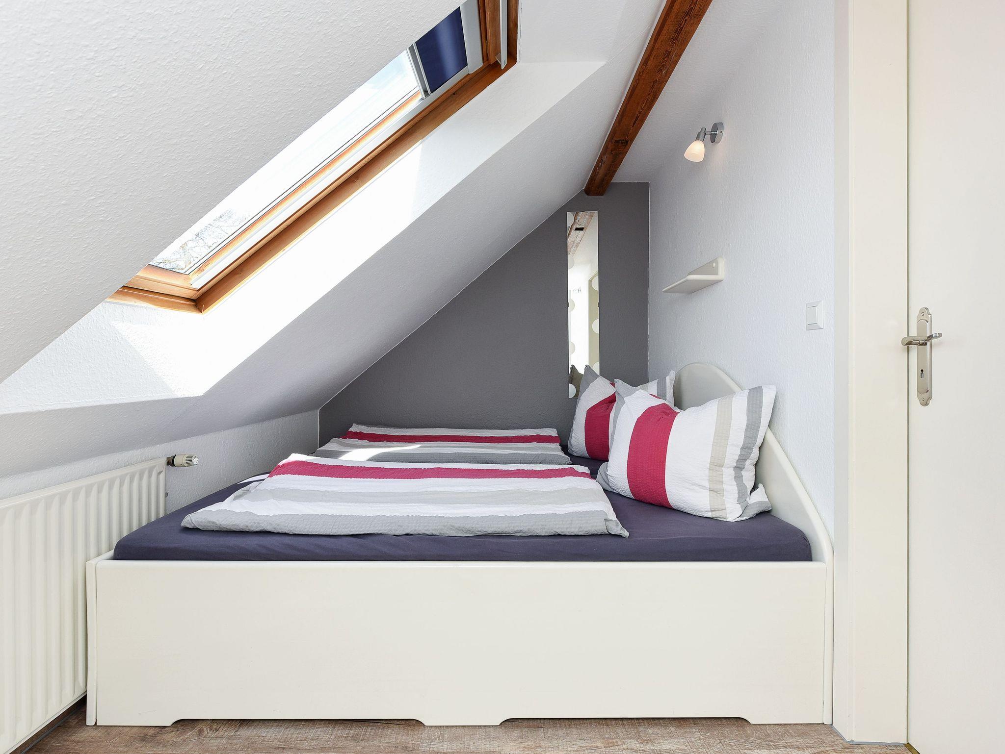 Größe ca. 60 Quadratmeter, Wohnraum mit integrierter Küche, Schlafzimmer, zweites separates Schlafzimmer/Kinderzimmer, Badezimmer mit Dusche, Waschtisch und WC, Obergeschoss, Gartennutzung, Waschmaschine, optimal für 2 bis 4 Personen und zusätzlich ein Kleinkind.