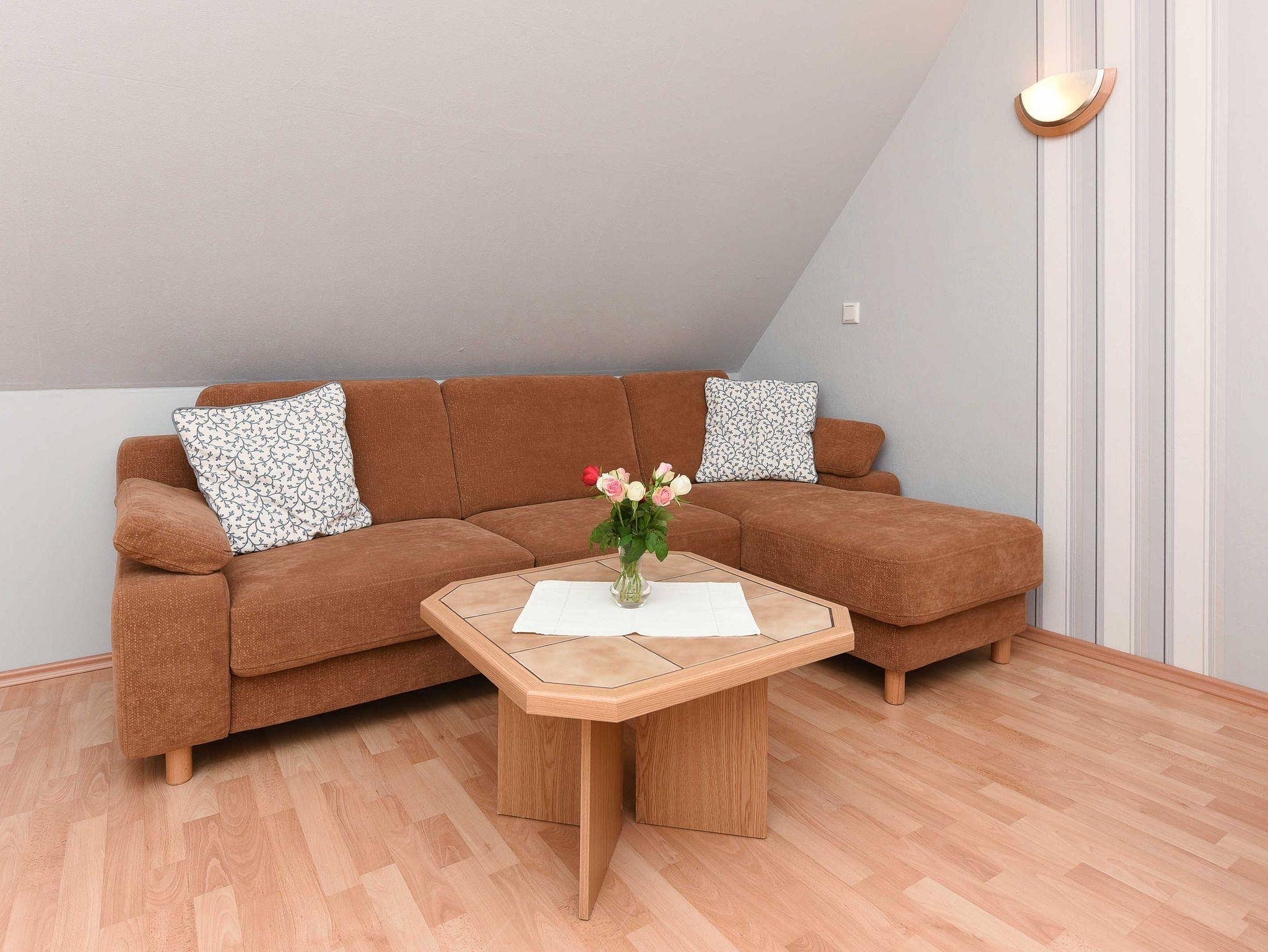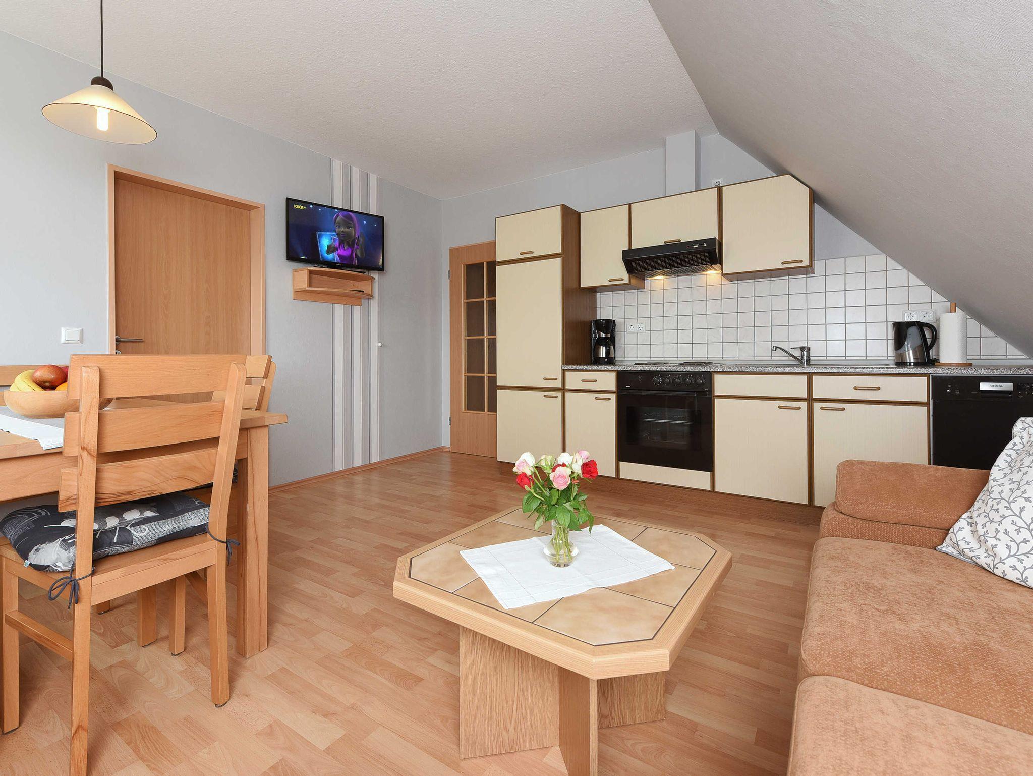 Größe ca. 60 Quadratmeter, Wohn-Küche, Schlafzimmer, Kinderzimmer, Badezimmer mit Dusche, Waschtisch und WC, Obergeschoss, Terrasse im Garten, Parkplatz (reserviert), optimal für 2 bis 4 Personen und zusätzlich ein Kleinkind.