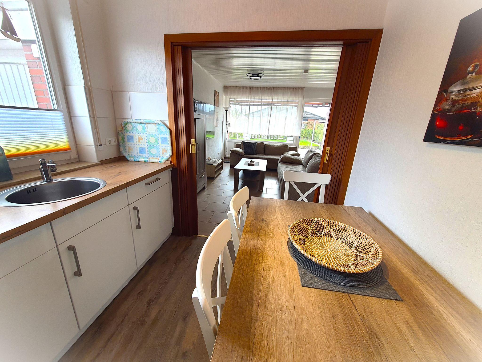 Übernachten im Bungalow mit Terrasse und Garten für 4 Personen. Das Ferienhaus verfügt über 2 separate Schlafzimmer, Wohnzimmer und Küche, sowie Badezimmer. Das Wohnzimmer ist ist mit einer Couch, Smart-TV und Internetradio ausgestattet. Die Küche mit Essecke verfügt über alle Küchengeräte für Ihren erholsamen Urlaub. Vom Wohnbereich geht aus auf die Terrasse mit angrenzender Liegewiese. Hunde sind erlaubt, bitte bei Buchung mit angeben.