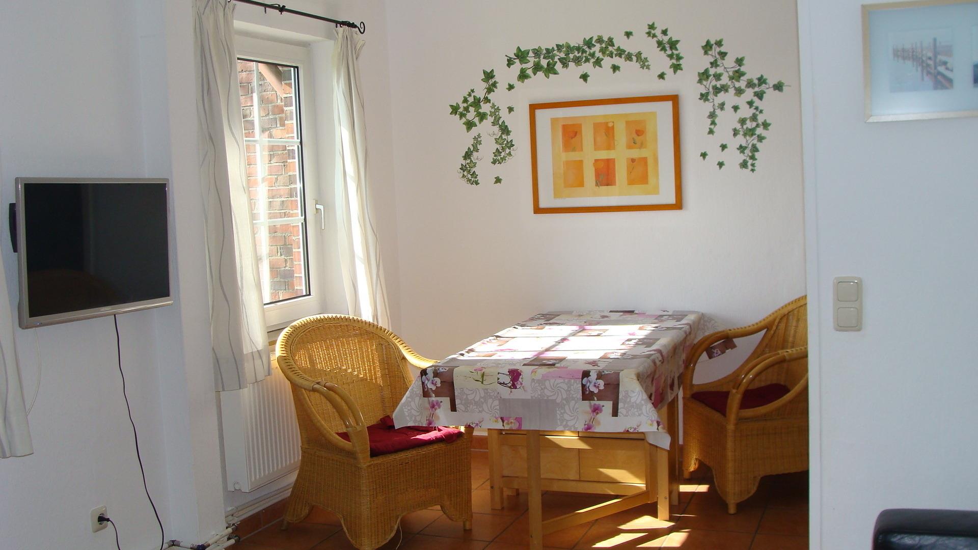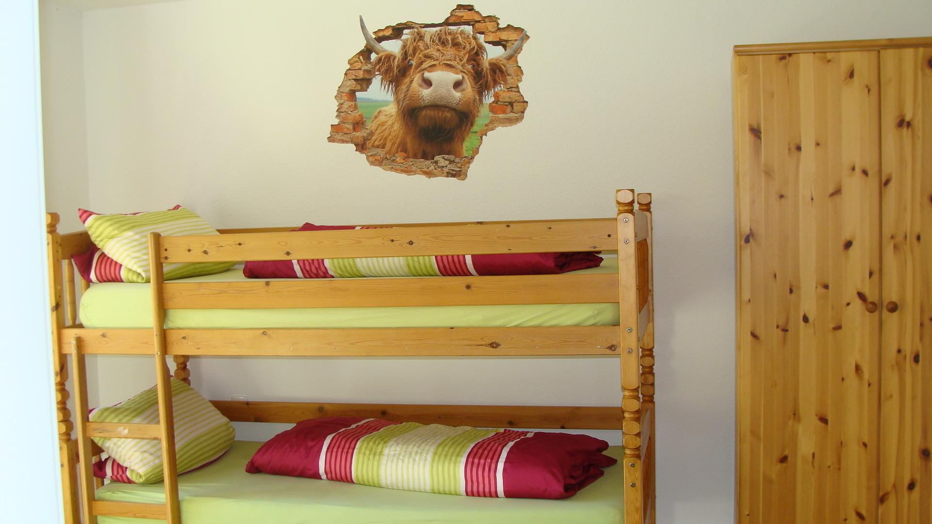 Die ebenerdige Wohnung im EG verfügt über drei Schlafzimmer, ein Wohnzimmer, eine Küche mit Hintertür in den Garten und ein geräumiges Badezimmer, mit Dusche und zwei Waschbecken. Eines davon ist als Kinderwaschbecken etwas niedriger angebracht. Ein Elternschlafzimmer mit Doppelbett und das Kinderzimmer liegen zur Südseite und haben eine Verbindungstür. Das Kinderzimmer ist mit einem Schlafsofa und einem Etagenbett ausgestattet. Das dritte Schlafzimmer liegt zur Nord-/Ostseite neben der Küche und verfügt über ein Doppelbett. Kinderbetten können dazu gebucht werden. Alle Schlafzimmer sind mit einem Kleiderschrank ausgestattet.