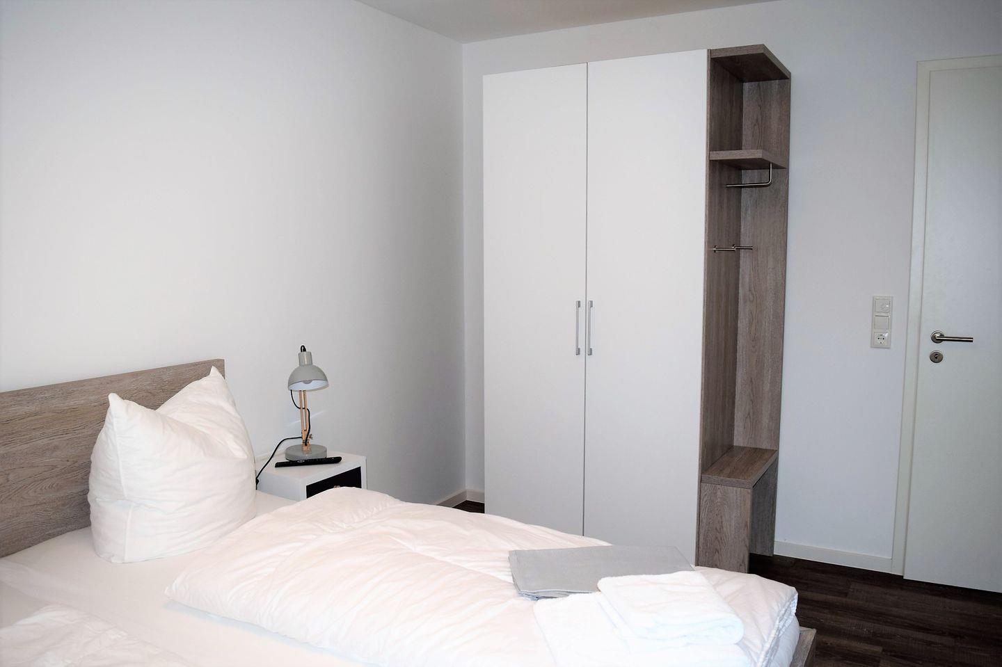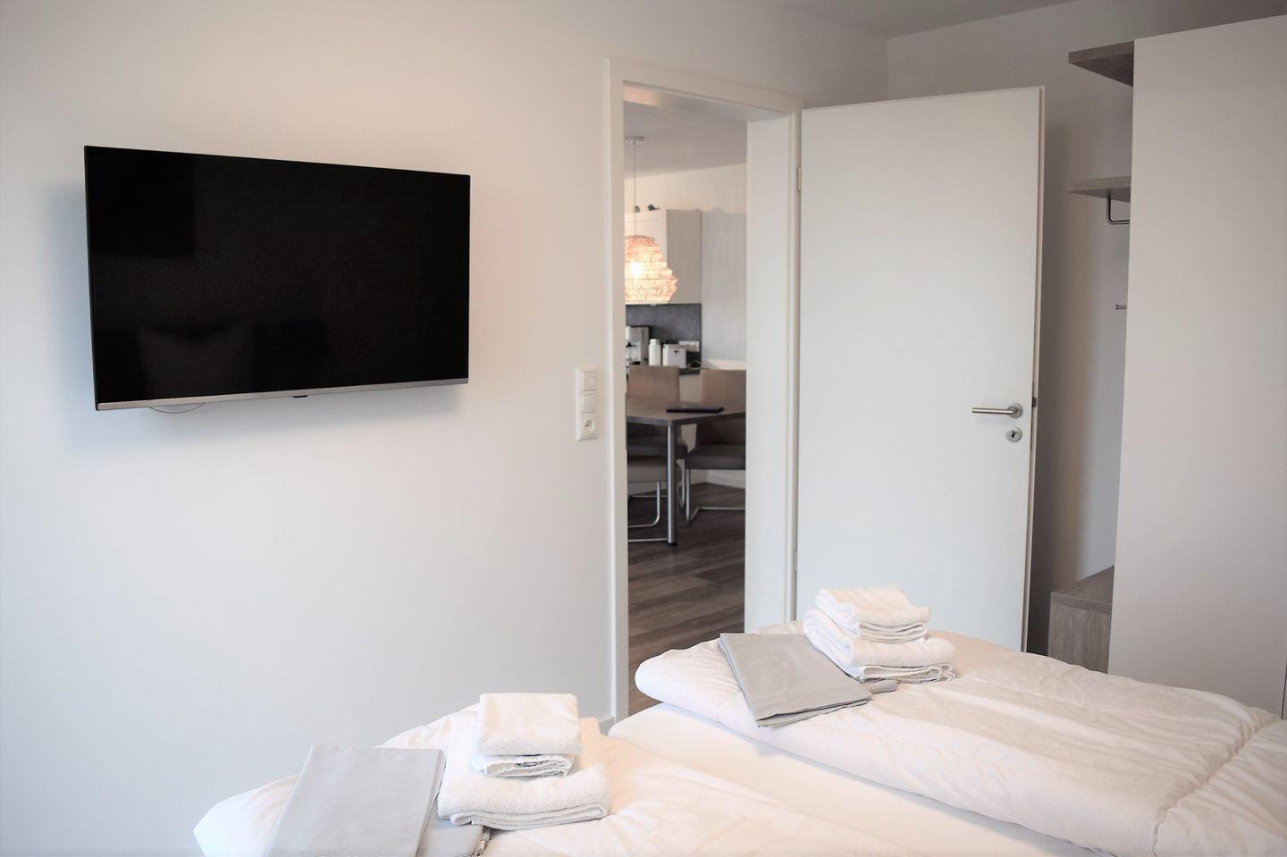 In jedem Schlafzimmer steht Ihnen ein Doppelbett mit Nachtkonsolen, ein Kleiderschrank und ein Fernseher zur Verfügung.
