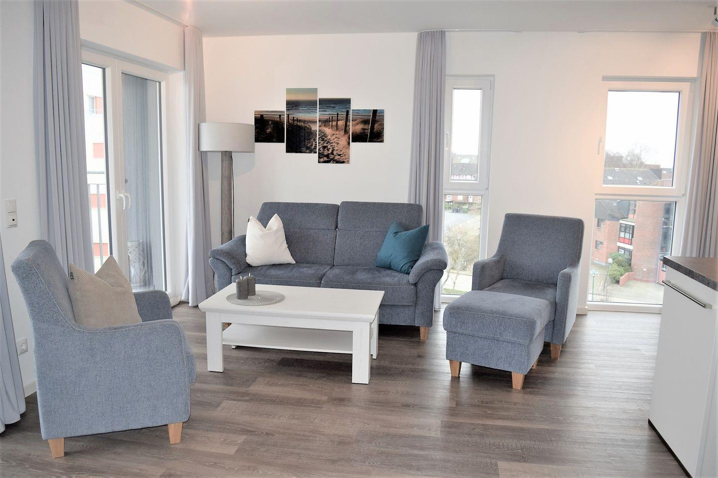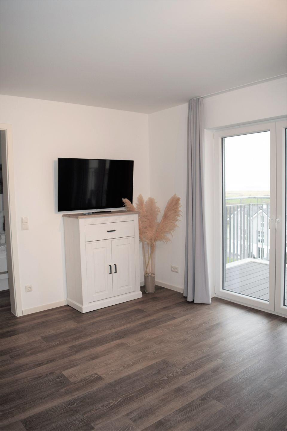 Ein großzügiger, möblierter und überdachter, nach Norden ausgerichteter Balkon bietet Ihnen einen wunderbaren Blick auf das Wattenmeer und lädt zum Verweilen ein.