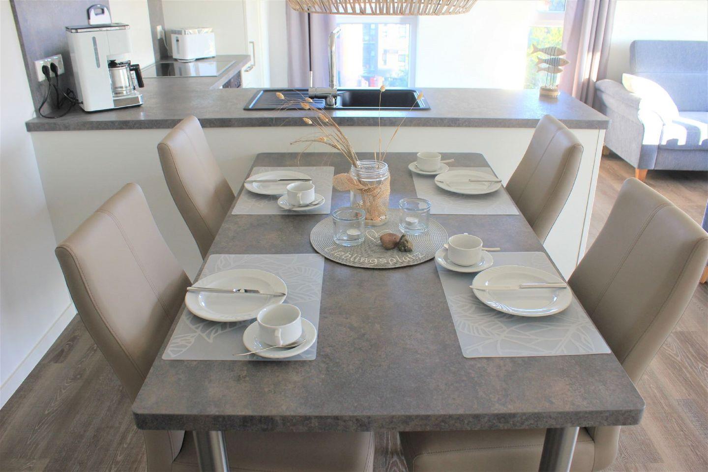 Ausgestattet mit einer gemütlichen Sofaecke besticht der Wohnbereich durch seine integrierte Küchenzeile, seinem großzügigen Essbereich mit Tisch und vier Stühlen.