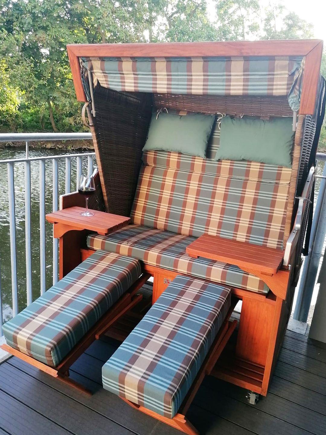 Ein großzügiger, möblierter und überdachter, nach Süden zum Wasserlauf ausgerichteter Balkon lädt zum Verweilen ein. Ein Strandkorb rundet hier das friesische Bild ab.