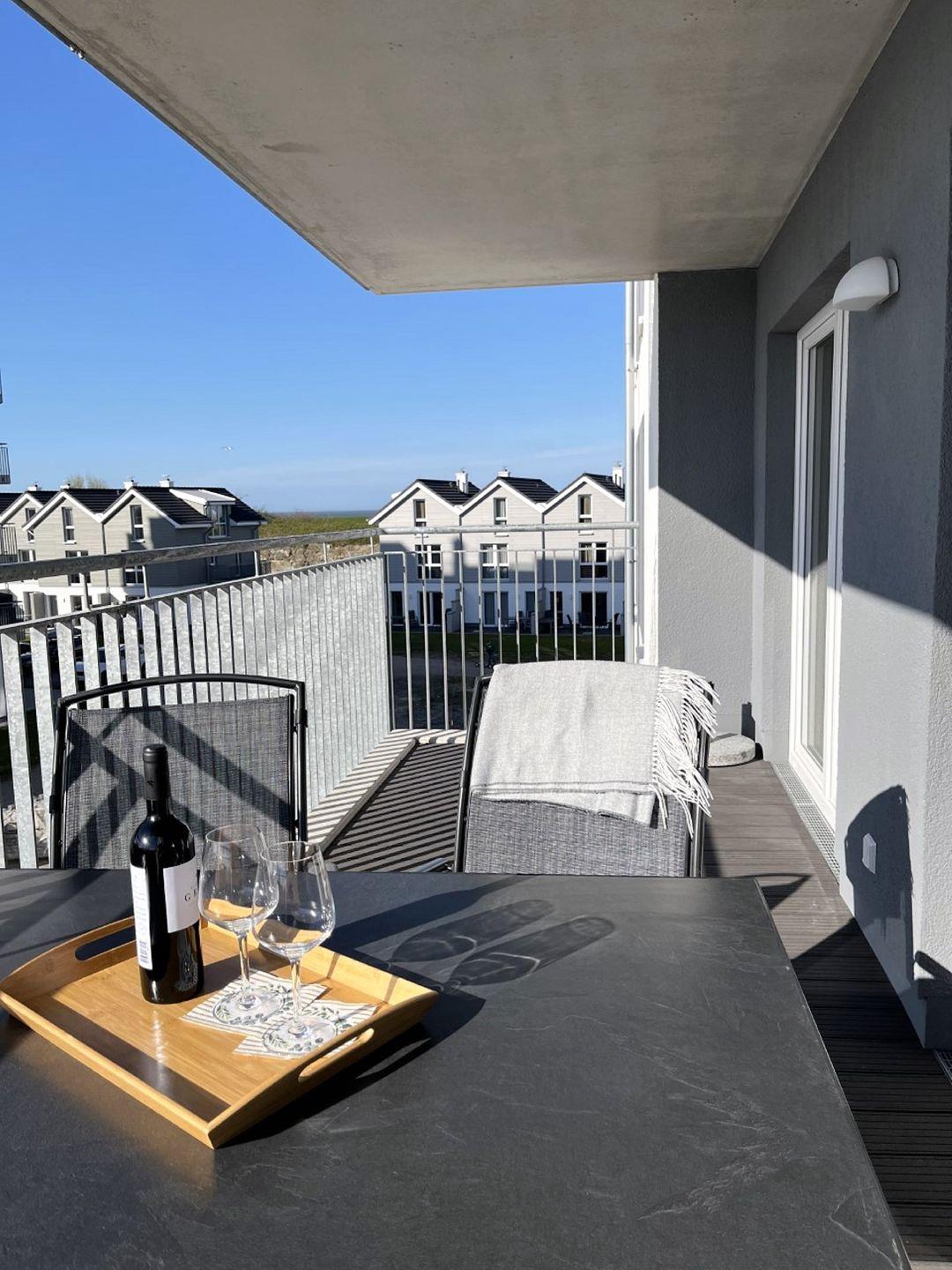 Ein großzügiger, möblierter und nach Westen ausgerichteter Balkon lädt zum Verweilen ein. Ein Strandkorb rundet das friesische Bild ab.