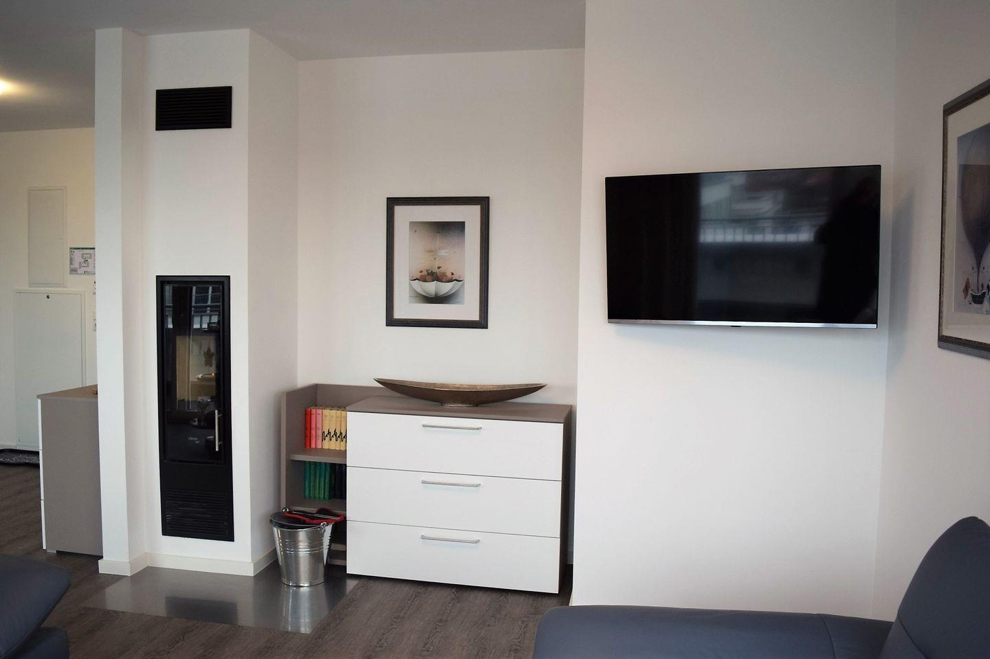 Der großzügige Wohn- Essbereich ist in warmen Farben möbliert und wird durch einen Kaminofen vollendet. Bei dem bekannten "friesischen Schietwetter" unterstreicht besonders dieser das gemütliche Ambiente.