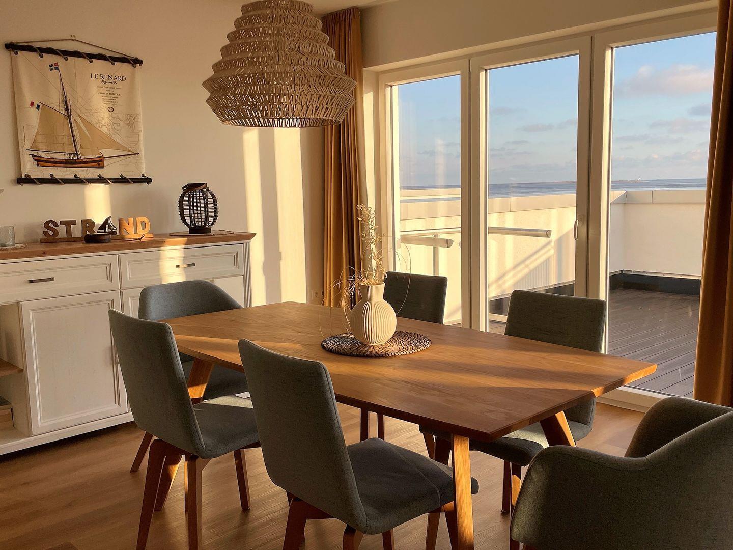 Vom großzügigen Esstisch aus, genießen Sie beim Speisen oder geselligen Beieinander einen herrlichen Ausblick auf das Wattenmeer!