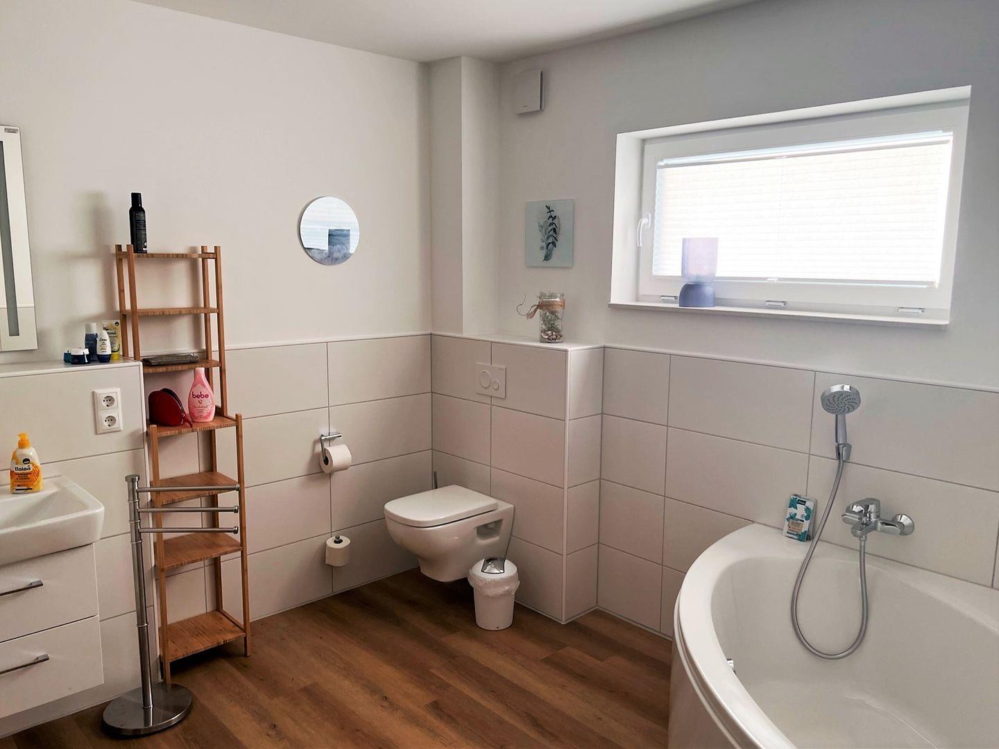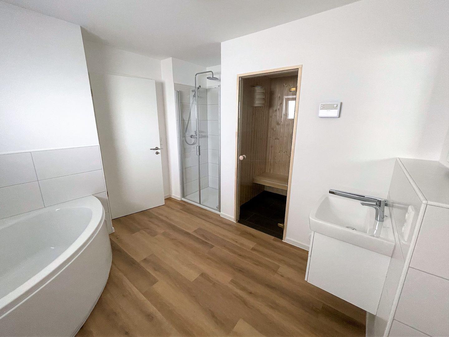 Das große Tageslicht Bad mit Sauna, verfügt über eine Regendusche und eine Badewanne und kann somit schnell zum Wellnesstempel werden! Saunadüfte für Ihre persönlichen Saunamomente können Sie an unserer Rezeption erwerben.