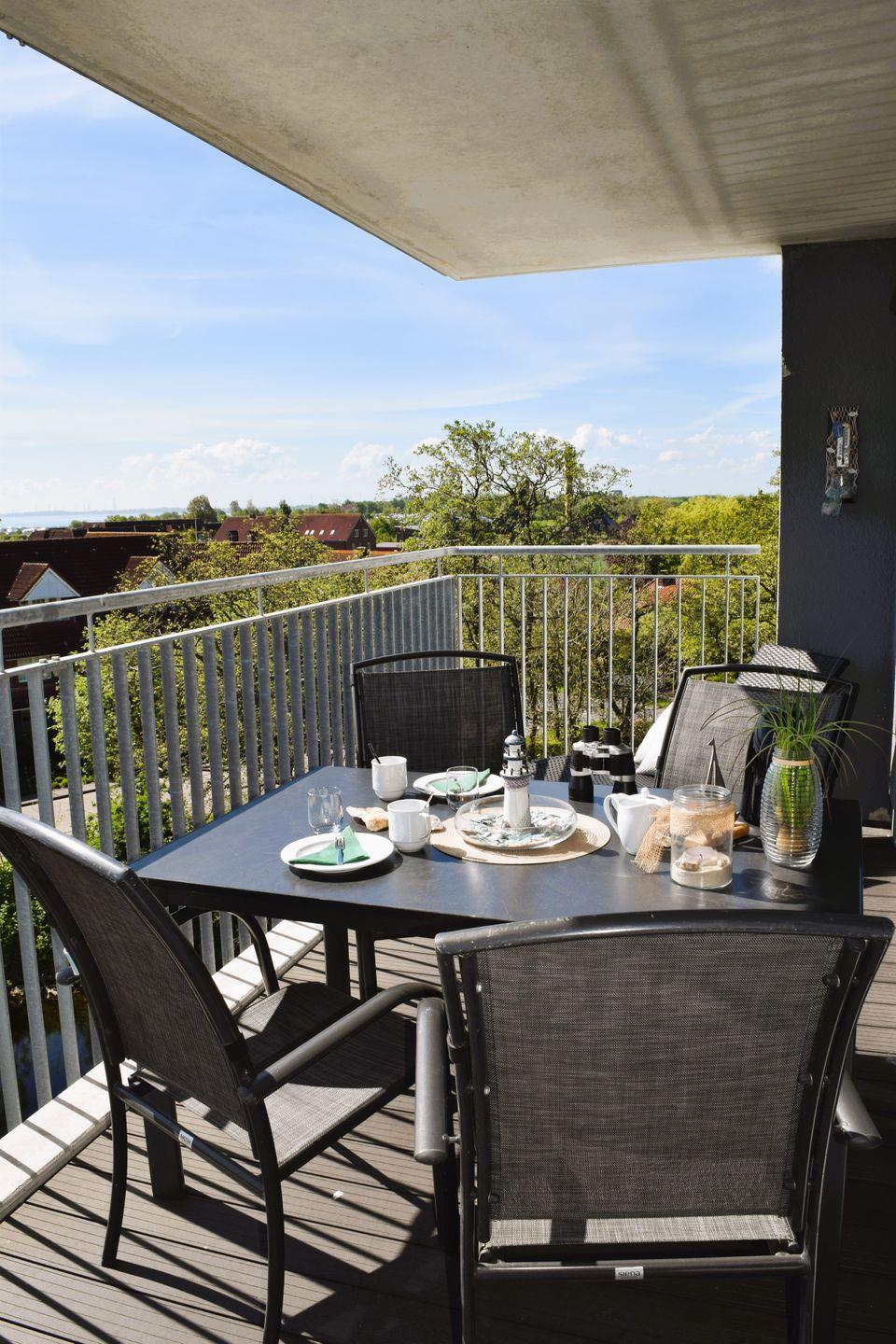 Ein großzügiger, möblierter und nach Osten ausgerichteter Balkon lädt zum Verweilen ein.