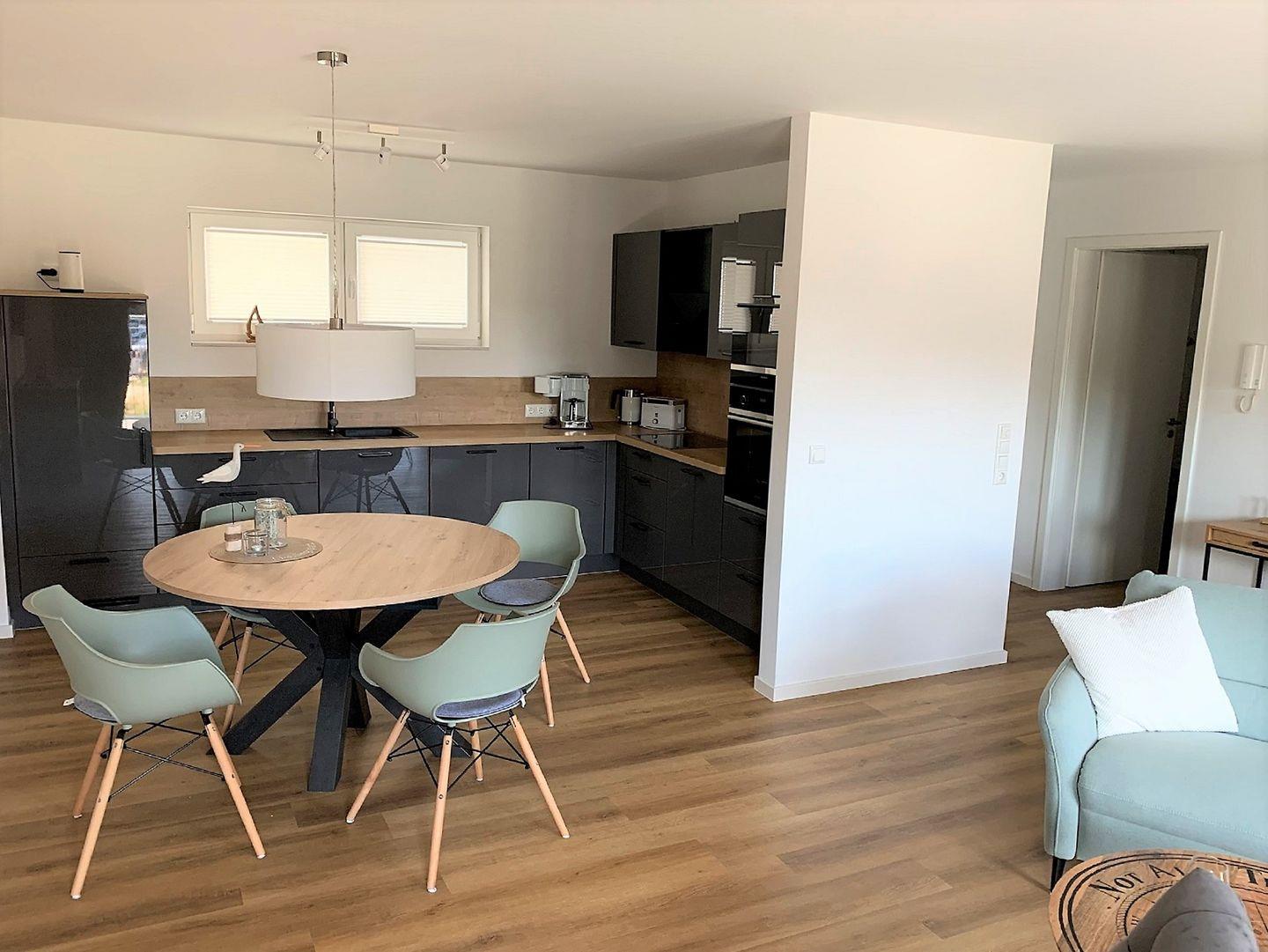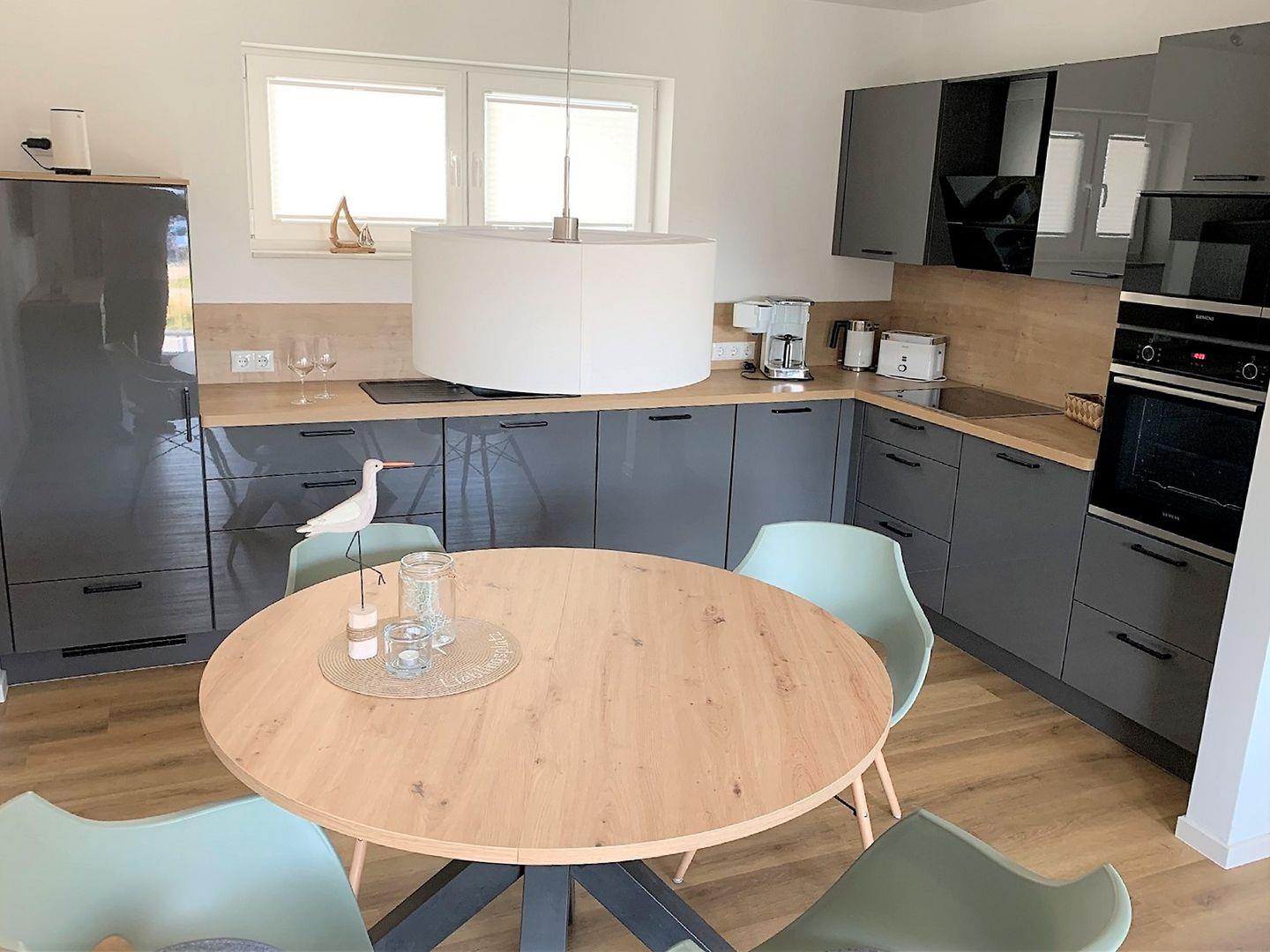 Der Küchenbereich ist modern und offen zum Wohn-Essbereich gehalten und mit einer hochwertigen Einbauküche ausgestattet.