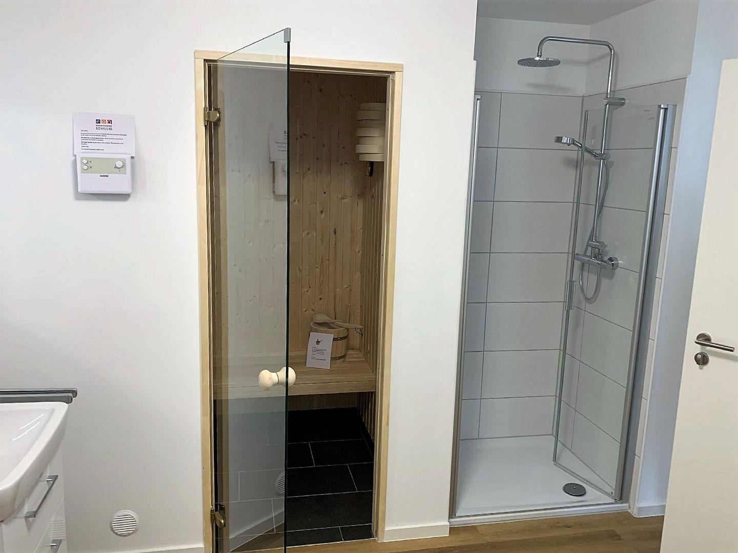 Eine Sauna, eine moderne Dusche und eine Badewanne bieten den nötigen Komfort zur Erholung.