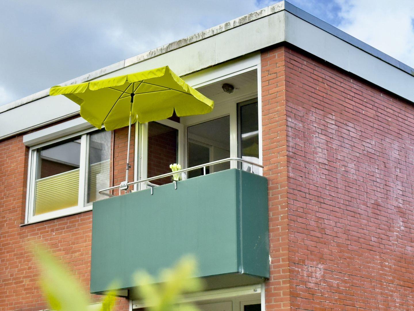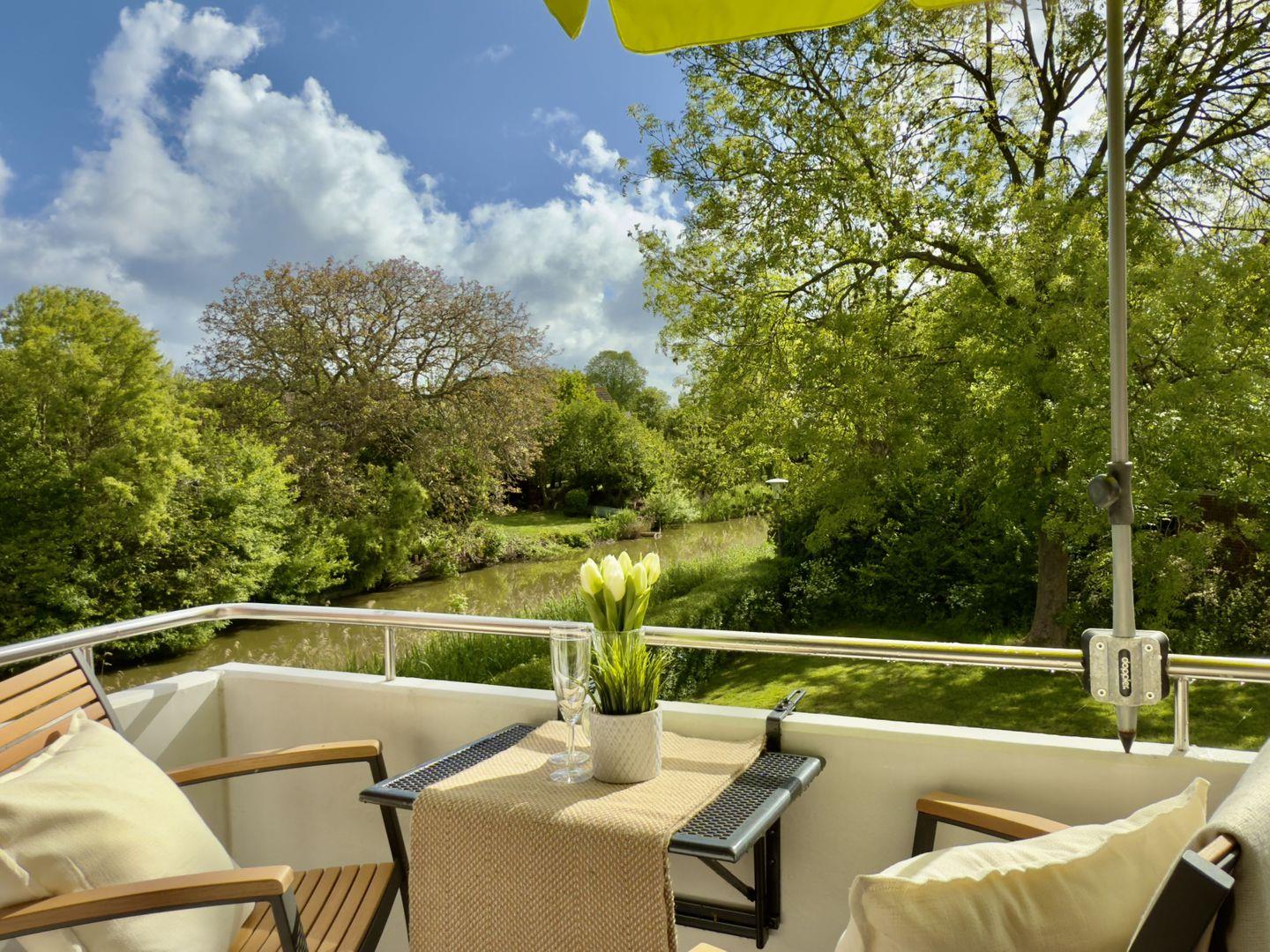 Der überdachte Balkon bietet einen traumhaften Blick ins Grüne.