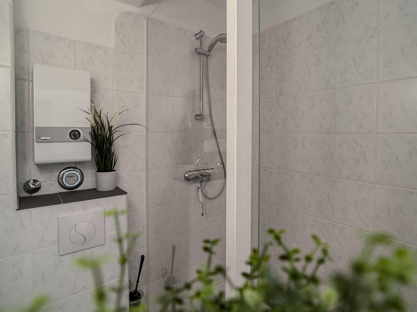 Das Badezimmer ist klein, aber fein und bietet alles, was Sie für Ihre tägliche Hygiene benötigen – von der Dusche bis hin zu den praktischen Ablagemöglichkeiten.