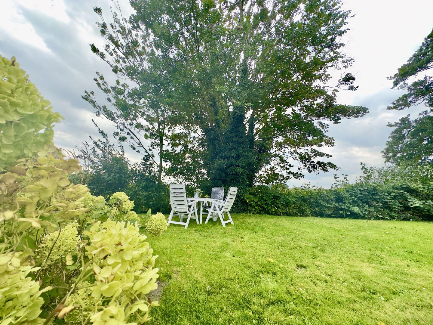 offenen Bereich der Küche . Das Esszimmer bietet Platz für 4 Personen. Im großen, hellen und freundlichen Wohnzimmer wird der Schlafbereich durch eine Kommode abgetrennt und lädt zu gemütlichen Abenden ein. Das dort befindliche Einzelbett verfügt über ein Ausziehbett. Im separaten Schlafzimmer mit großem Einbauschrank lädt ein großes Doppelbett zum erholsamen Schlaf ein. Das Badezimmer verfügt über eine große Eckbadewanne sowie einen großflächigen Spiegel. Der Gartenanteil verfügt über einen eigenen Terrassenbereich mit Gartenmöbeln.