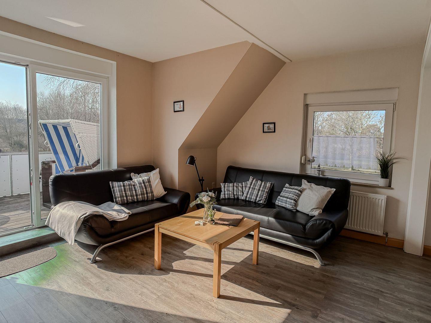 Über den seitlichen Eingang des Hauses erreichen Sie über die Steintreppe Ihre Ferienunterkunft. Der große und helle Wohn-/Essbereich bietet Platz für 4 Personen. Die gut ausgestattete Küche lädt zum gemeinsamen Kochen ein. Das Schlafzimmer bietet ein großes Doppelbett und einen geräumigen Kleiderschrank. Im zweiten Schlafzimmer befinden sich zwei Einzelbetten und ein Kleiderschrank. Das Tageslichtbad verfügt über eine Dusche und einen Wandspiegel. Der große Balkon lädt zu gemeinsamen Stunden im Strandkorb mit Blick auf den Kolk ein.