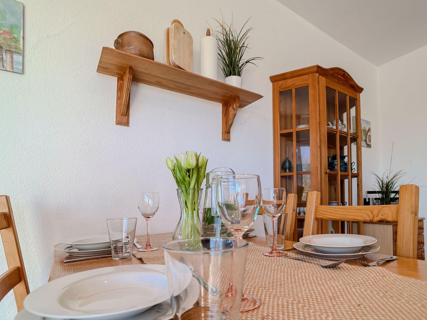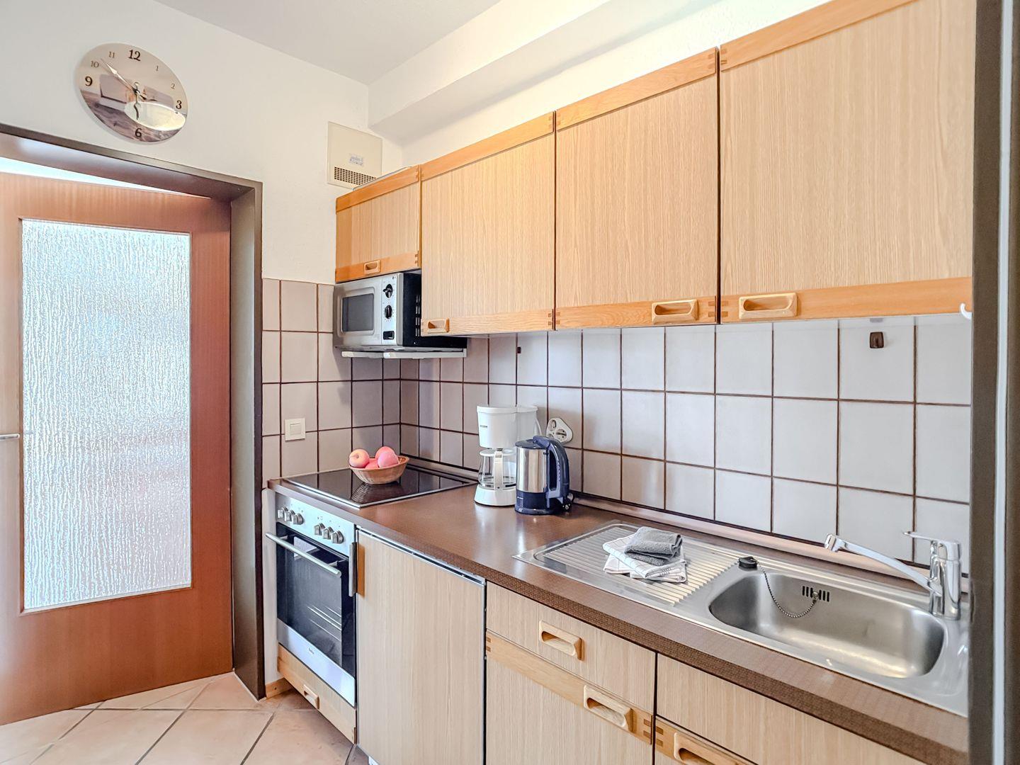 Direkt an das Wohnzimmer schließt sich die praktische Kochnische an, die mit allem ausgestattet ist, was Sie für eine Selbstversorgung benötigen. Vom Frühstückskaffee bis zum frischen Fischgericht am Abend – hier können Sie nach Lust und Laune kulinarisch kreativ werden.