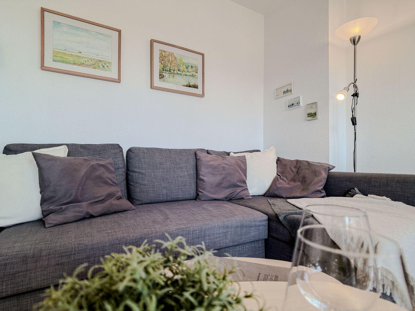 Das lichtdurchflutete Wohnzimmer ist das Herzstück der Wohnung. Durch die große Fensterfront fällt sanftes Tageslicht herein und taucht den Raum in eine warme, freundliche Atmosphäre. Machen Sie es sich auf dem Schaukelstuhl bequem, genießen Sie eine Tasse Tee oder lehnen Sie sich entspannt zurück und lassen Ihren Blick ins Grüne schweifen. Abends lädt das gemütliche Schlafsofa zum Fernsehen ein – und wird in der Nacht zu einer bequemen Schlafmöglichkeit für weitere Gäste.