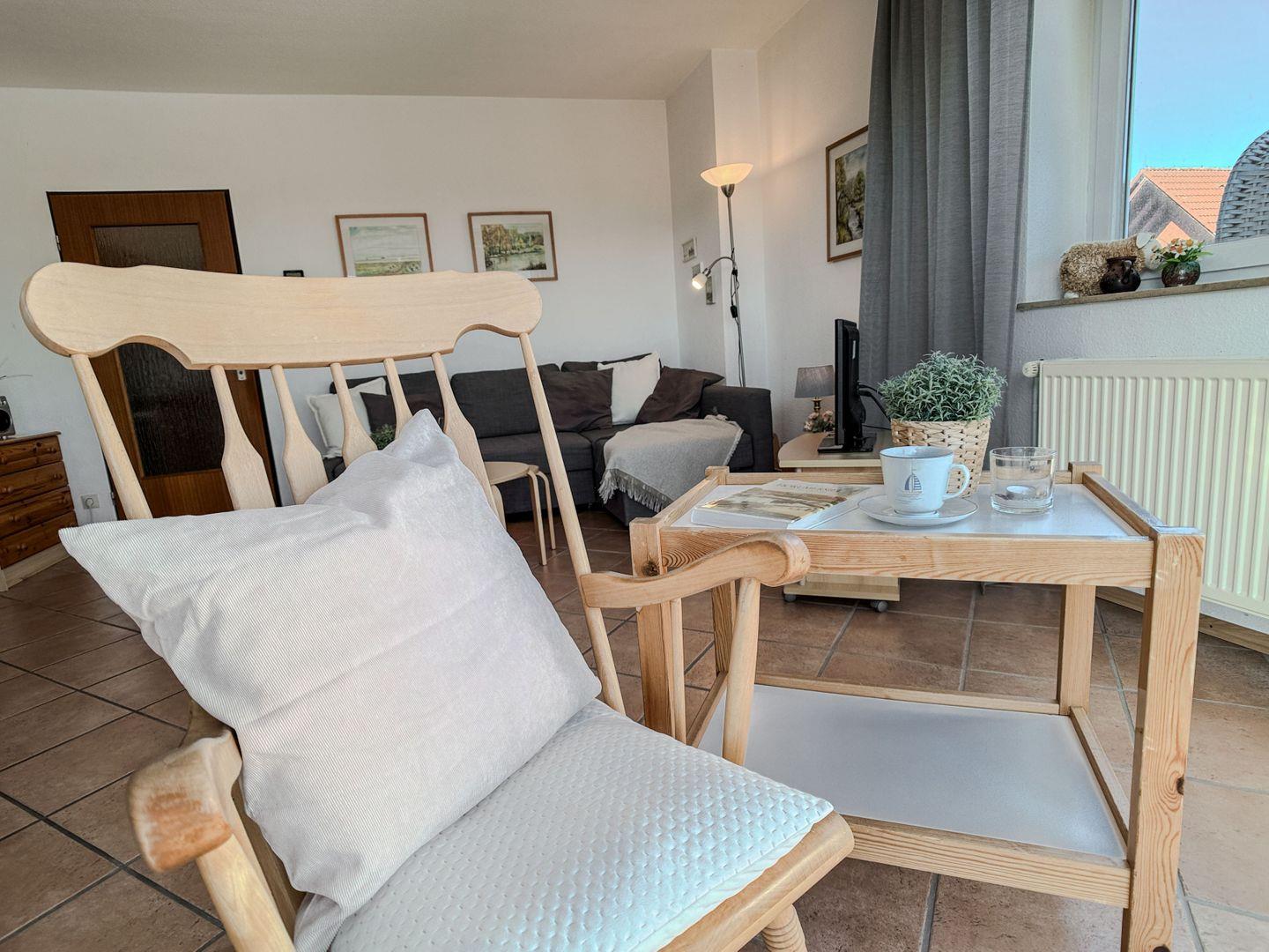 Willkommen in der Ferienwohnung Jadekieker! Auf 54 qm bietet sie Platz für bis zu 4 Personen und begeistert mit einem gemütlichen Wohnzimmer, heller Fensterfront, Schaukelstuhl und Schlafsofa.