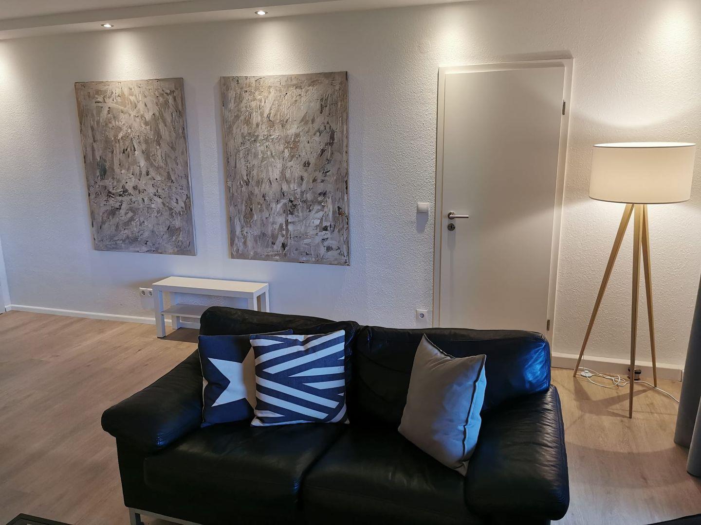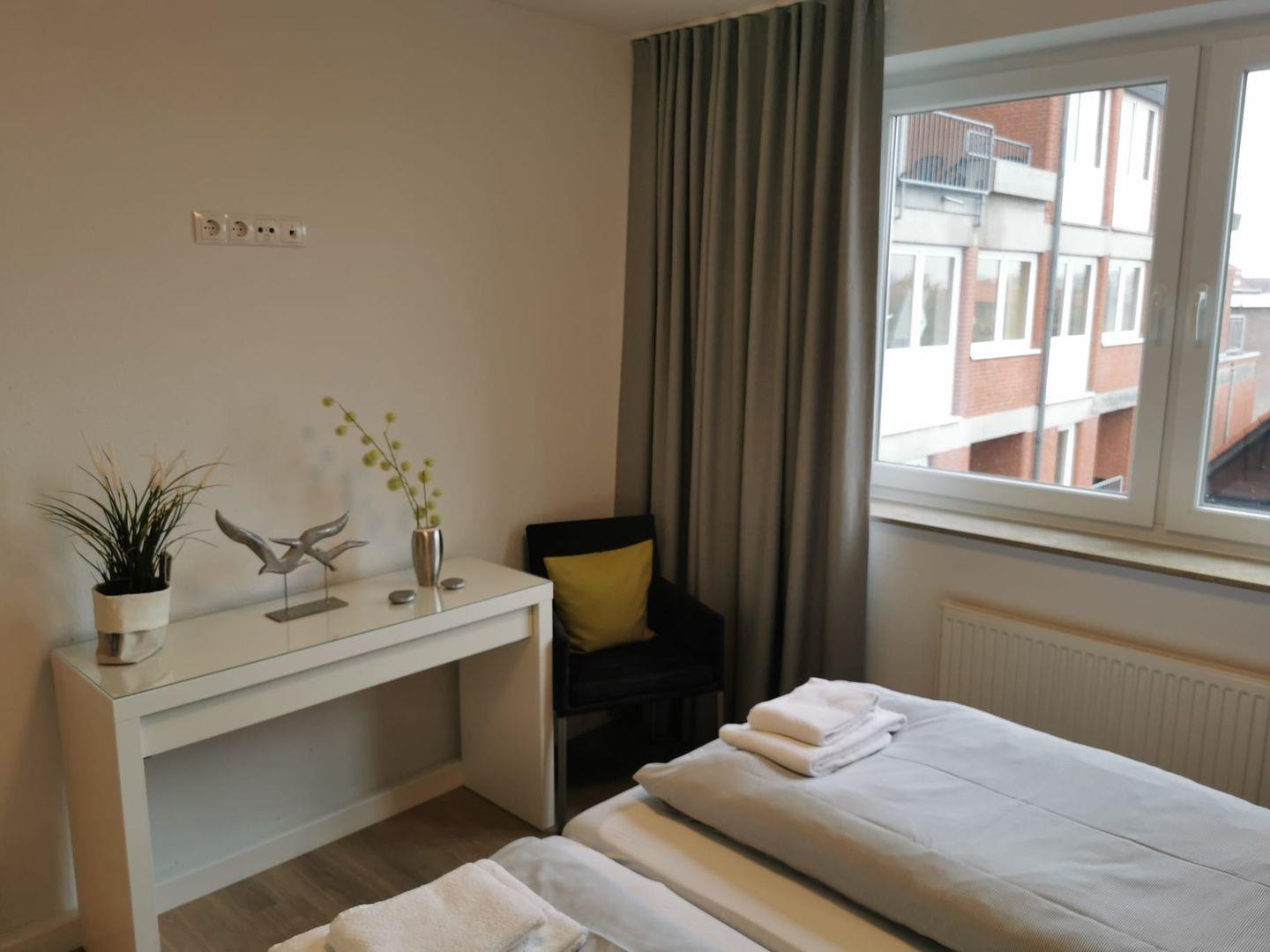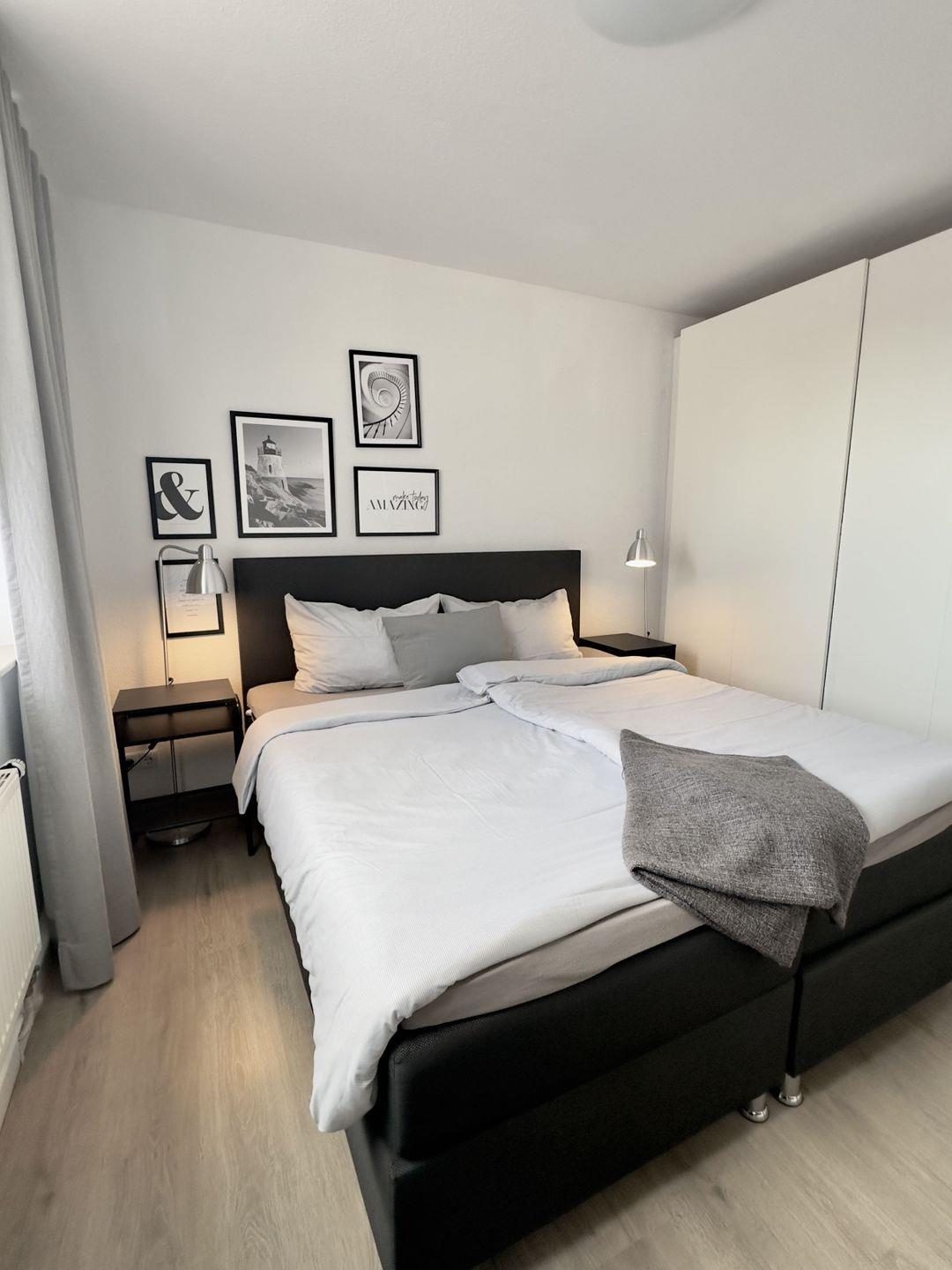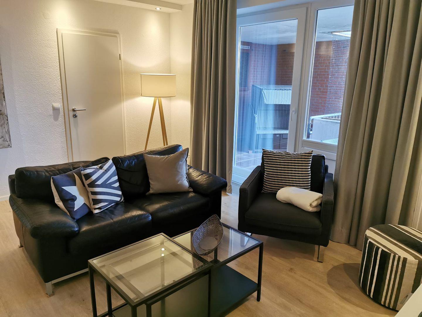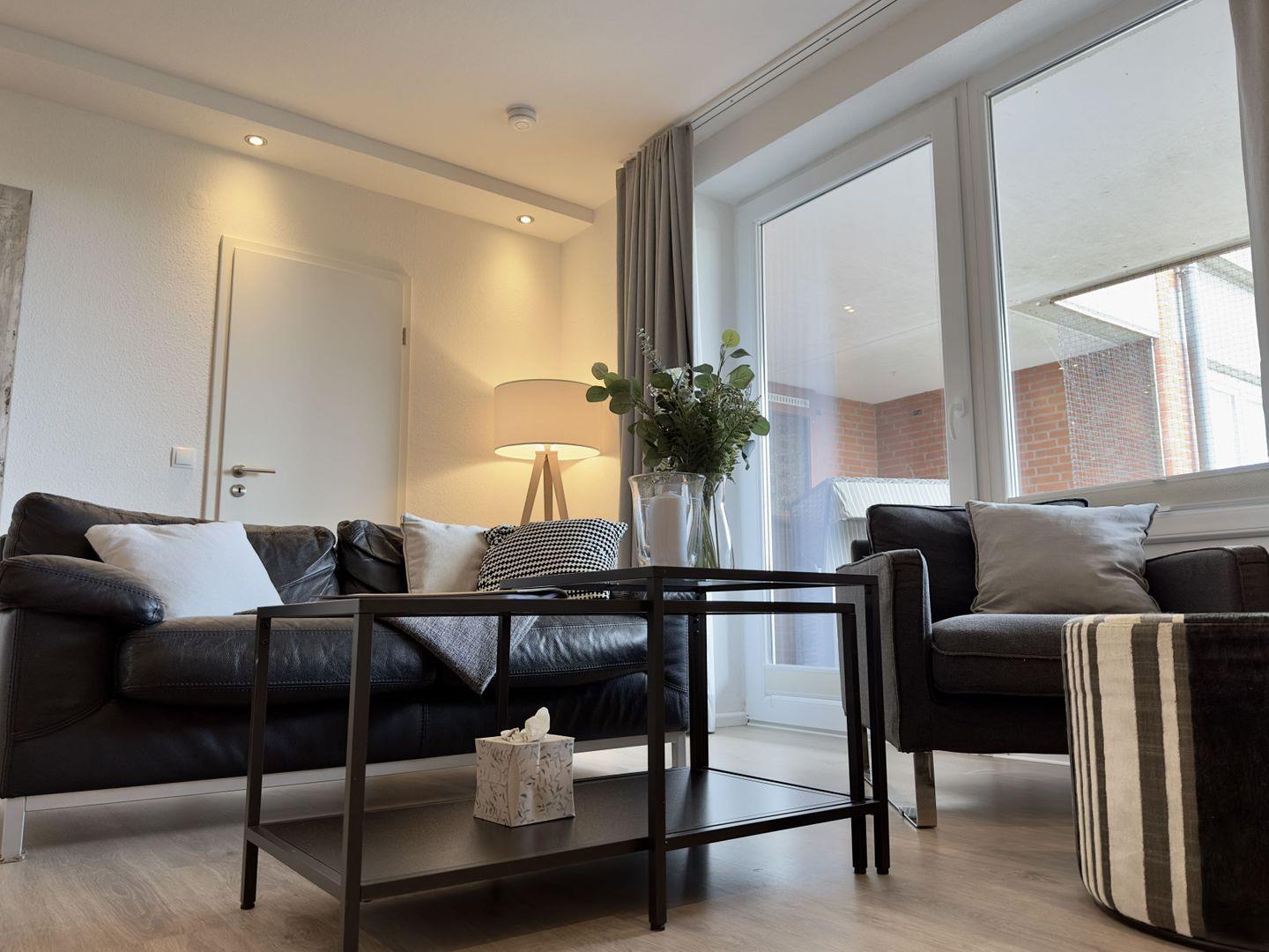 Die vollständig sanierte und renovierte Ferienwohnung verfügt über ein großzügiges Wohnzimmer mit gemütlicher Sitzecke in der modernen, offenen Küche. Vom Wohnzimmer aus erreichen Sie den großzügigen Balkon mit Blick auf die Nordsee, sowie die beiden Schlafzimmer und das moderne, große Badezimmer. Das Elternschlafzimmer verfügt über ein breites Doppelbett und einem integrierten, großen Kleiderschrank. Das zweite Schlafzimmer verfügt ebenfalls über ein Doppelbett.