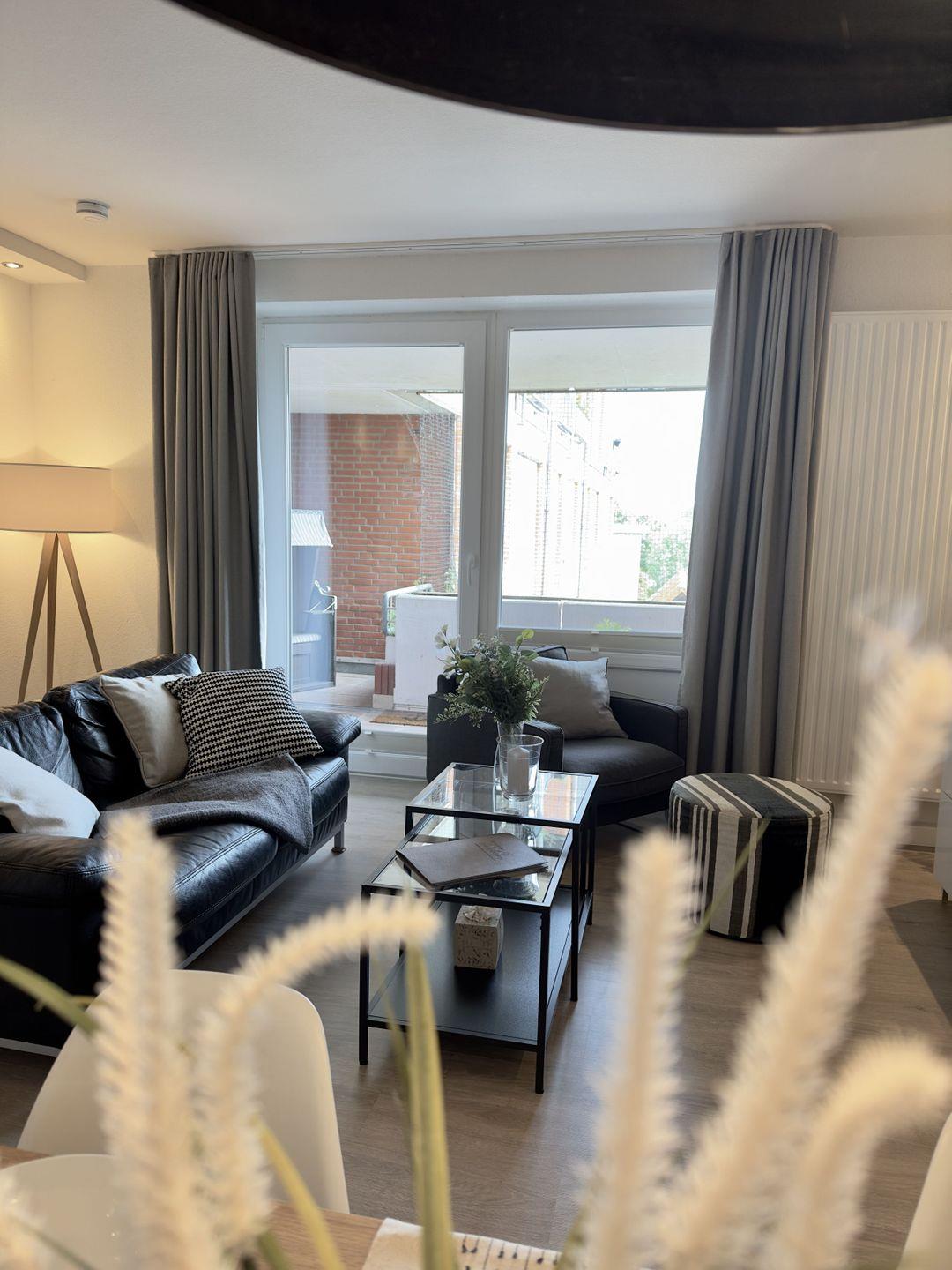 3-Zimmer Apartment mit großem Balkon mit Meerblick für bis zu 4 Personen, strandnah am Ortskern gelegen. Der große, überdachte Balkon mit Blick auf die 200m entfernte Nordsee lädt ein, bis zum Abend des wohltuende Meeresklima und die Sonne zu genießen.