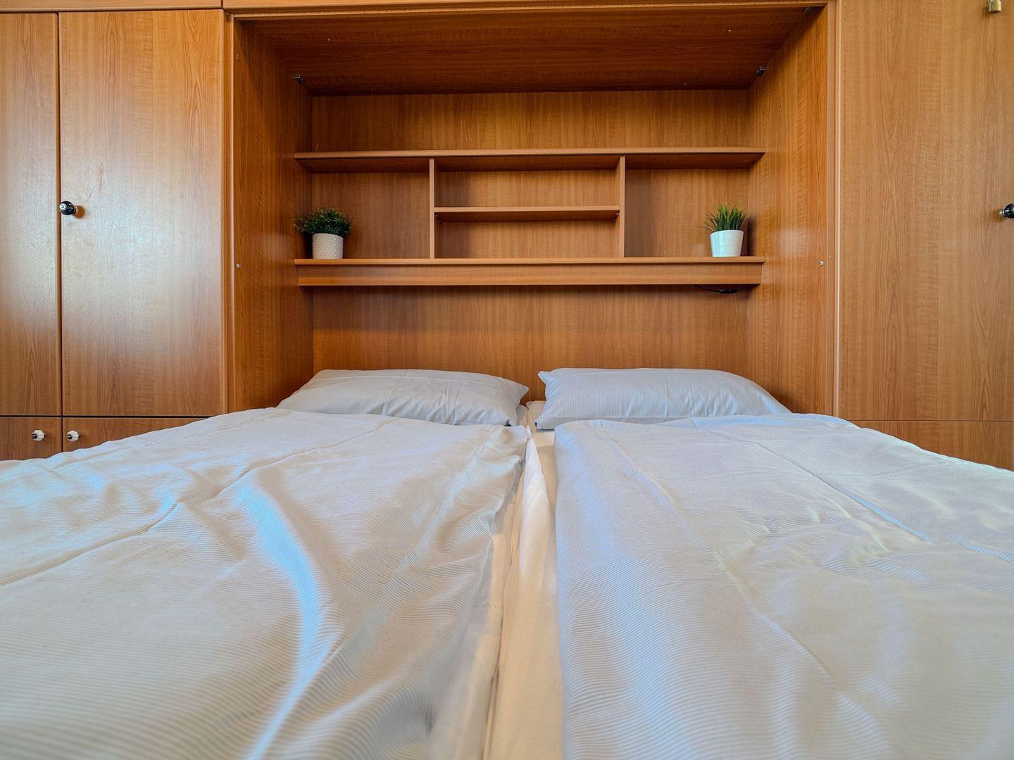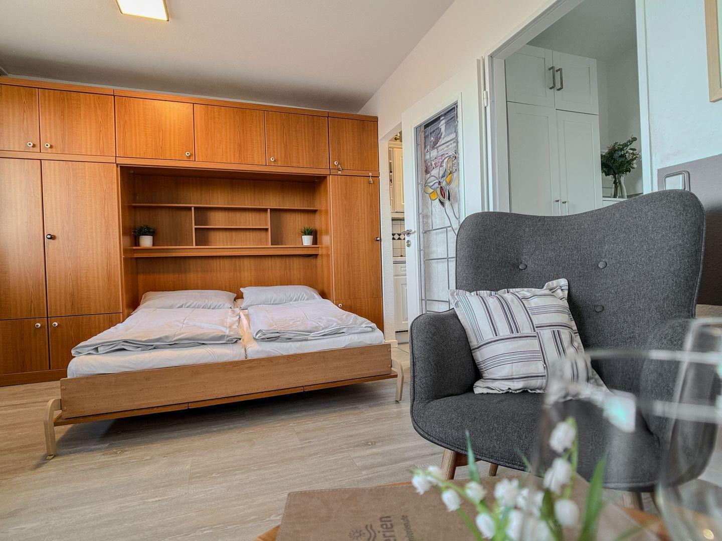 Nachts verwandelt sich der Wohnbereich in einen gemütlichen Schlafplatz: Das praktische Schrankbett bietet Komfort und verschwindet tagsüber dezent, sodass Ihnen der Raum vollständig zur Verfügung steht. Ein Tresen mit zwei Stühlen lädt zu einem gemütlichen Frühstück ein, während zwei bequeme Sessel zum Verweilen und Fernsehen einladen.