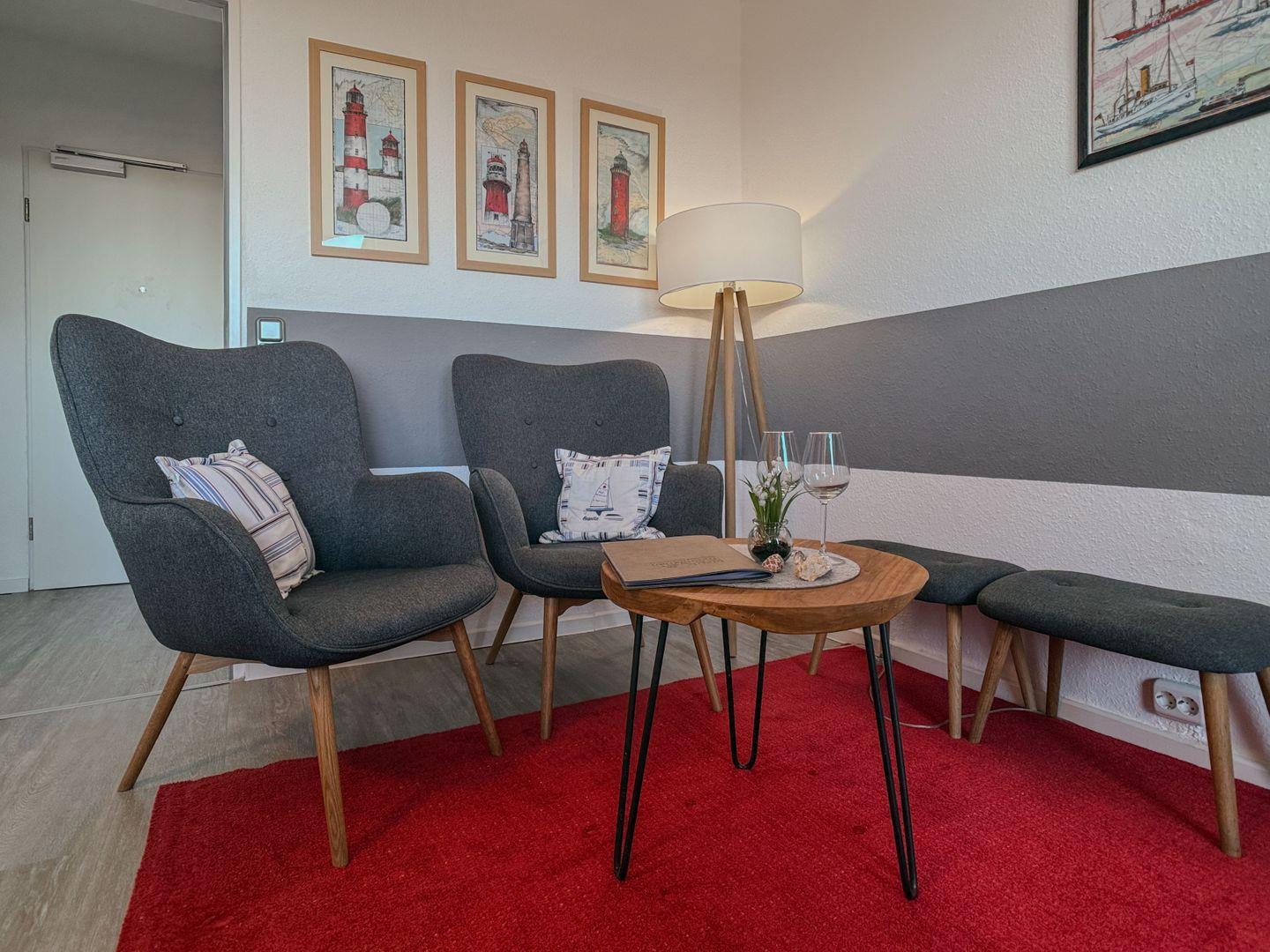 Ein Tresen mit zwei Stühlen lädt zum Frühstück ein, zwei Sessel zum Entspannen. Auf dem großen Balkon genießen Sie gemeinsame Stunden im Strandkorb.