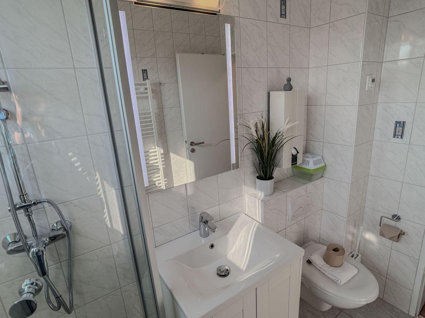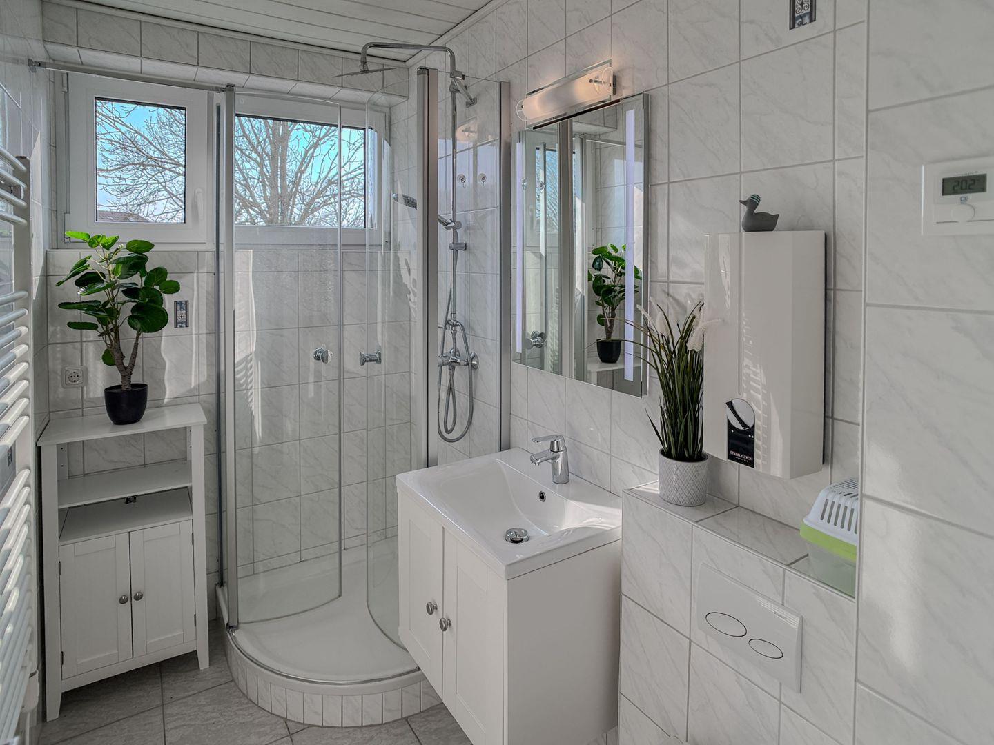 Das helle, freundliche Tageslichtbadezimmer sorgt für Wohlbefinden und Platz für Ihre persönliche Pflege. Der überdachte Balkon bietet einen herrlichen Blick ins Grüne, perfekt für erholsame Stunden. Auch Ihre vierbeinigen Begleiter können die Natur genießen!