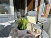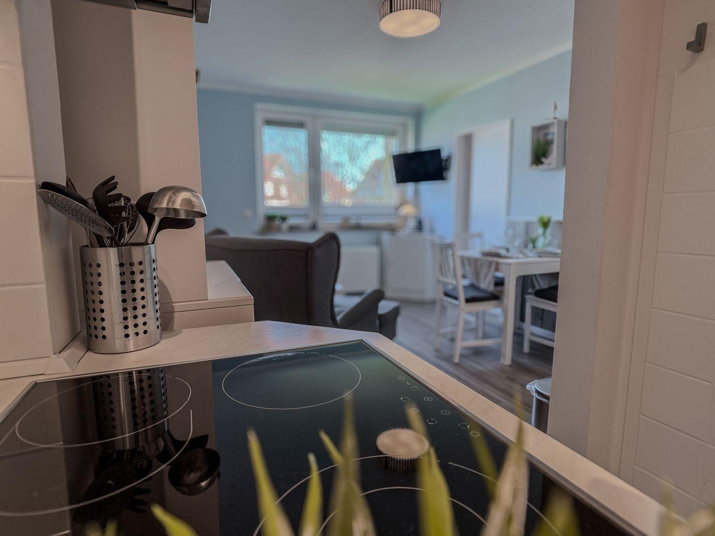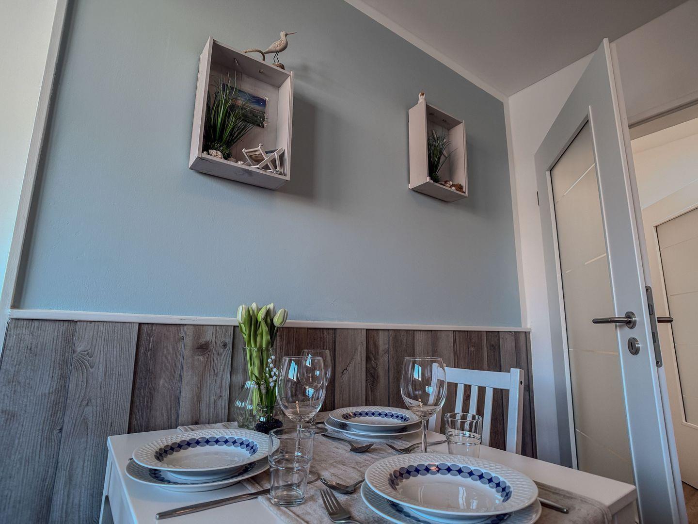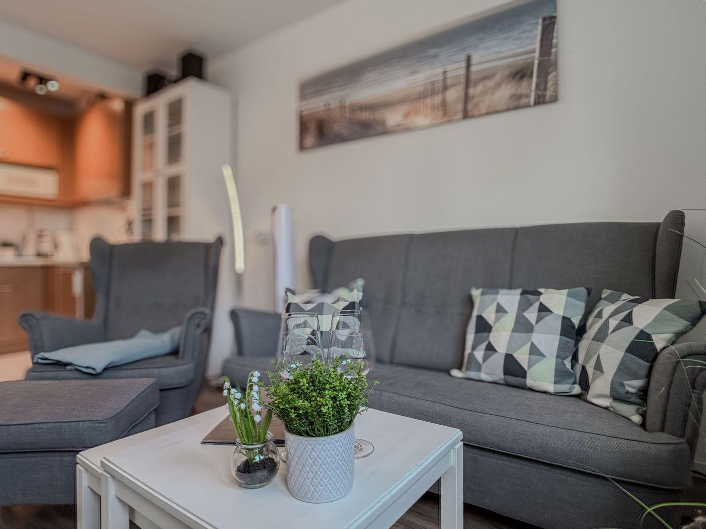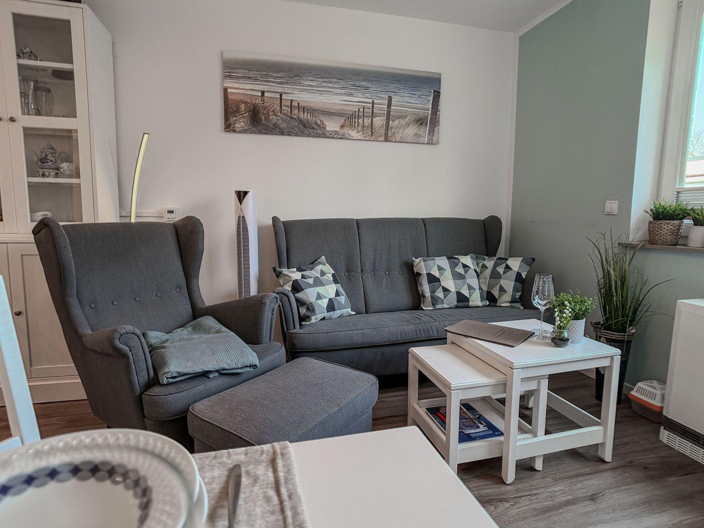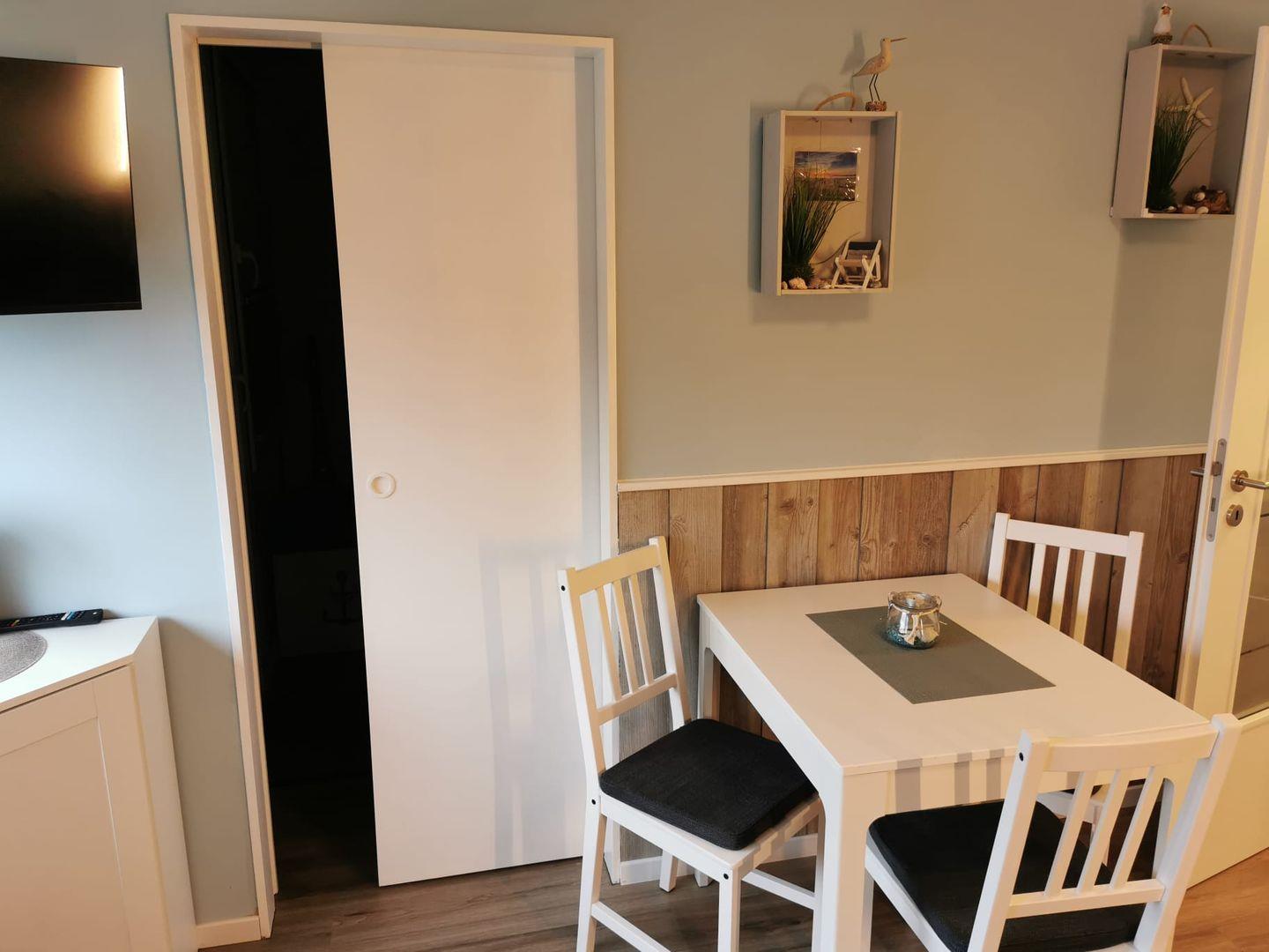 Genießen Sie die ruhige Atmosphäre im Schlafzimmer mit einem komfortablen Boxspringbett, das für erholsamen Schlaf sorgt. Die Holzschiebetür trennt das Schlafzimmer vom Wohnzimmer, das mit einer bequemen Sofa-Ecke und einem Sessel zum Entspannen einlädt. Für Ihre Selbstversorgung ist die kleine Kochnische bestens ausgestattet, und die separate Essgruppe lädt zu gemeinsamen Mahlzeiten ein.